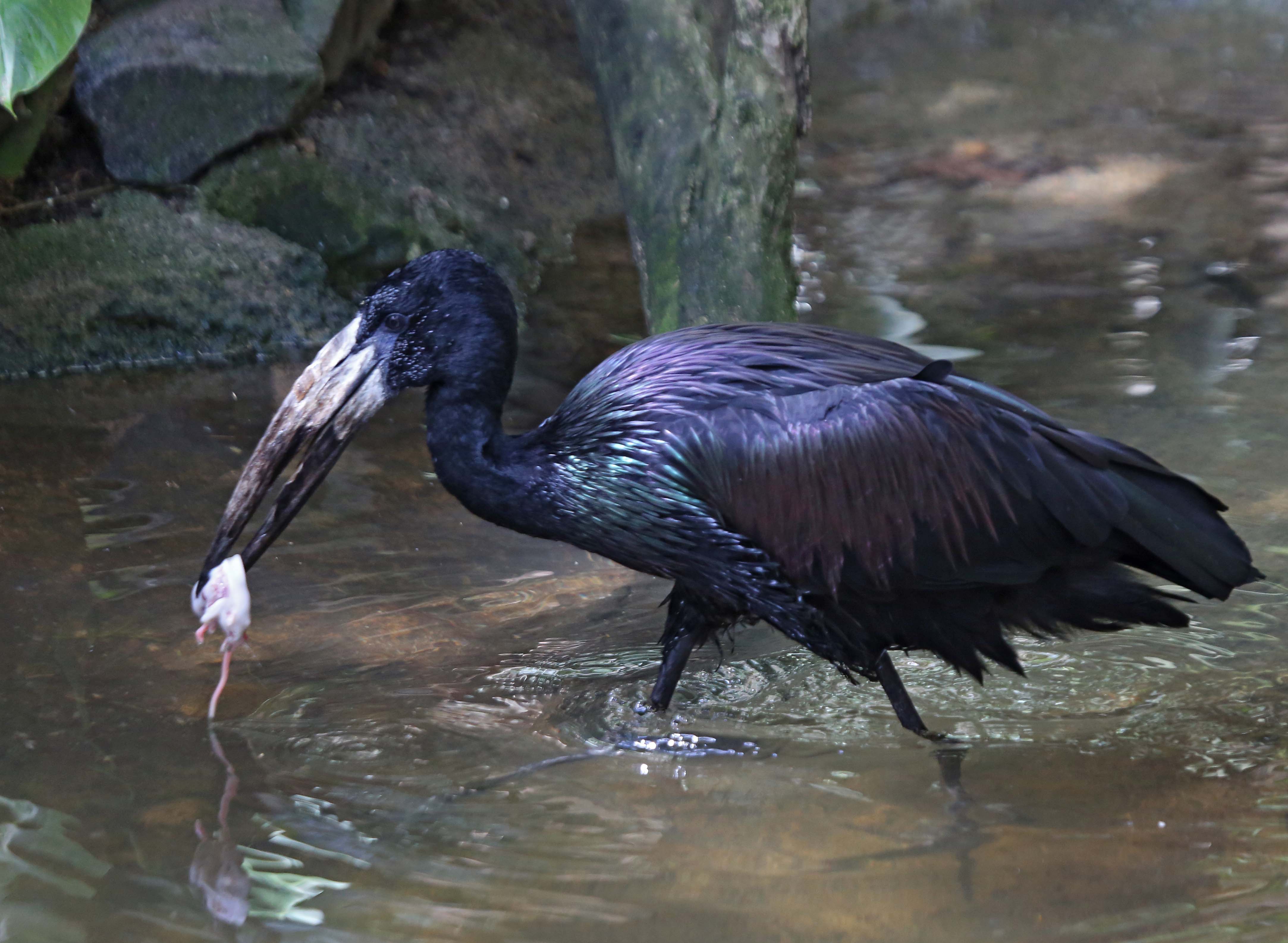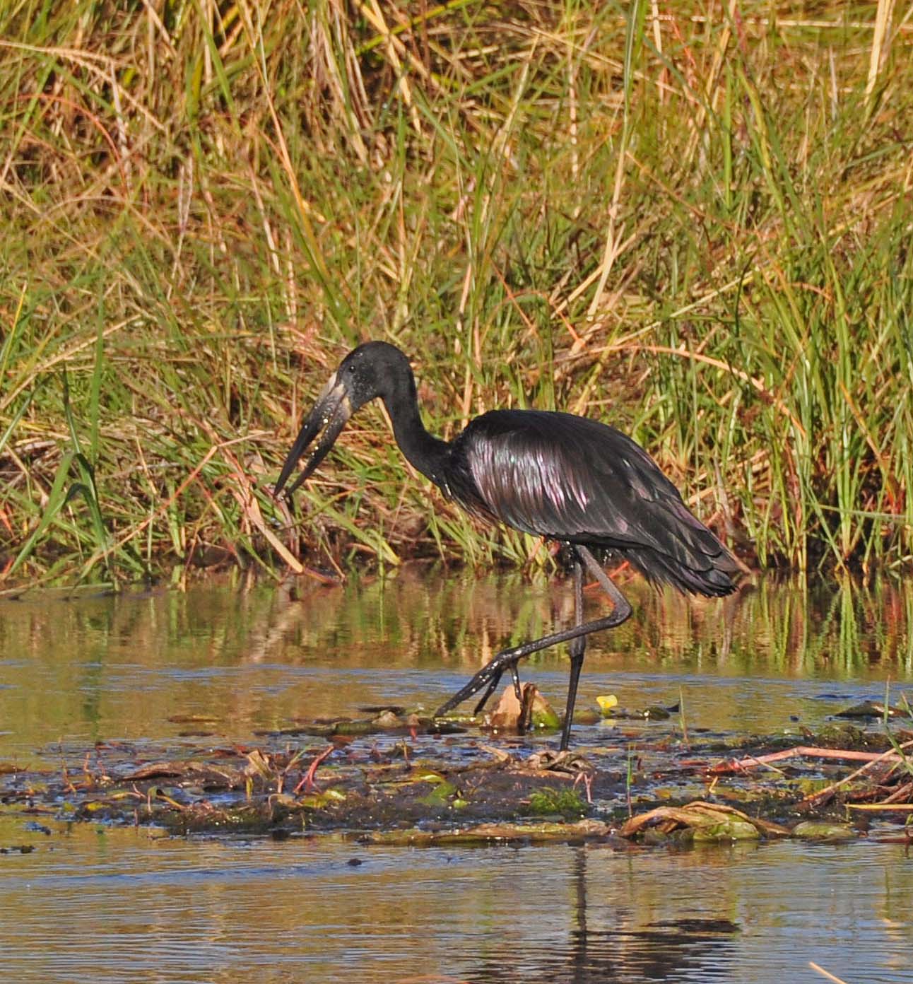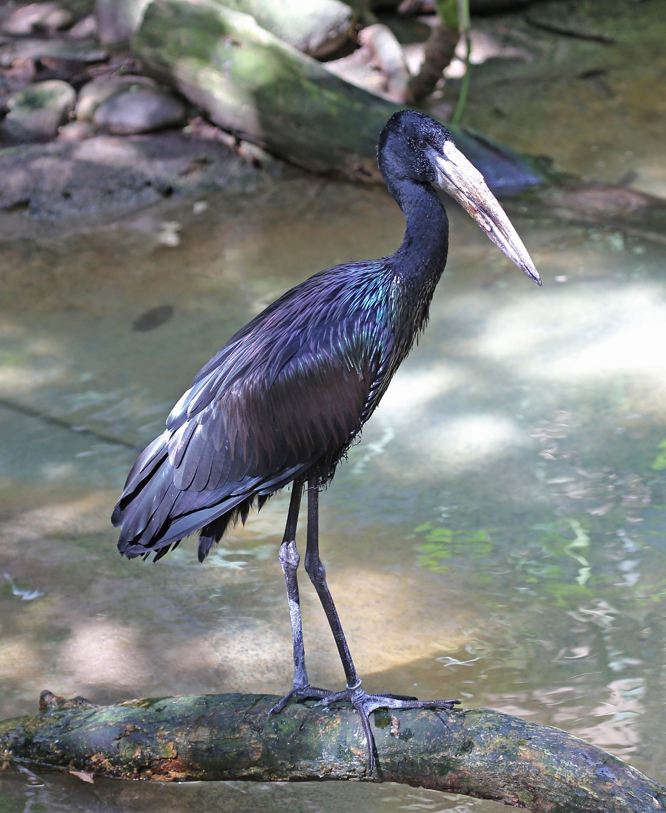 The African Openbill is a small stork that is found in sub-Saharan Africa. The plumage is black with purple and green iridescent highlights. Their iris is brown with a yellow inner ring. The most unique feature is the large brownish bill with a gap that is specifically designed to remove molluscs from their shells. Legs and feet are black with gray eyes. Both sexes are similar in both size and coloration.