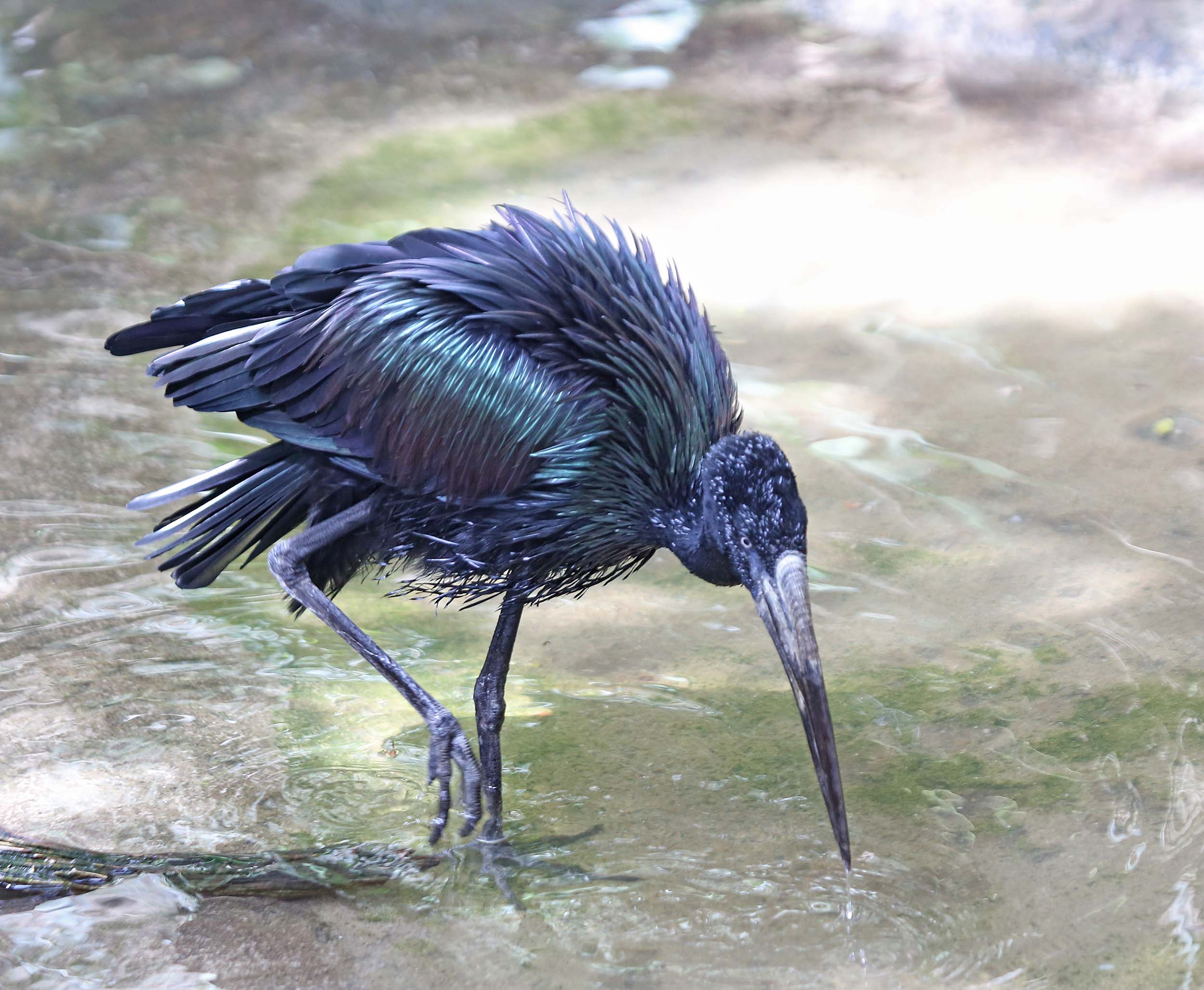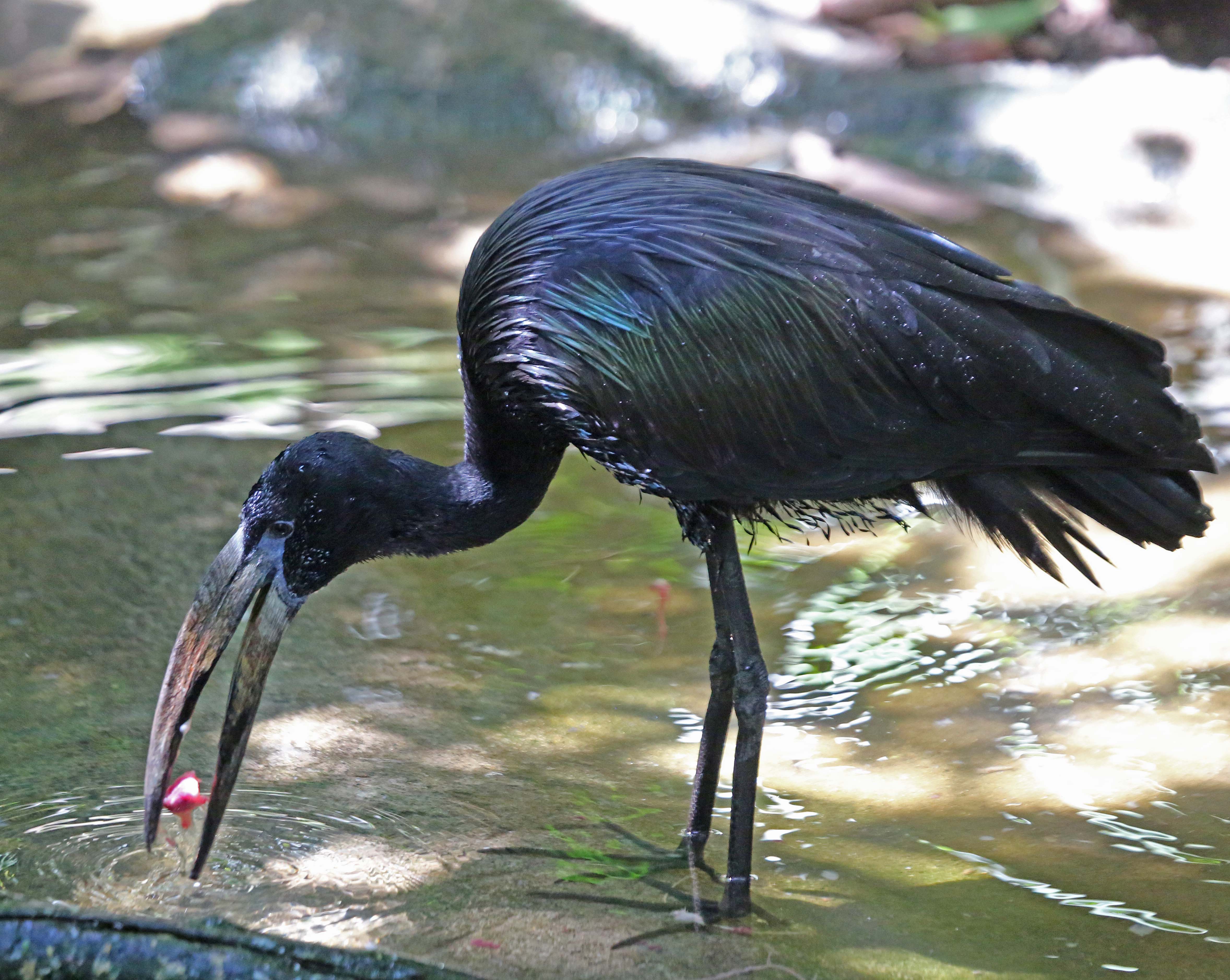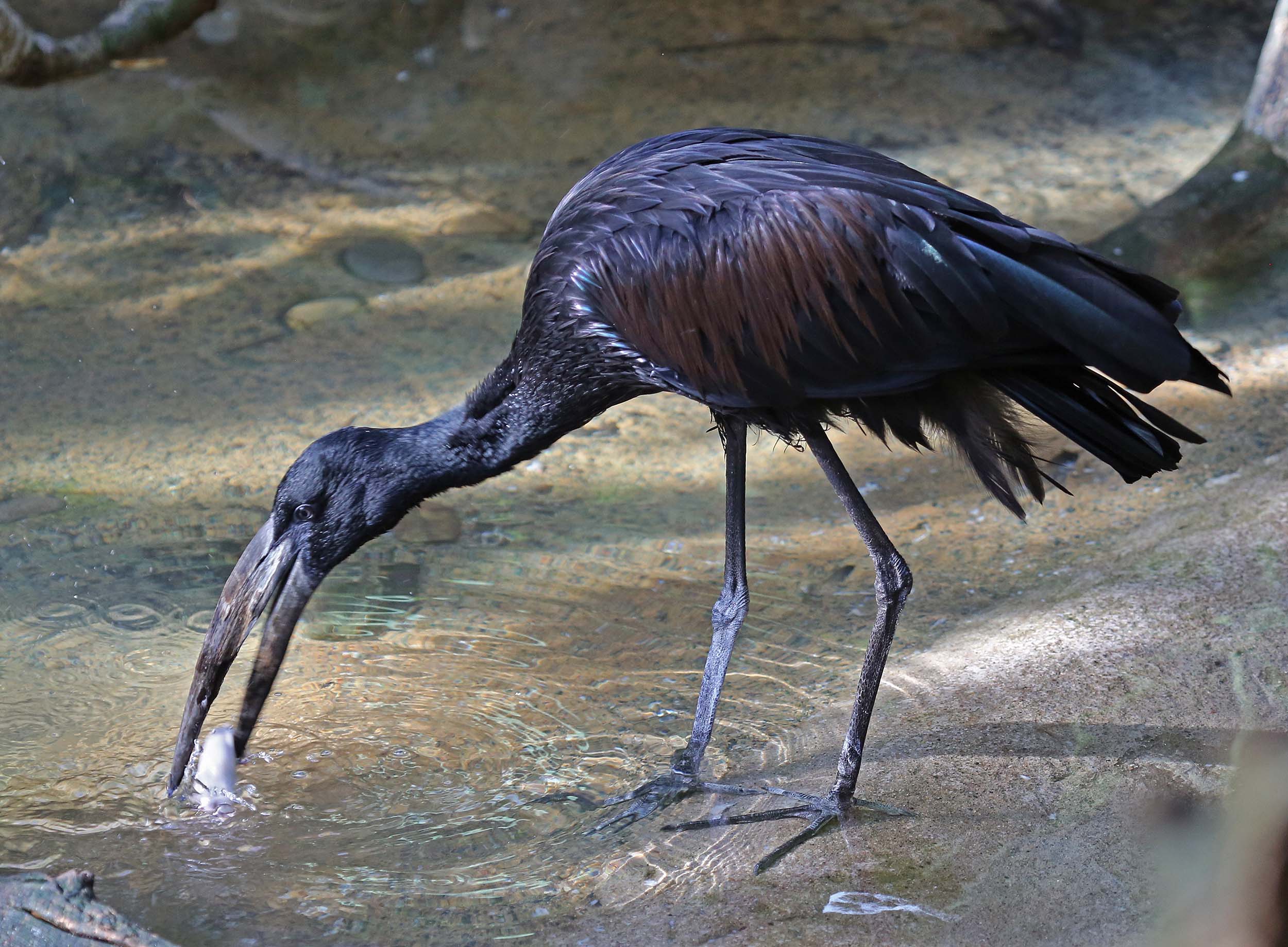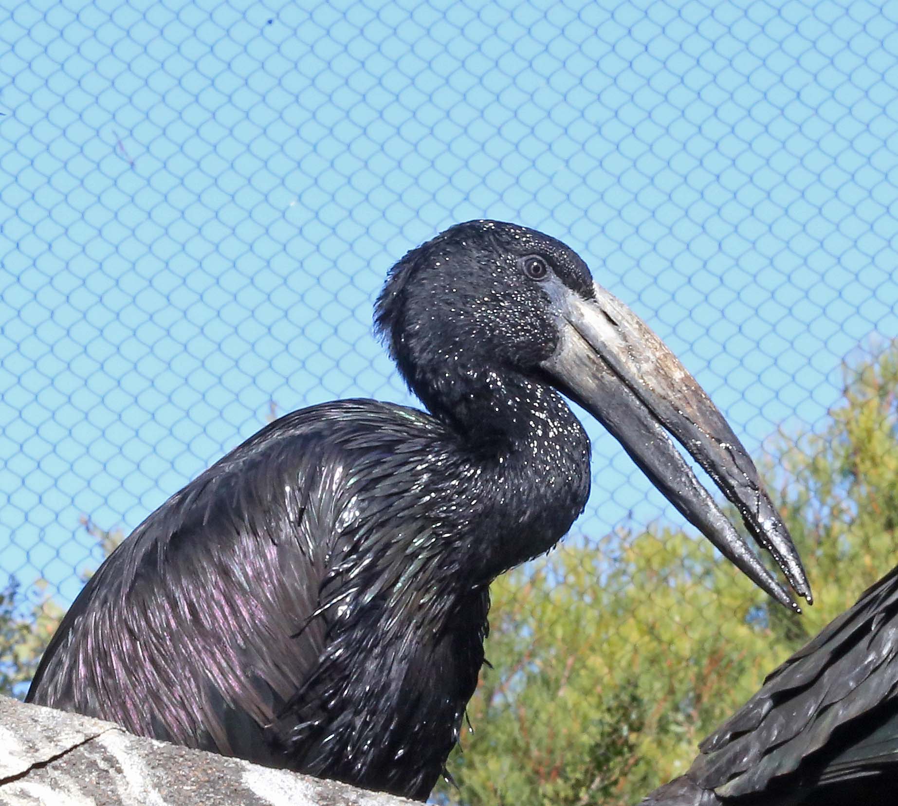 The African Openbill is a small stork that is found in sub-Saharan Africa. The plumage is black with purple and green iridescent highlights. Their iris is brown with a yellow inner ring. The most unique feature is the large brownish bill with a gap that is specifically designed to remove molluscs from their shells. Legs and feet are black with gray eyes. Both sexes are similar in both size and coloration.