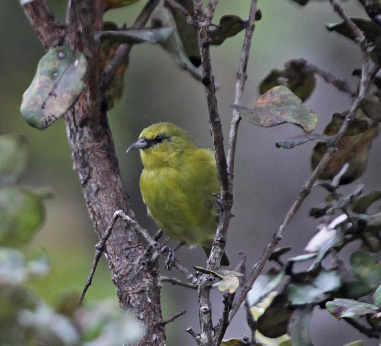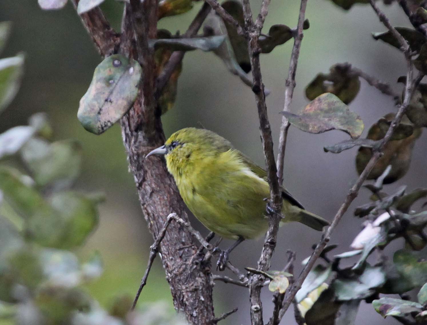 The Hawaiian `Amakihi is a small yellowish-green bird with a relatively short decurved bill. They have brown eyes with black pupils and black lores. The female tends to be darker.