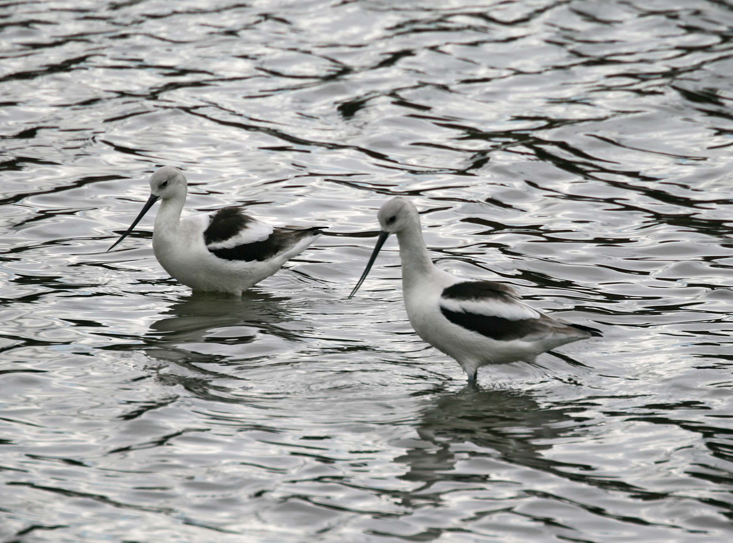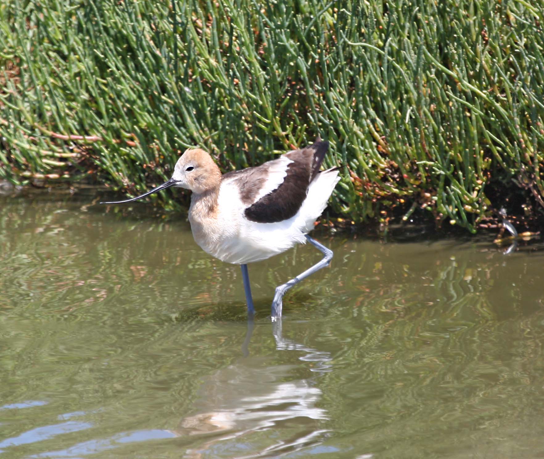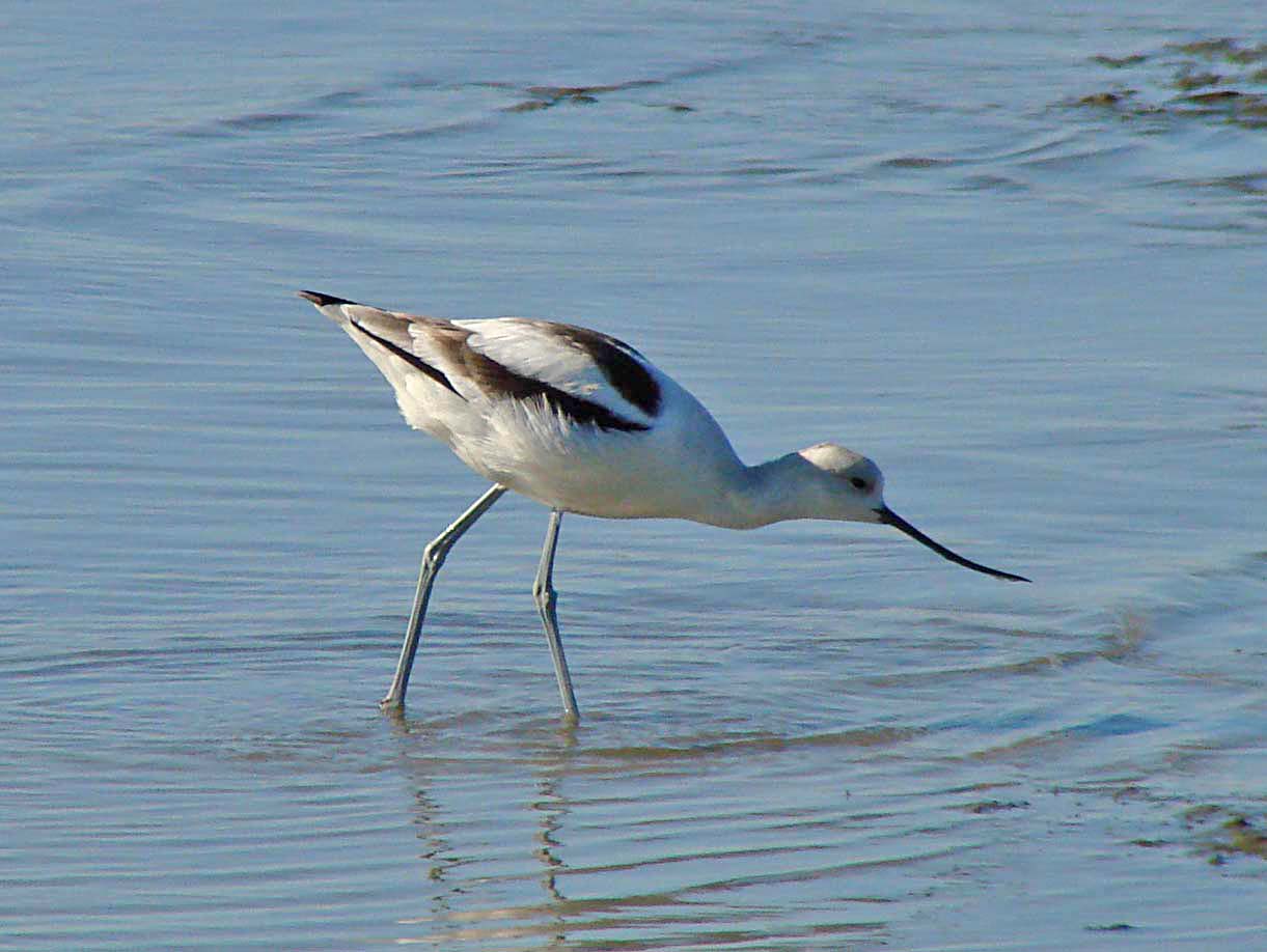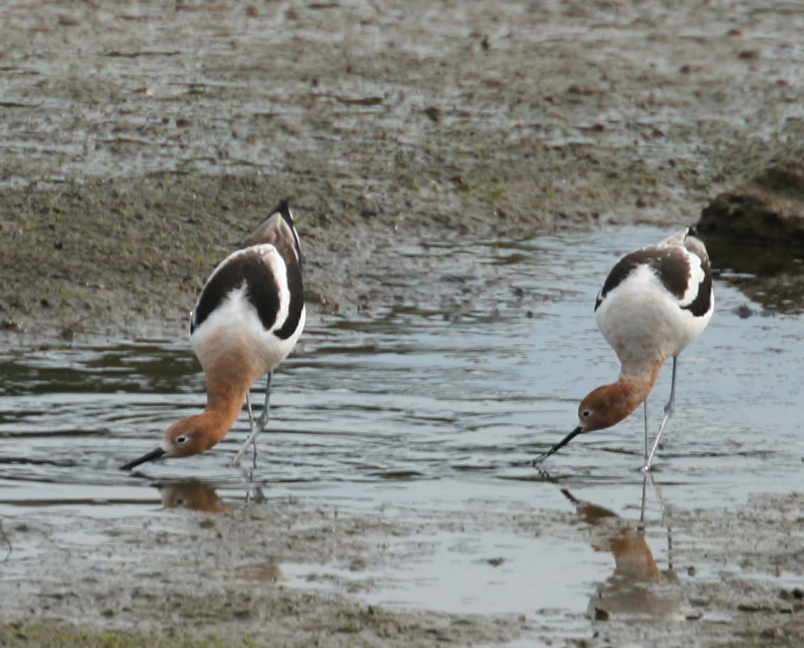 American Avocets swish their long bill from side to side while walking, searching for aquatic invertebrates. The tip of their bill is sensitive to touch. They are fairly common in the S.F. Bay Area.