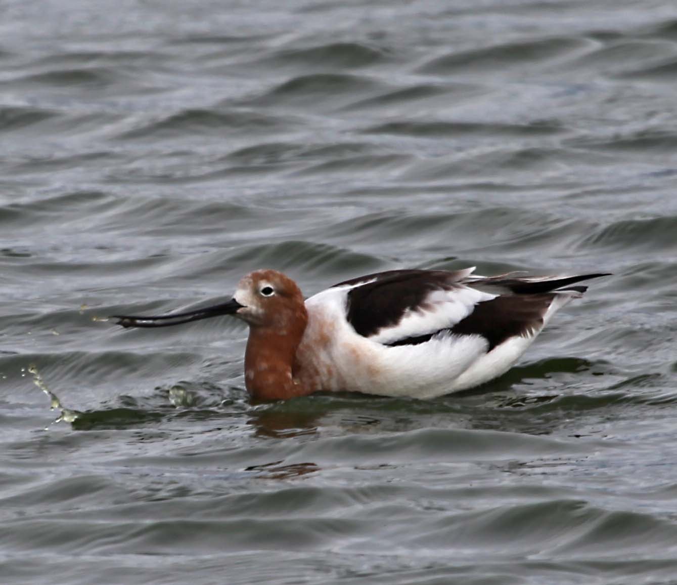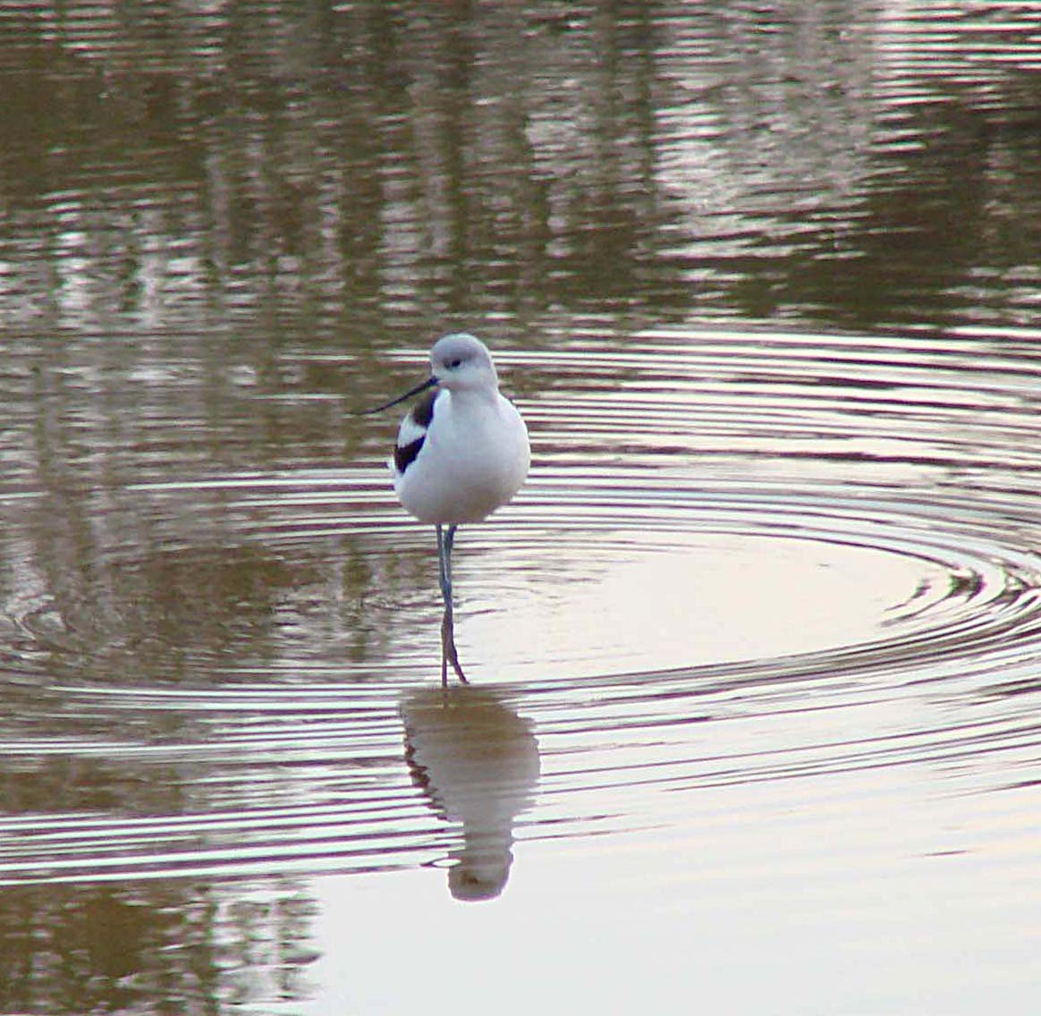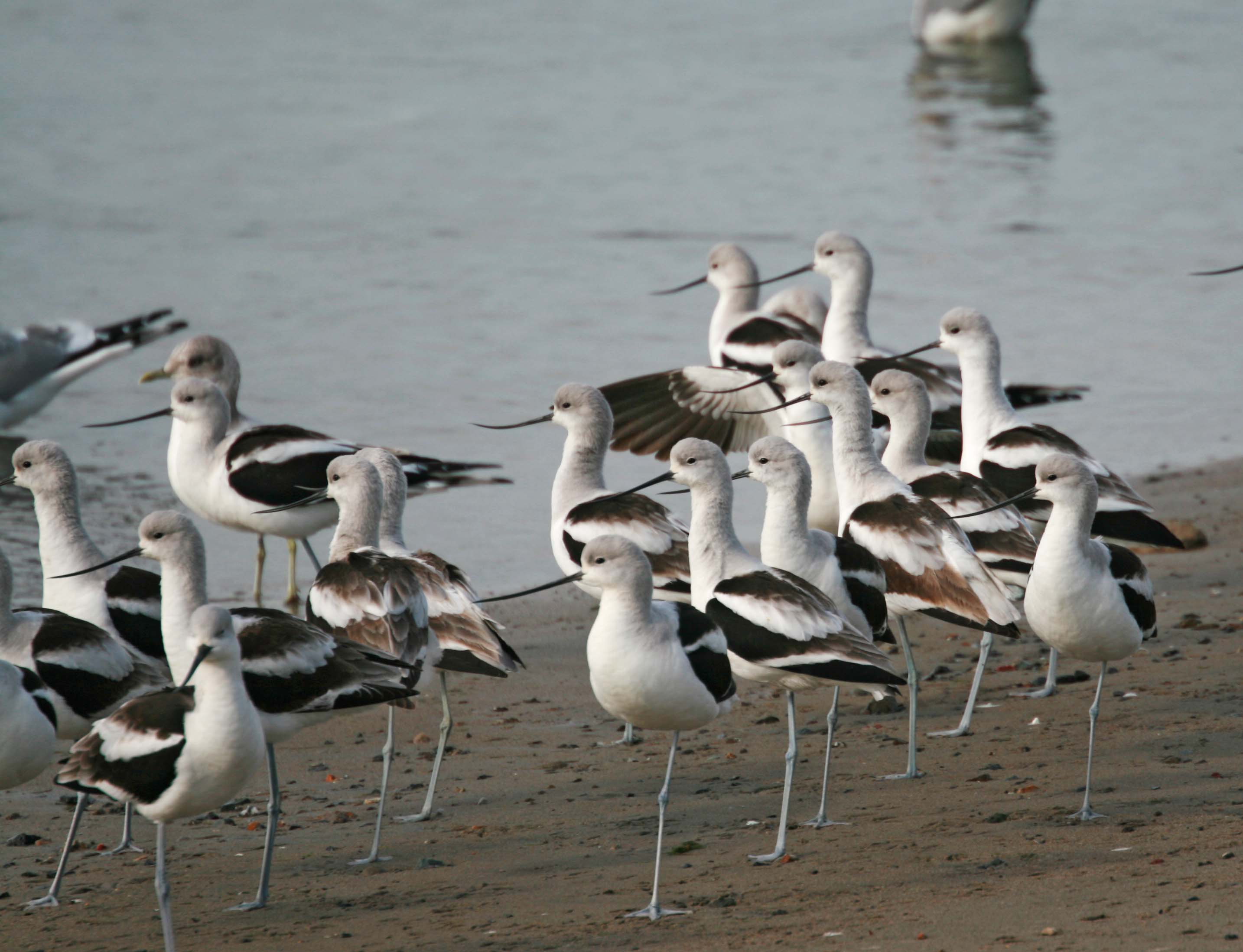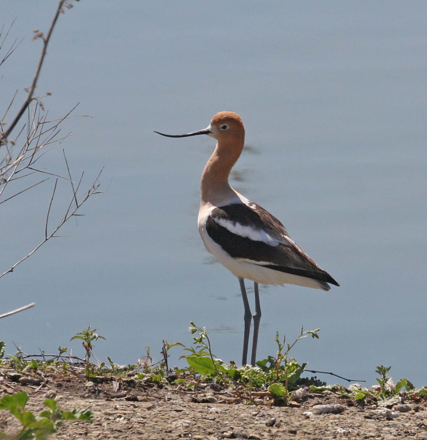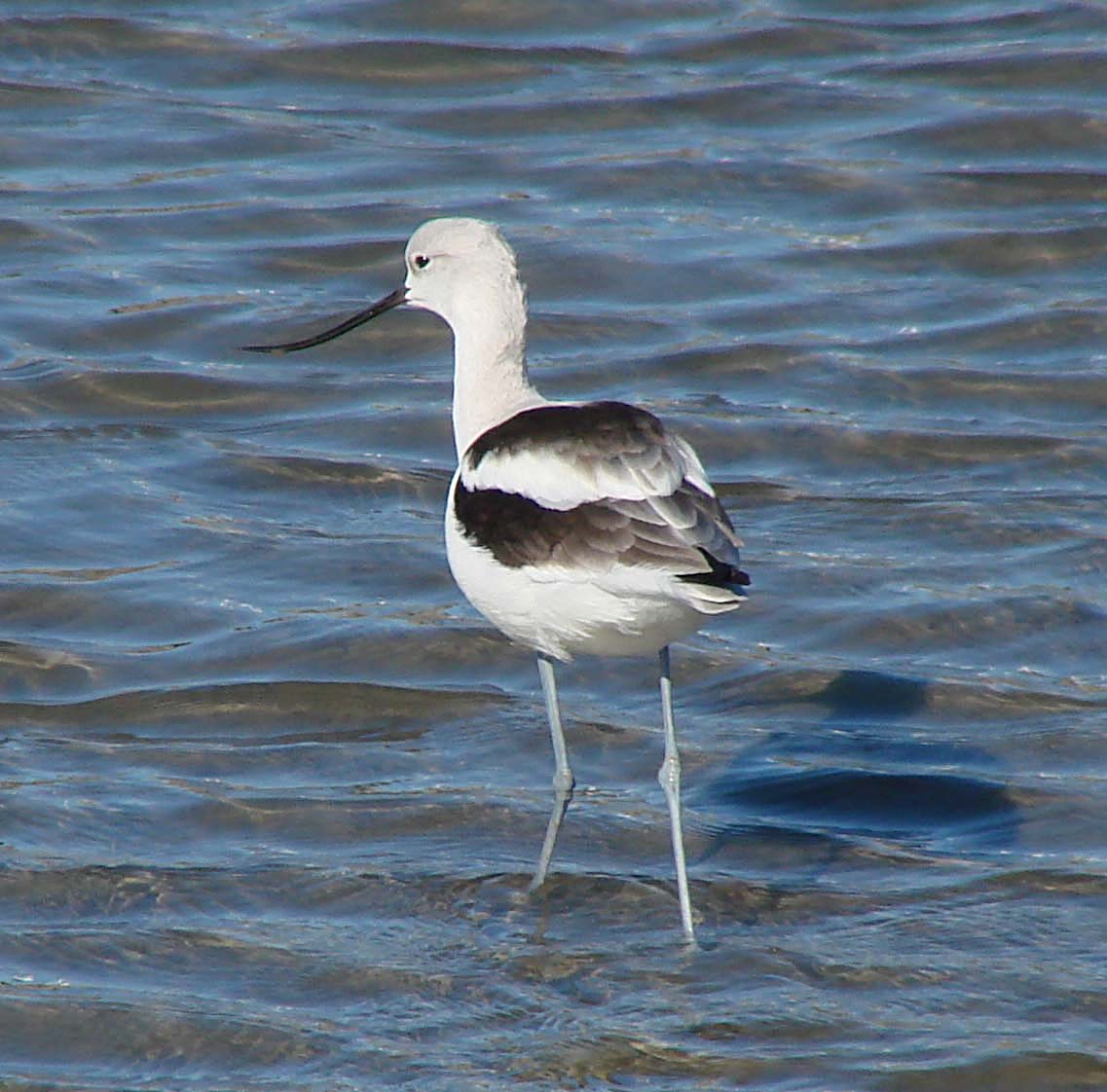 American Avocets swish their long bill from side to side while walking, searching for aquatic invertebrates. The tip of their bill is sensitive to touch. They are fairly common in the S.F. Bay Area.