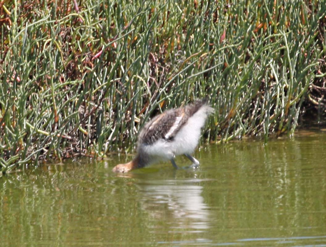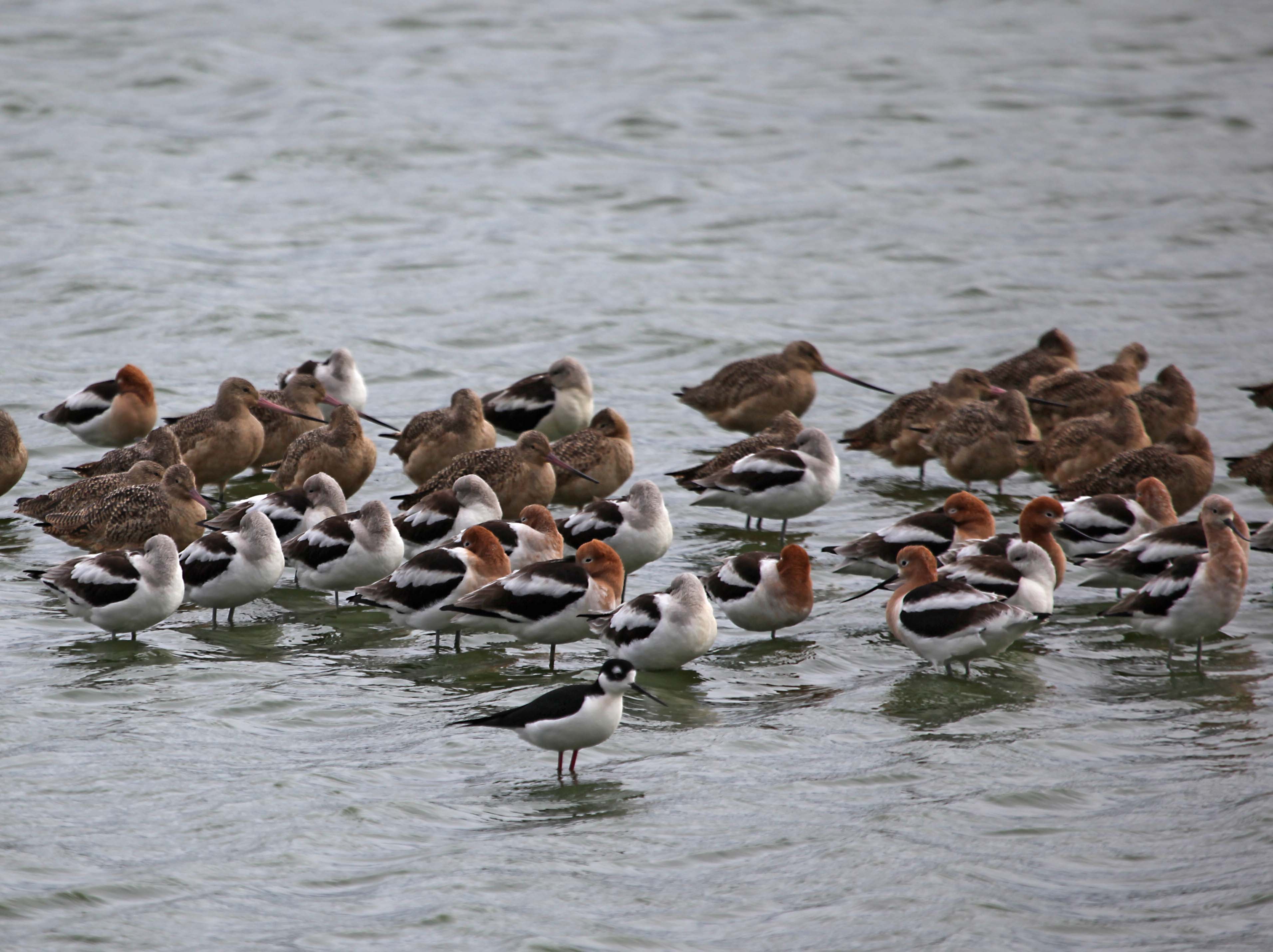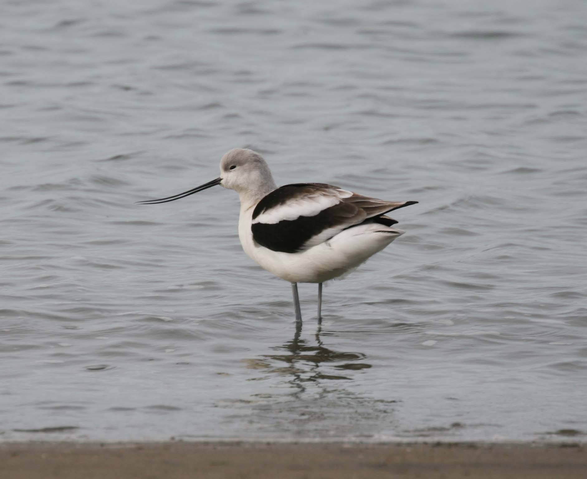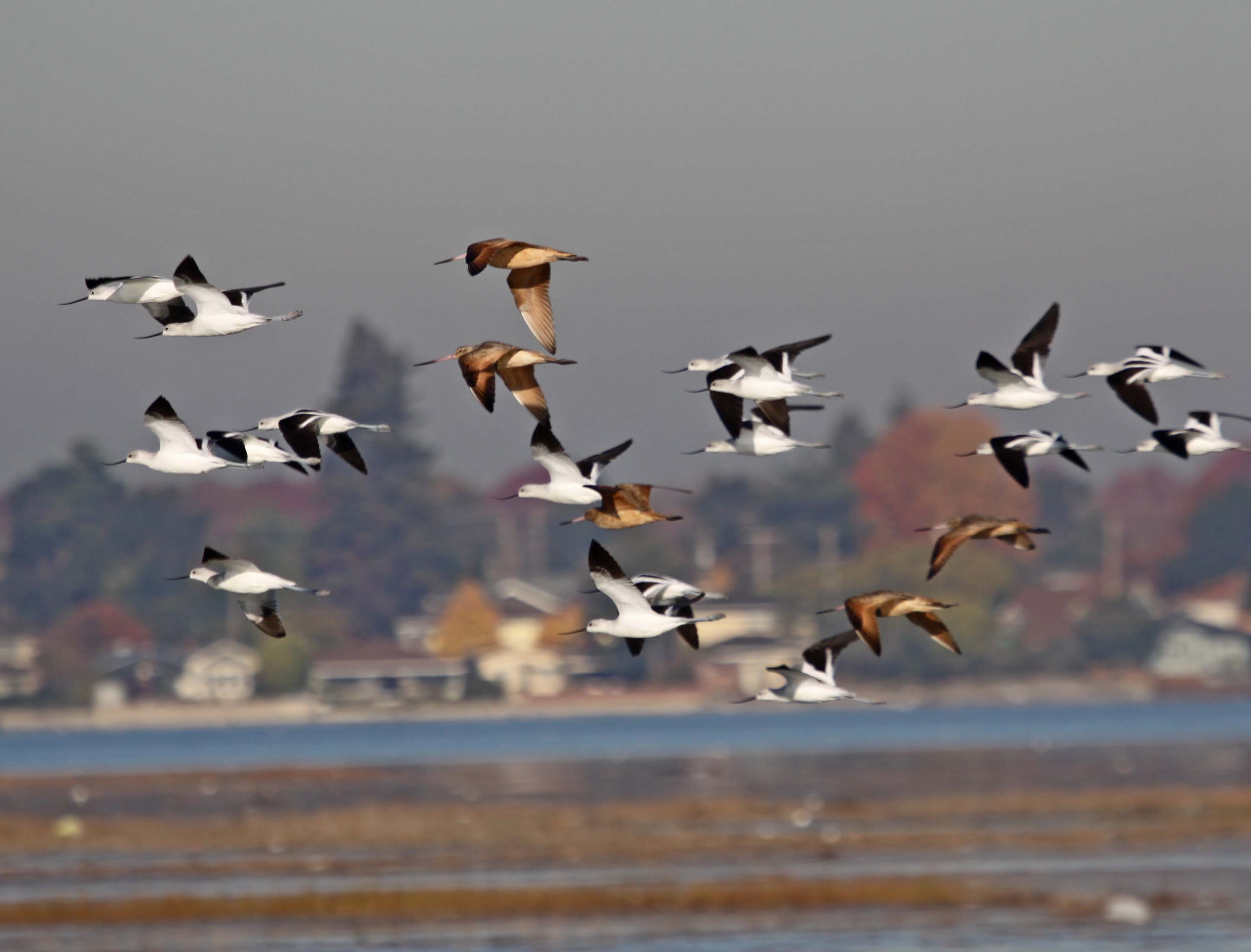 American Avocets swish their long bill from side to side while walking, searching for aquatic invertebrates. The tip of their bill is sensitive to touch. They are fairly common in the S.F. Bay Area.