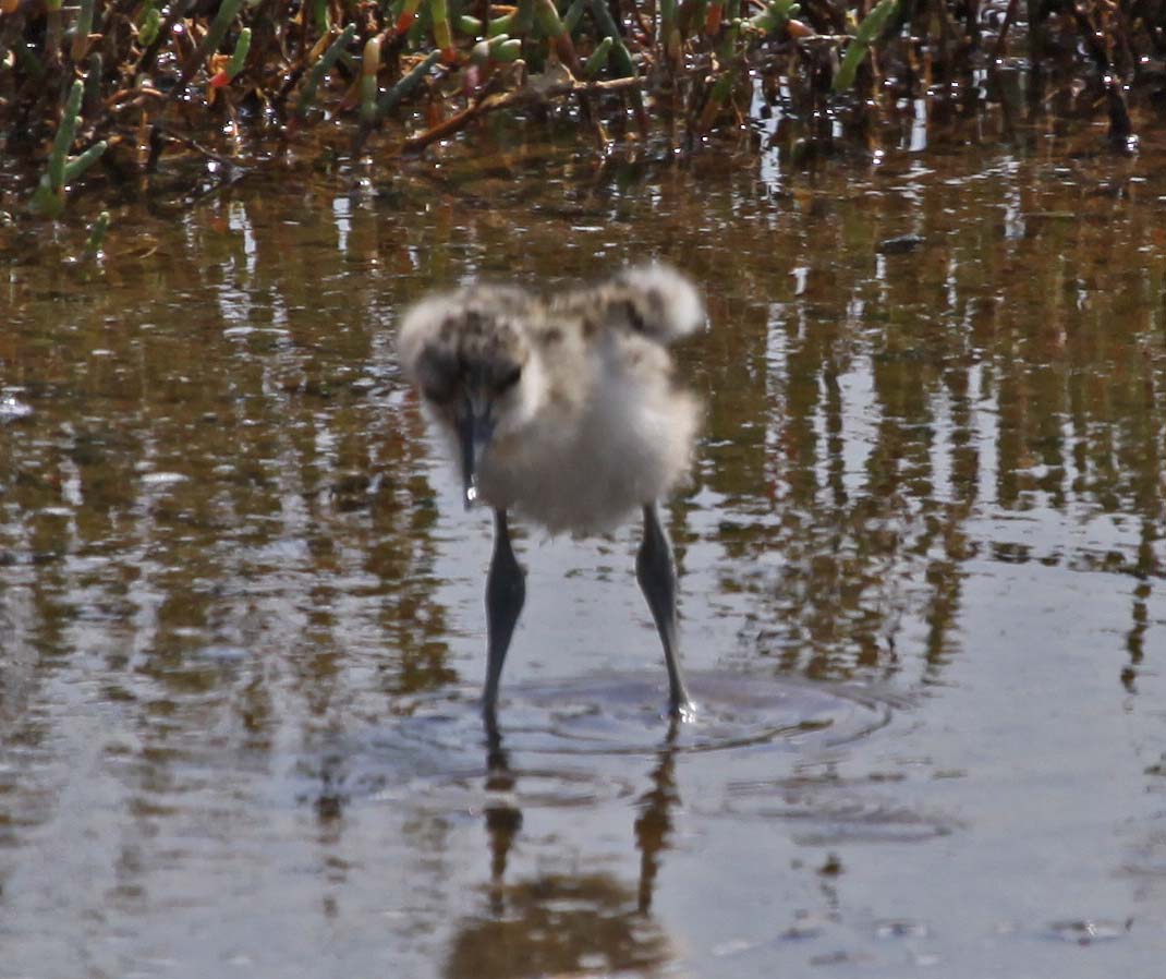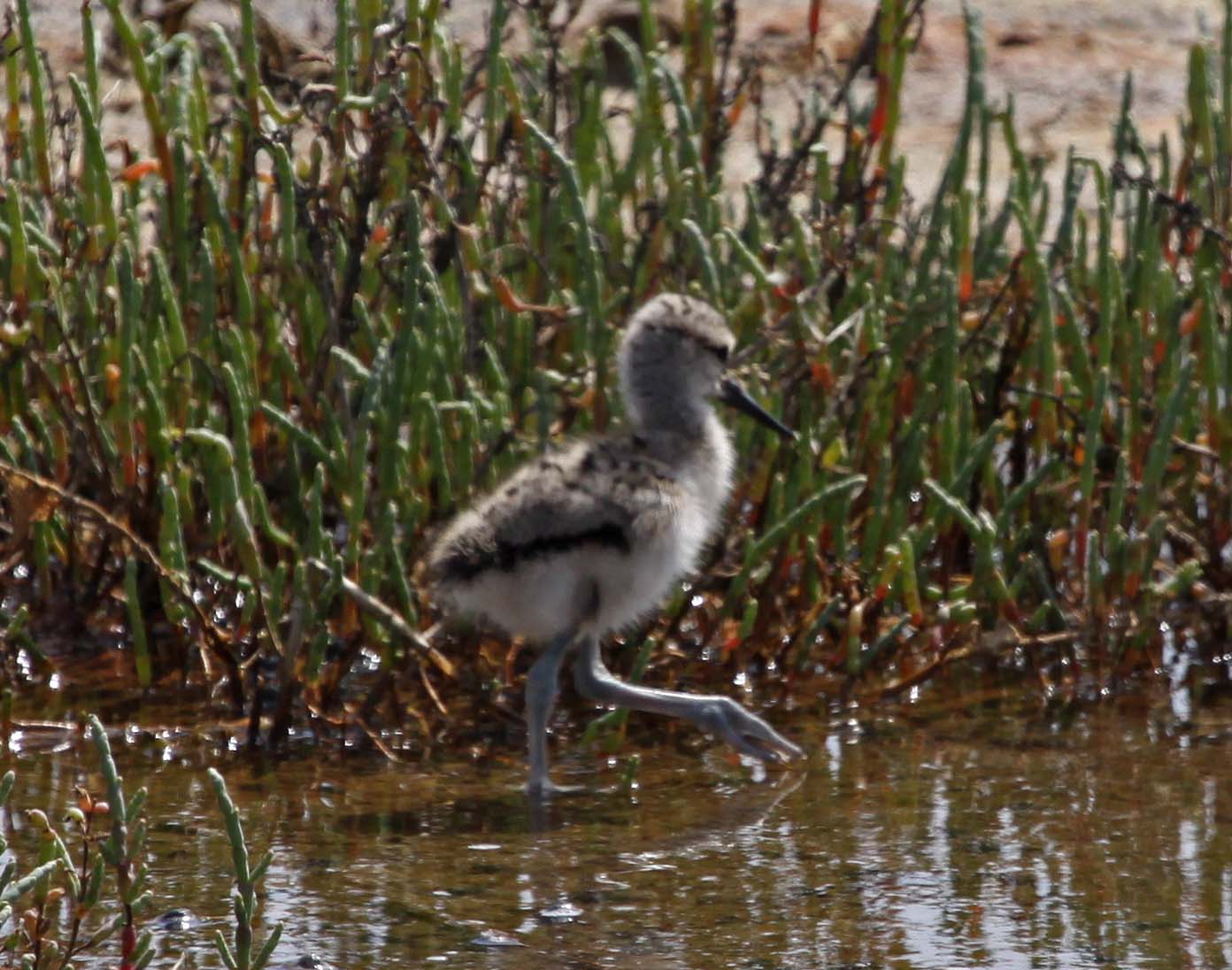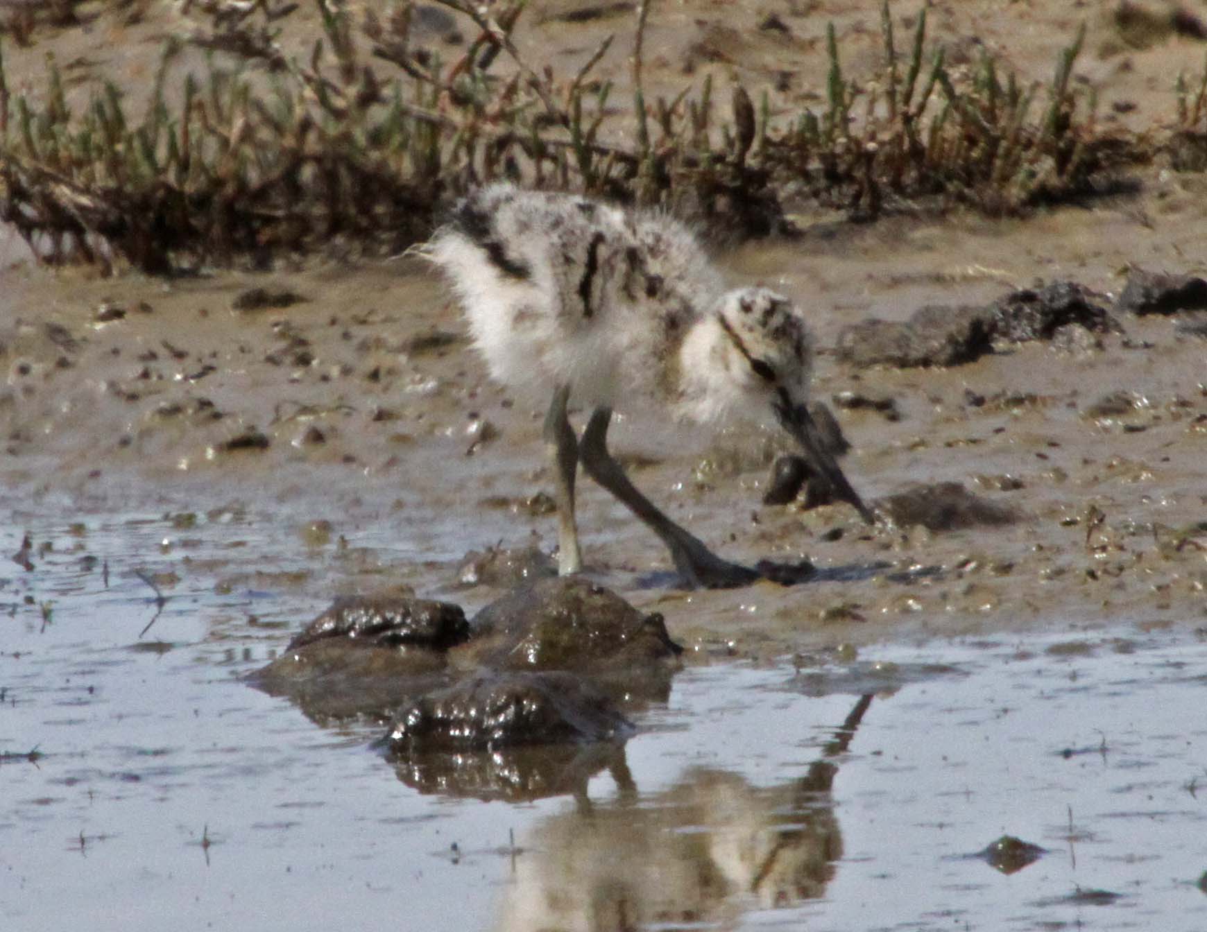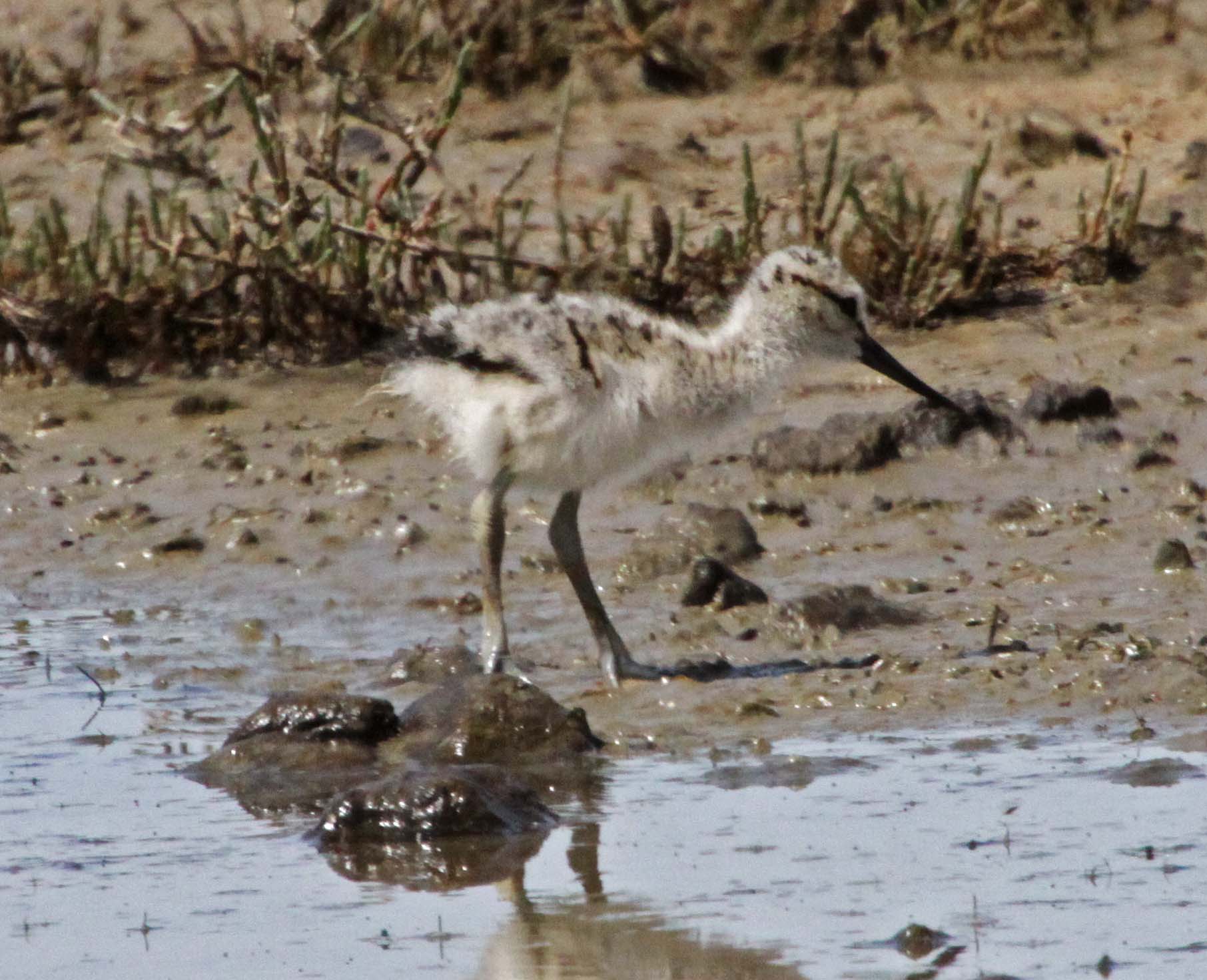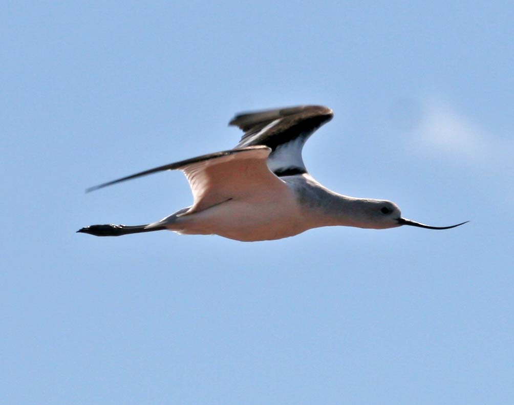 American Avocets swish their long bill from side to side while walking, searching for aquatic invertebrates. The tip of their bill is sensitive to touch. They are fairly common in the S.F. Bay Area.