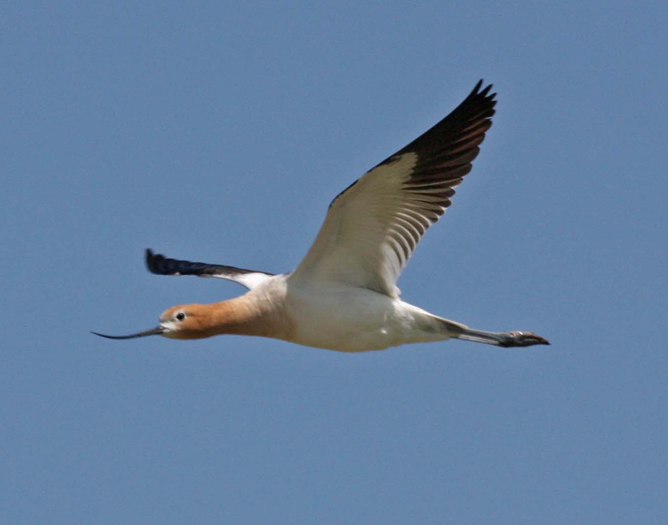 The American Avocet is a North American bird which breeds in the mid-western U.S. and Canada and western U.S. They winter along the southern North American coast and Mexico. American Avocet males and females look similar, but the females are slight smaller and have a shorter and more curved bill. During breeding season their head, neck and breast are cinnamon colored.