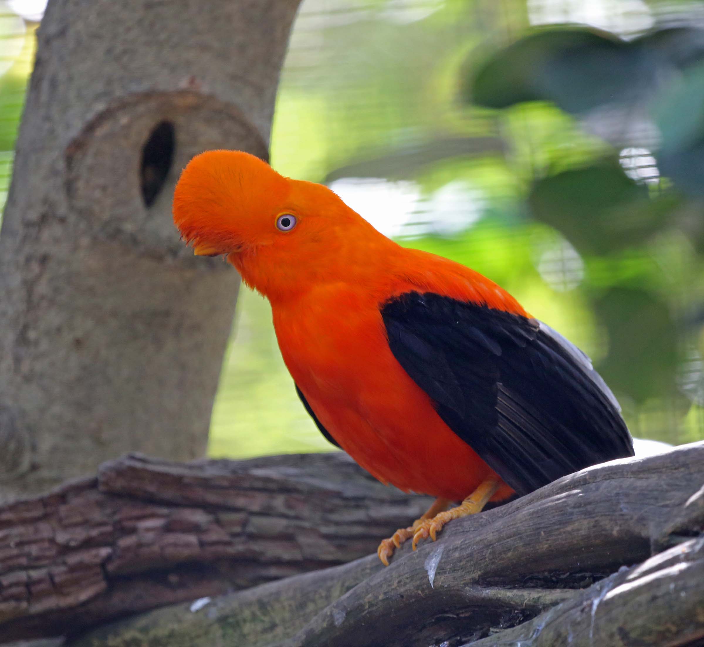 The Andean Cock-of-the-rock is found in the cloud forest of the Andes in Venezuela, Colombia, Ecuador, Peru and Bolivia. They mostly eat fruits and insects but will also eat frogs, lizards and army ants. The sexes are dimorphic and look very different.