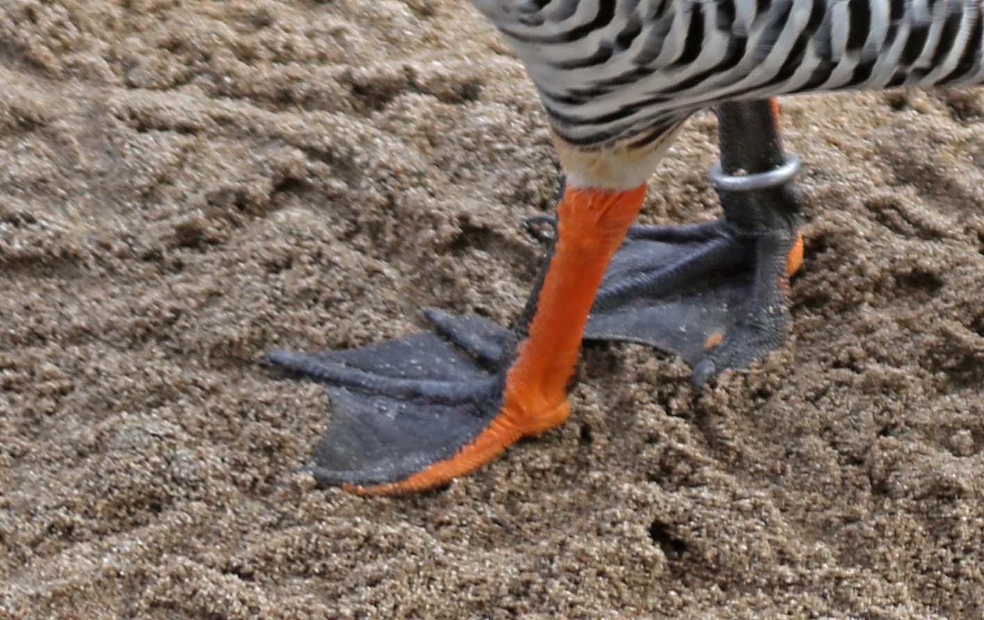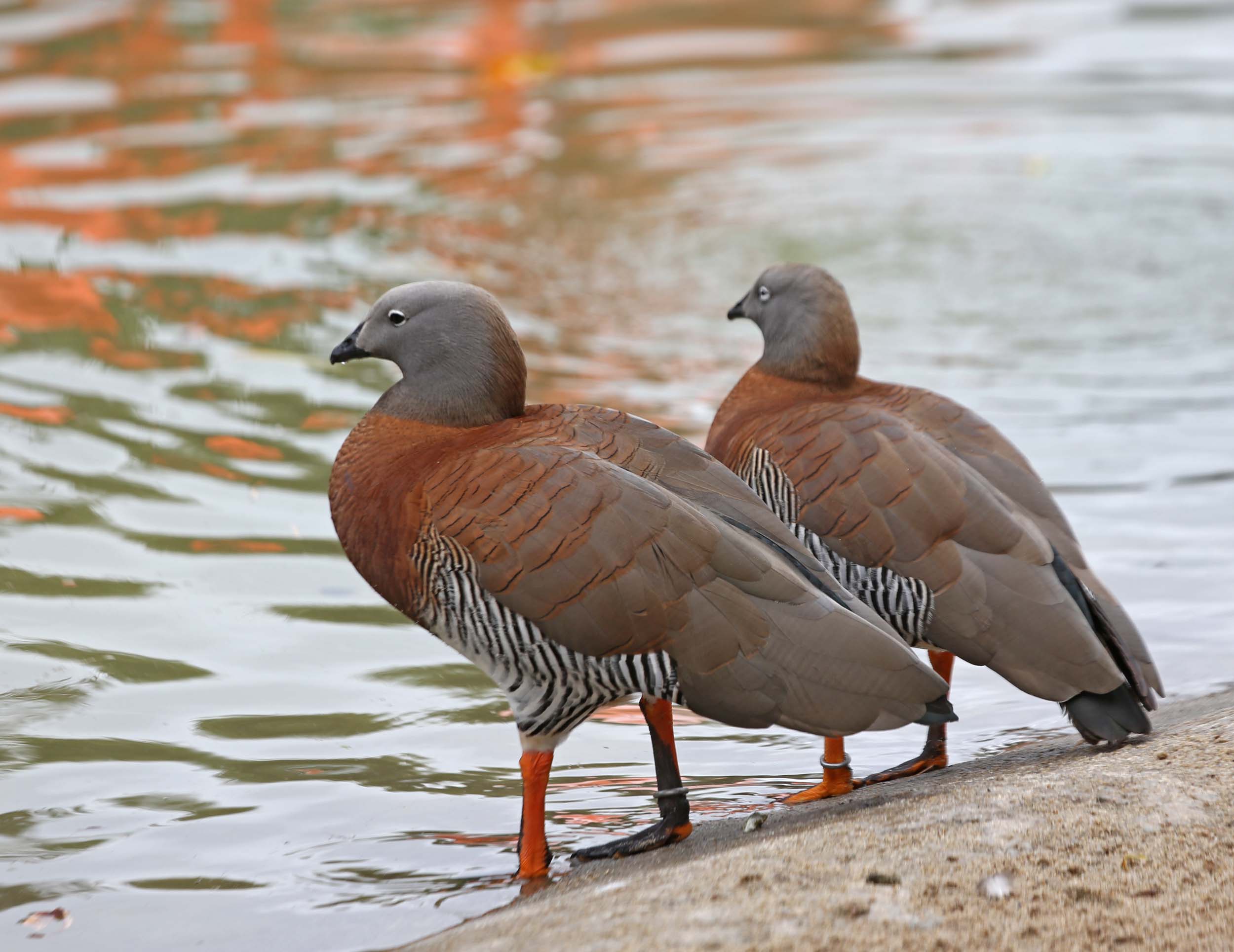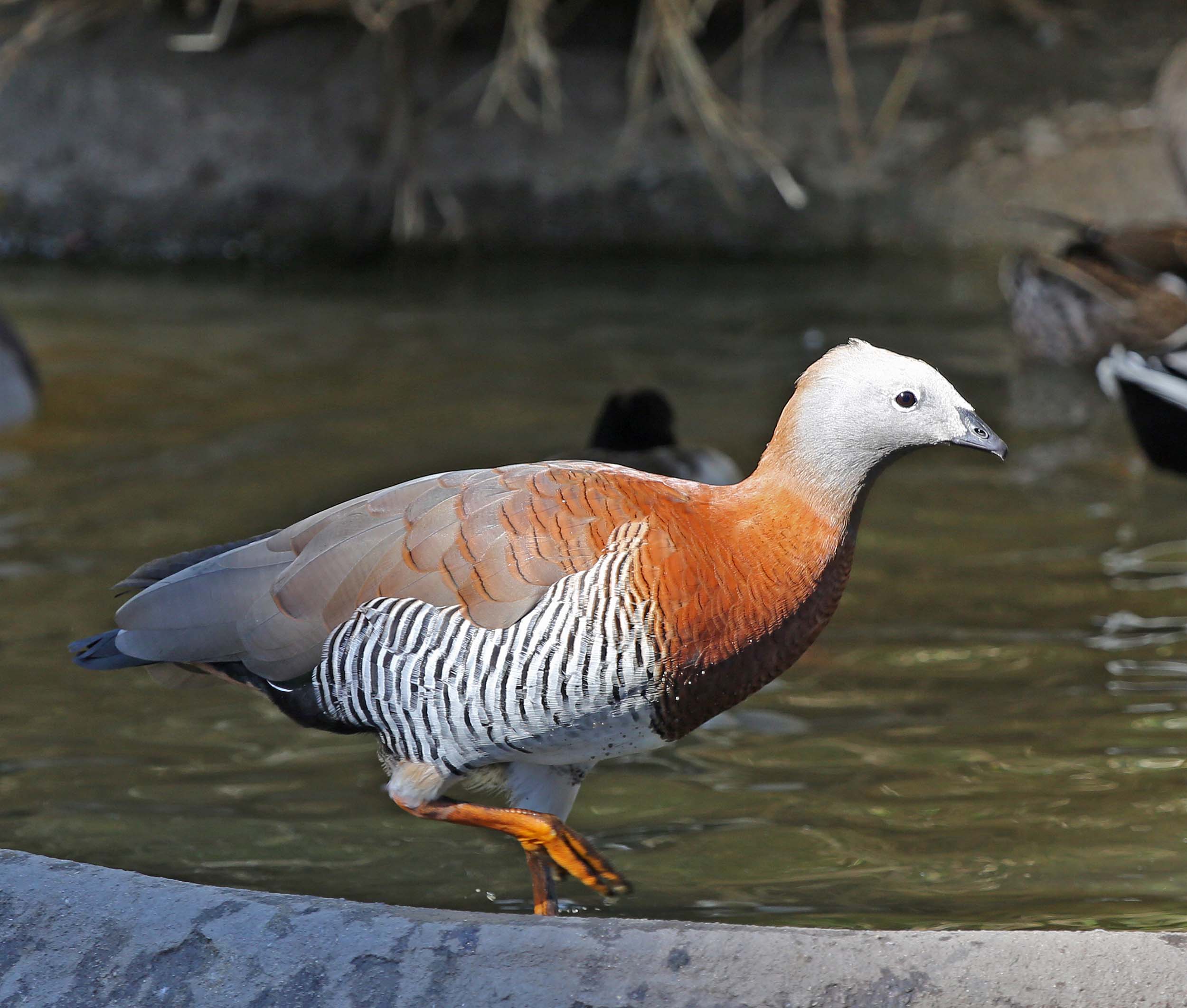 The Ashy-headed Goose is from southern South America. They have a brownish back, chestnut neck, the underparts are white with black bars and they have a grey head. The primary flight feathers are black, the secondary feathers are white, and the greater wing-covers are black, edged with green and white tips. The inside of their legs are black and the outside are a reddish-orange. The eyes and bill are black and the bills has a slight downward curve at the tip.