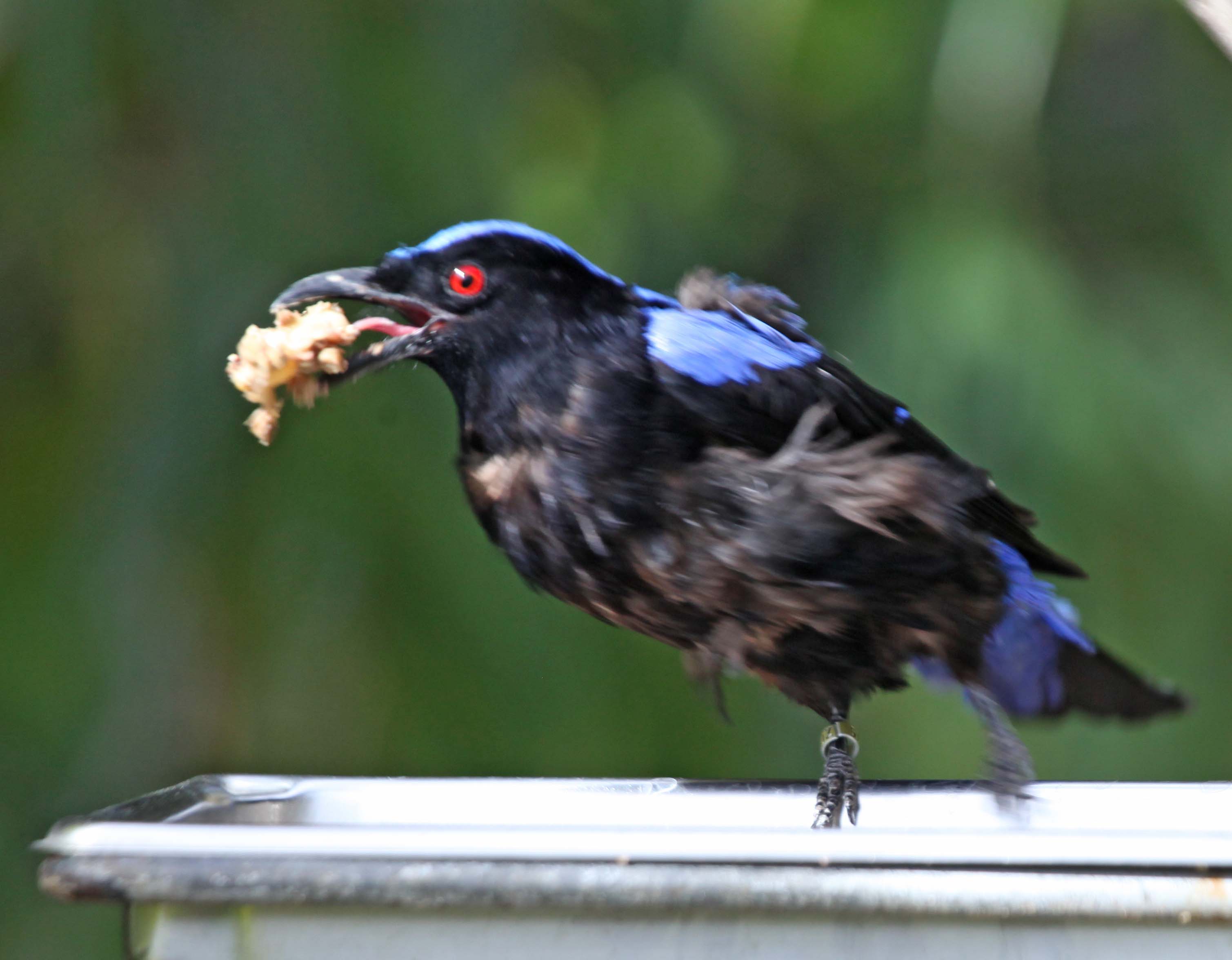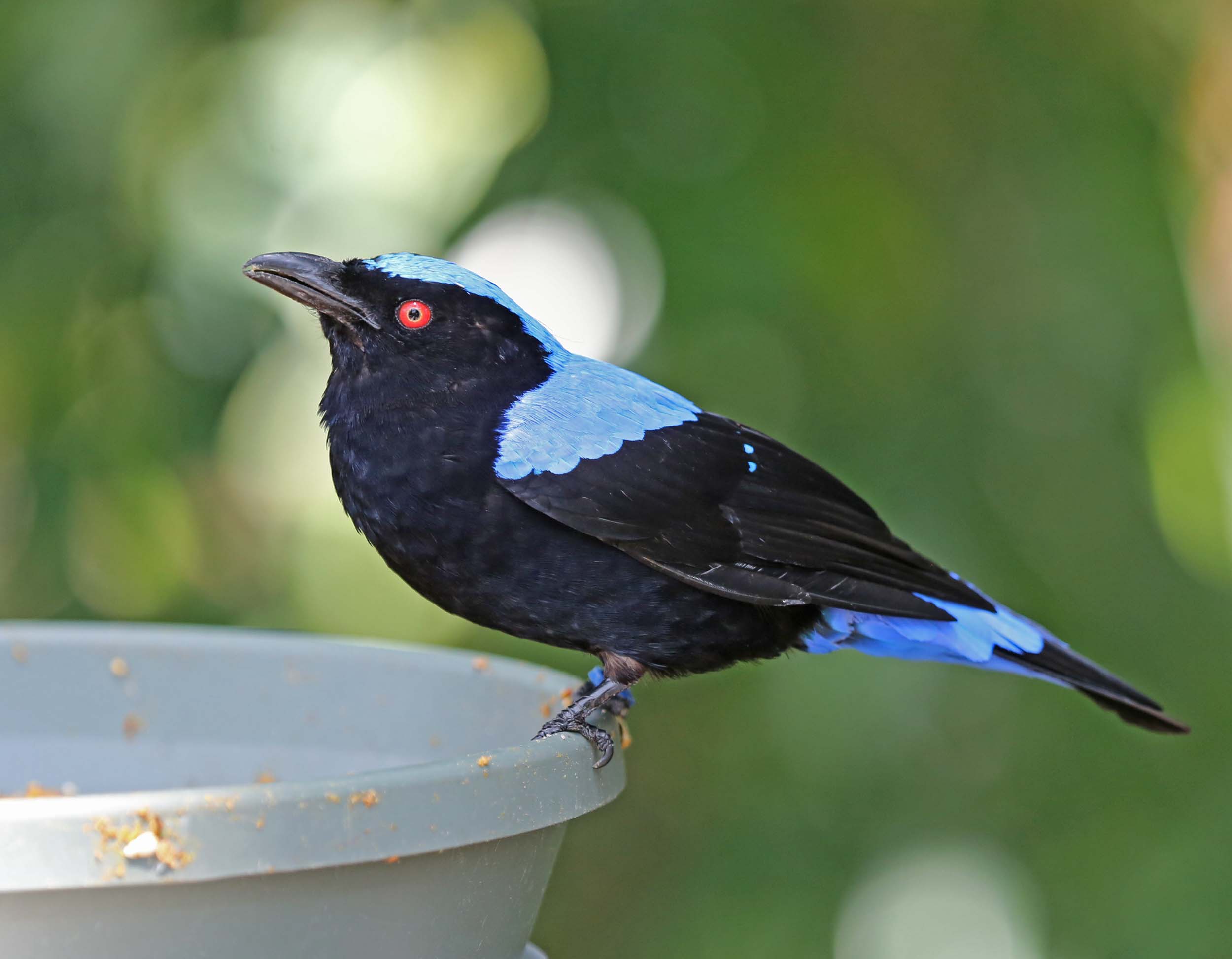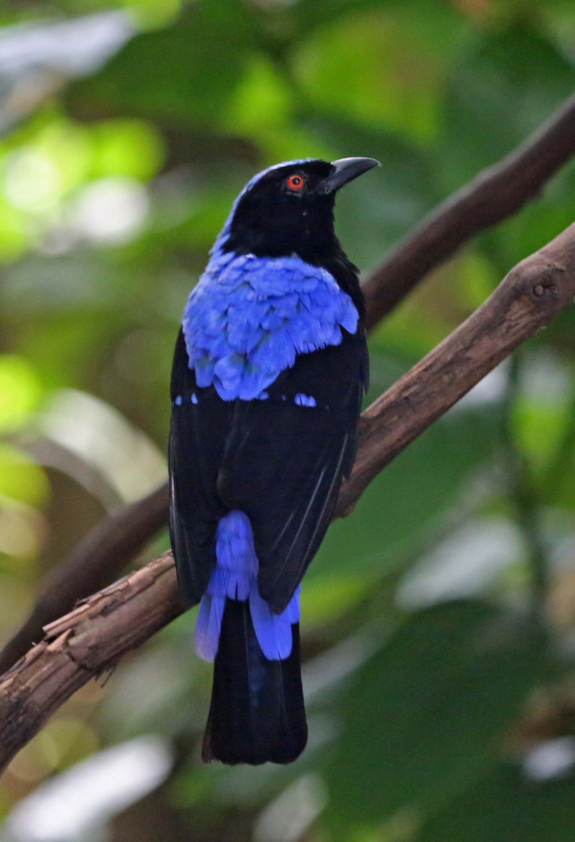 The Asian Fairy-bluebird and the Philippine Fairy Bluebirds are the only members of the genus in the Passeriformes Order. The male Asian Fairy Bluebird is black or dark blue with a bright blue crown down its back to its rump and upper tail-coverts. The female is a dull blue-green or purple.