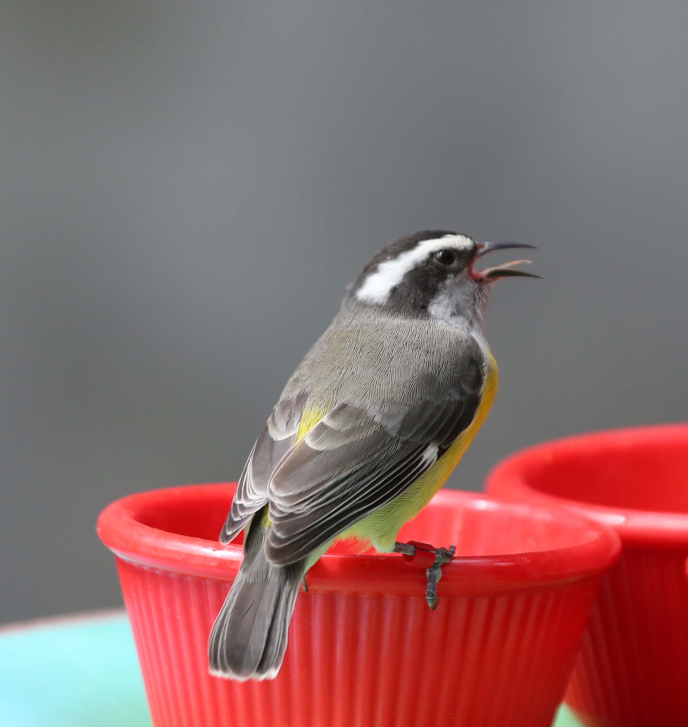 The Bananaquit is found throughout the West Indies, and the Caribbean mainland from Southern Mexico south to southern Brazil and northeast Argentina. Banaquits are honeycreepers and their bill is adapted to taking nectar from flowers. They also eat fruit juices and small insects.