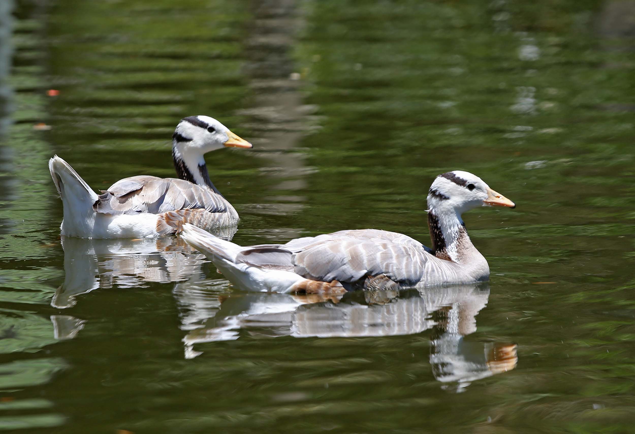 The Bar-headed Goose body is mostly shades of gray (sometimes brownish) with white tail coverts and rump. The head is white with two black bars on the head. One bar is from eye to eye across the head, the other is a lower and extends from ear to ear across the neck. The back of the neck is black or brown with a white strip on the sides. The front of neck is mostly gray. The iris is brown. The bill, legs and feet are orangish-yellow and the bill has a black tip. Both sexes are identical in plumage. Juveniles are similar but the head is pale gray and the black areas on the neck are more brown.