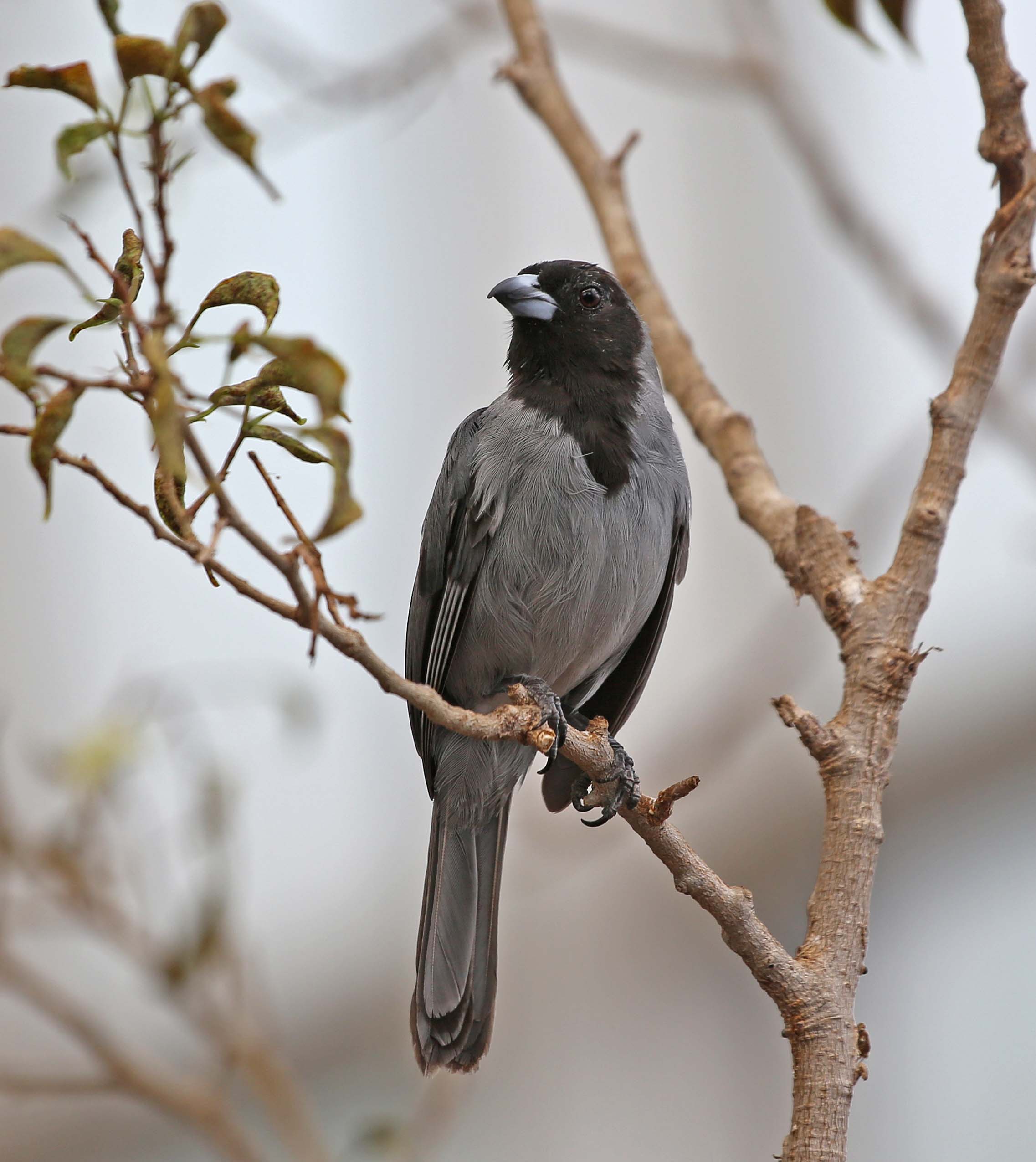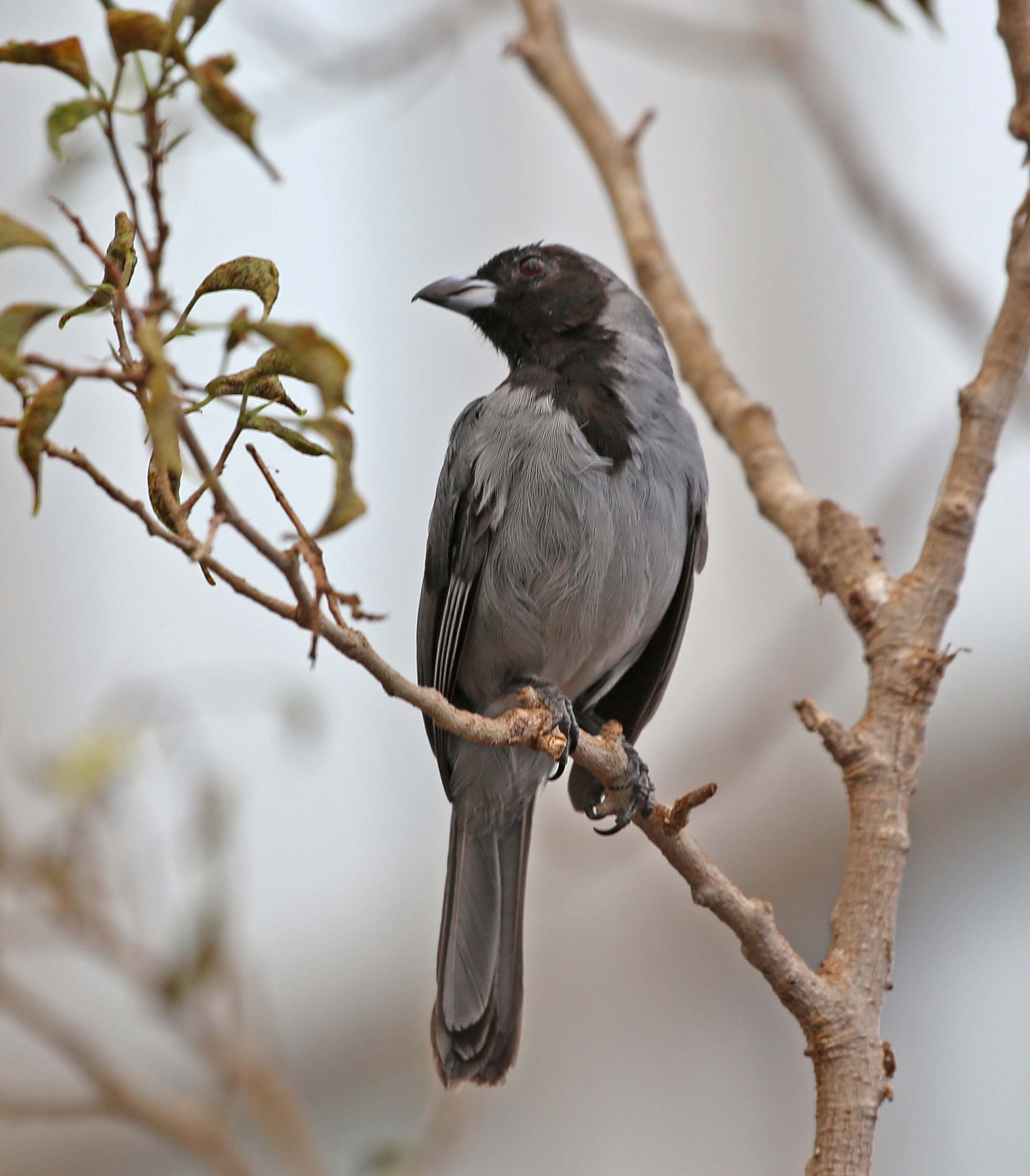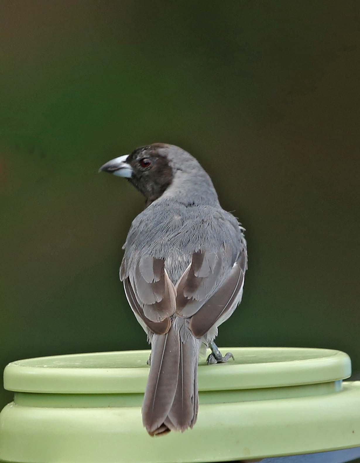 Black-faced Tanagers upperparts are dark gray with the underparts a lighter gray. The head and bib are black. The bill is also black with a bluish-gray base. The eyes are a dark red. Both sexes look identical. Juveniles are a dark yellowish olive green with lighter underparts. They also have a pale yellow eye-ring.