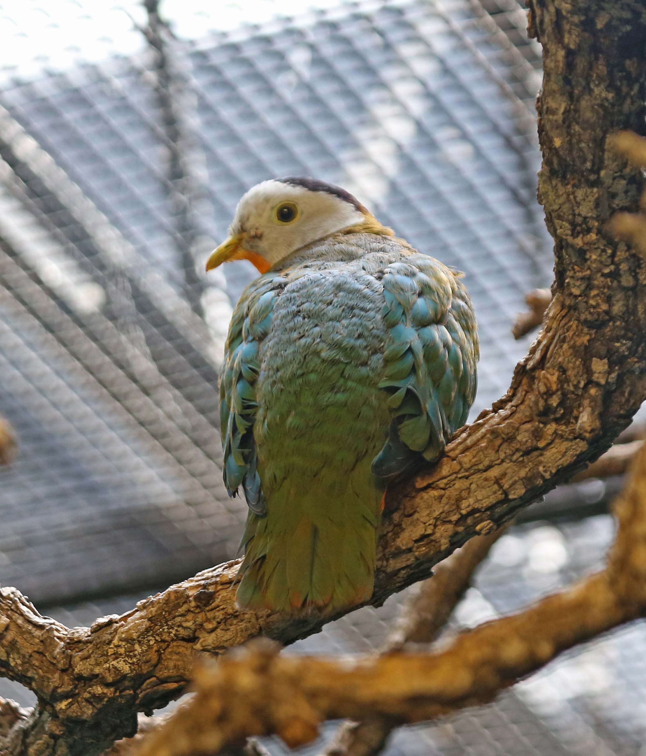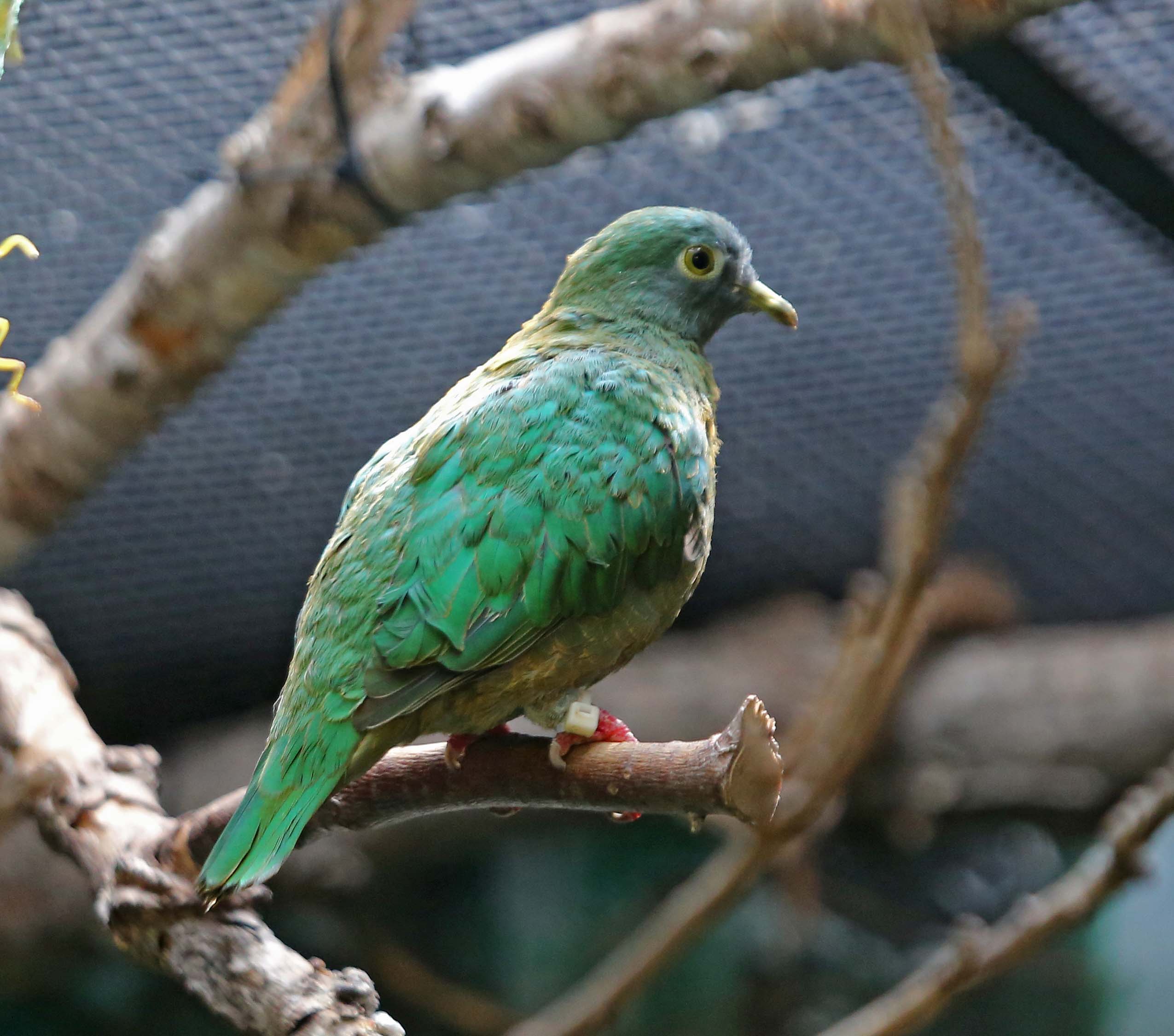 The Black-naped Fruit-Dove are found in Indonesia and Malaysia. The male has a green body, whitish head with black nape and yellow throat, and pink undertail coverts. The female and juveniles are green.