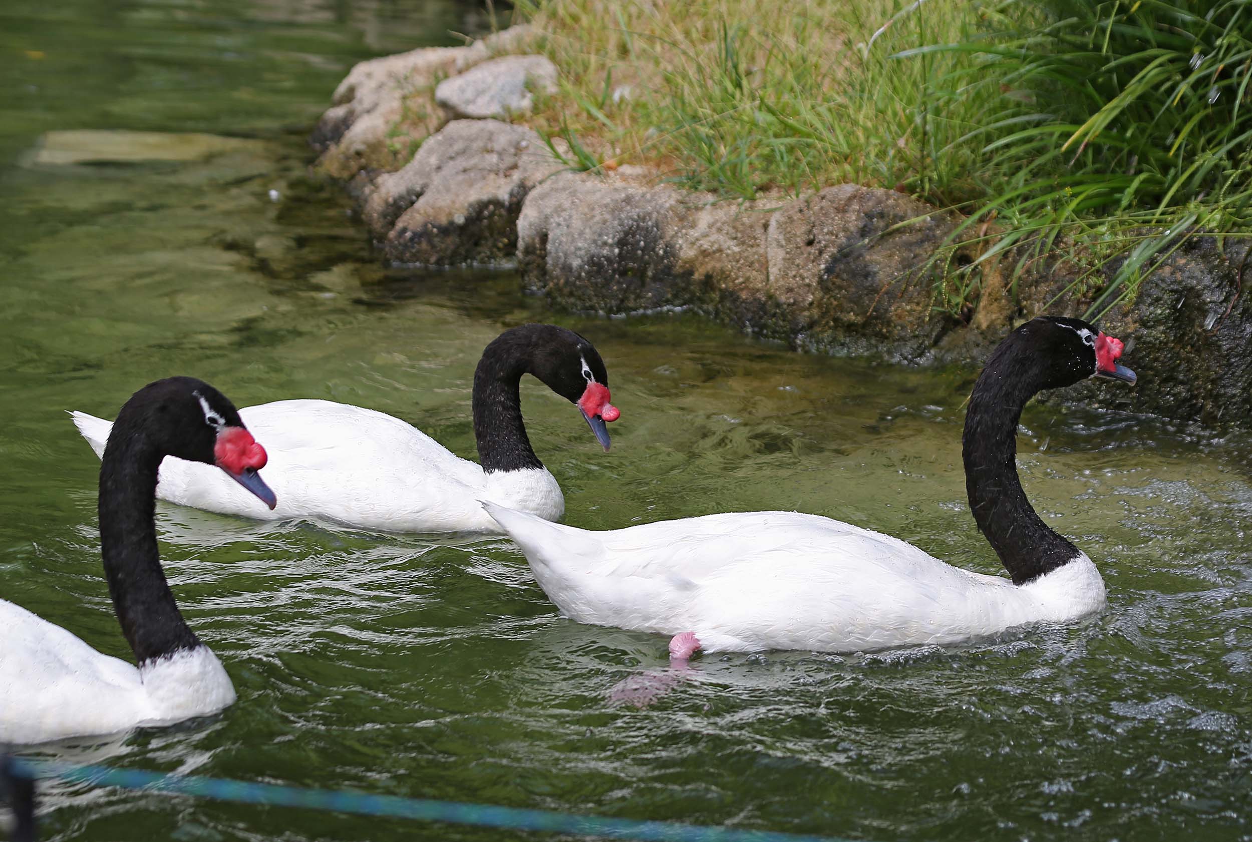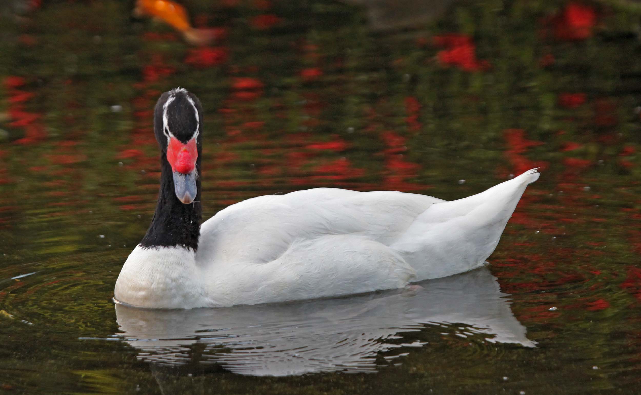 The Black-necked Swan is an import from South America. Both sexes are similar in plumage, but the female is a little smaller in size and the knob on the head is also a little smaller. The Black-necked Swan is the smallest in its genus and is found in freshwater marshes, lagoons and lakes.