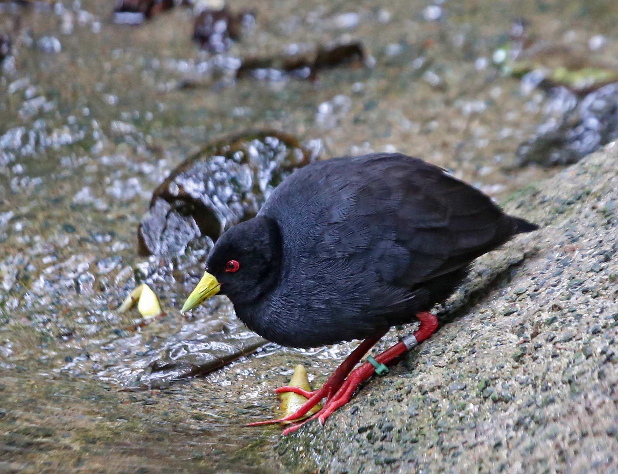 The Black Crake is in the rail and crake family. It is found throughout sub-Saharan Africa. It is black with red eyes, yellow bill and red legs and feet. Both sexes are similar but the male is slightly larger. Juveniles are more brown and gray, the bill is more greenish yellow and the legs and feet are a duller red.