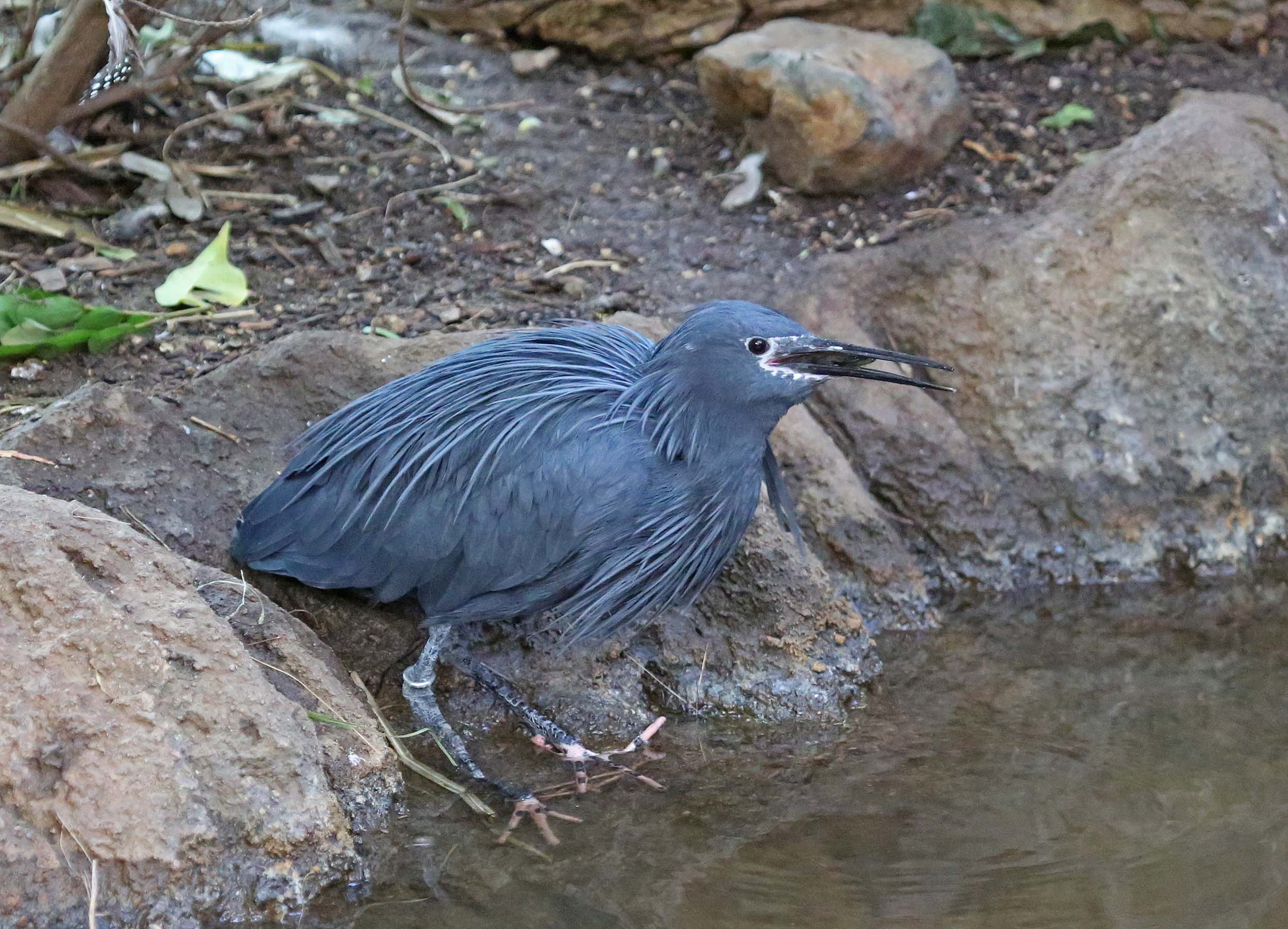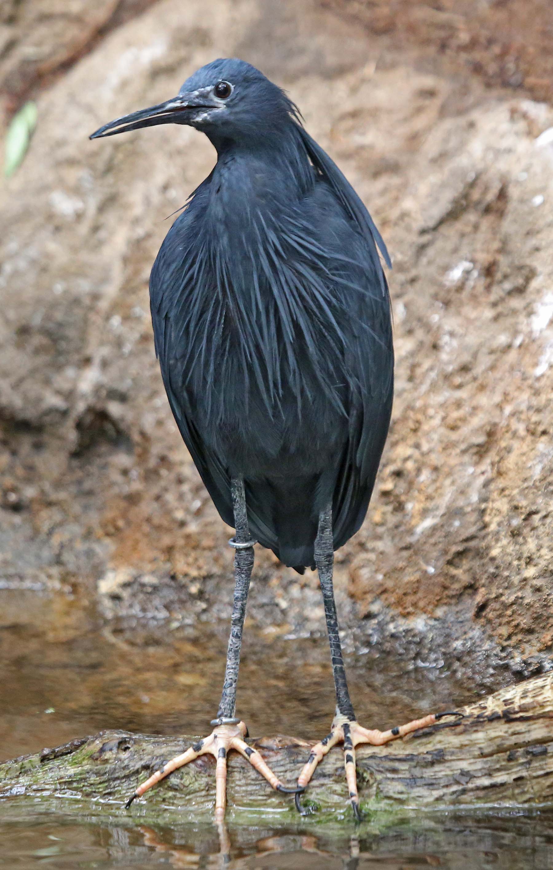 The Black Heron or Black Egret is an all-black bird that is found in Africa. They are medium-sized with a long black bill and a bushy crest on their head. Their legs are black and both their feet and irises are yellow. Both sexes are similar in appearance. Juveniles are also black but do not have the crest. Chicks are covered with a dark grey down and a white crest.
