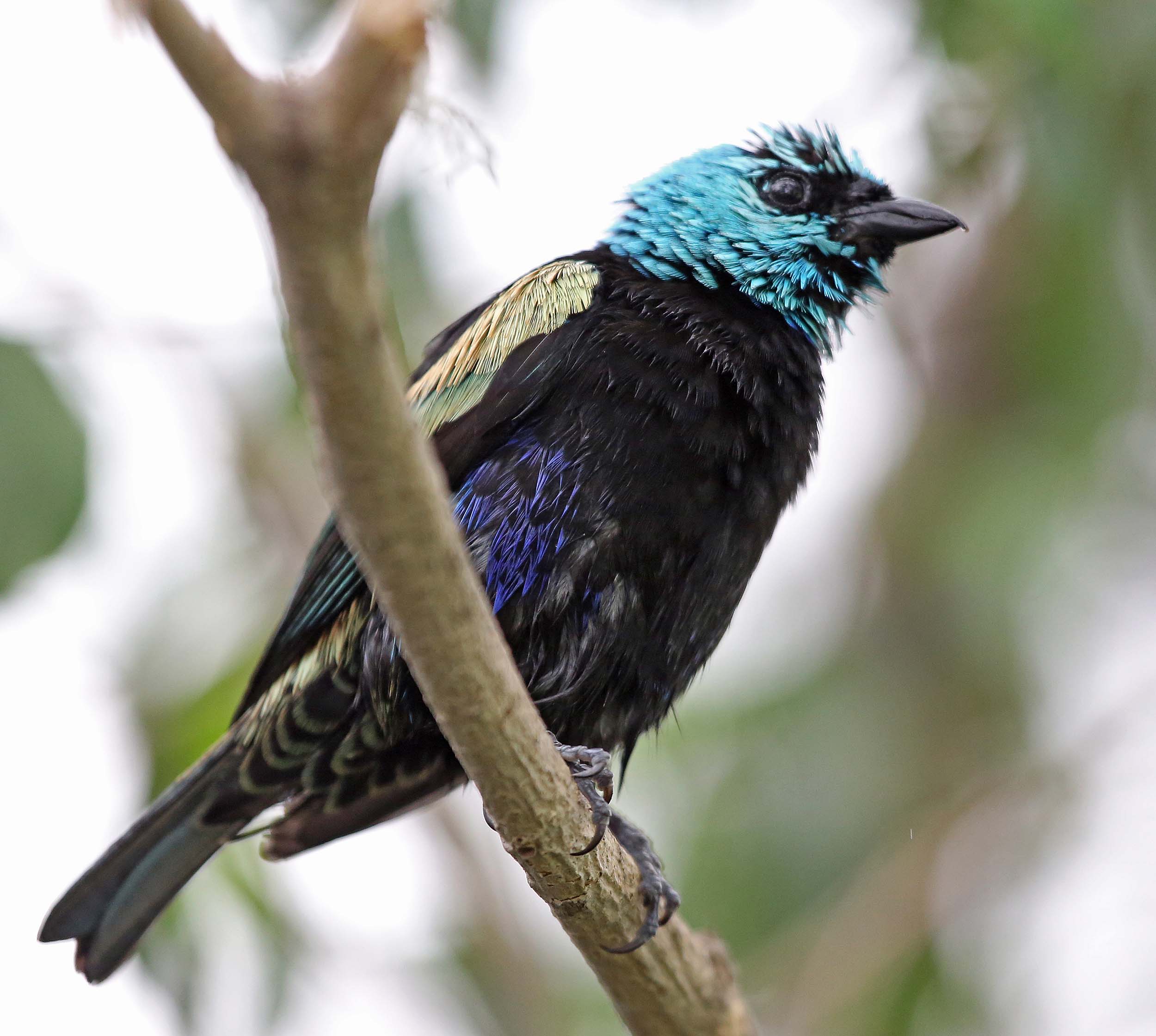 The Blue-necked Tanager is found in northern South America. The range is large but disjoint and the local subspecies have developed color differences in their plumage. The head is bright blue or violet and the eyes and bill are black. The back and underparts are black except for its rump which varies by subspecies. The rump can be silvery green, yellow, or blue. Wings are multi-colored and vary from turquoise to a light brown. The juveniles are brownish gray, with a hint of adult coloration.