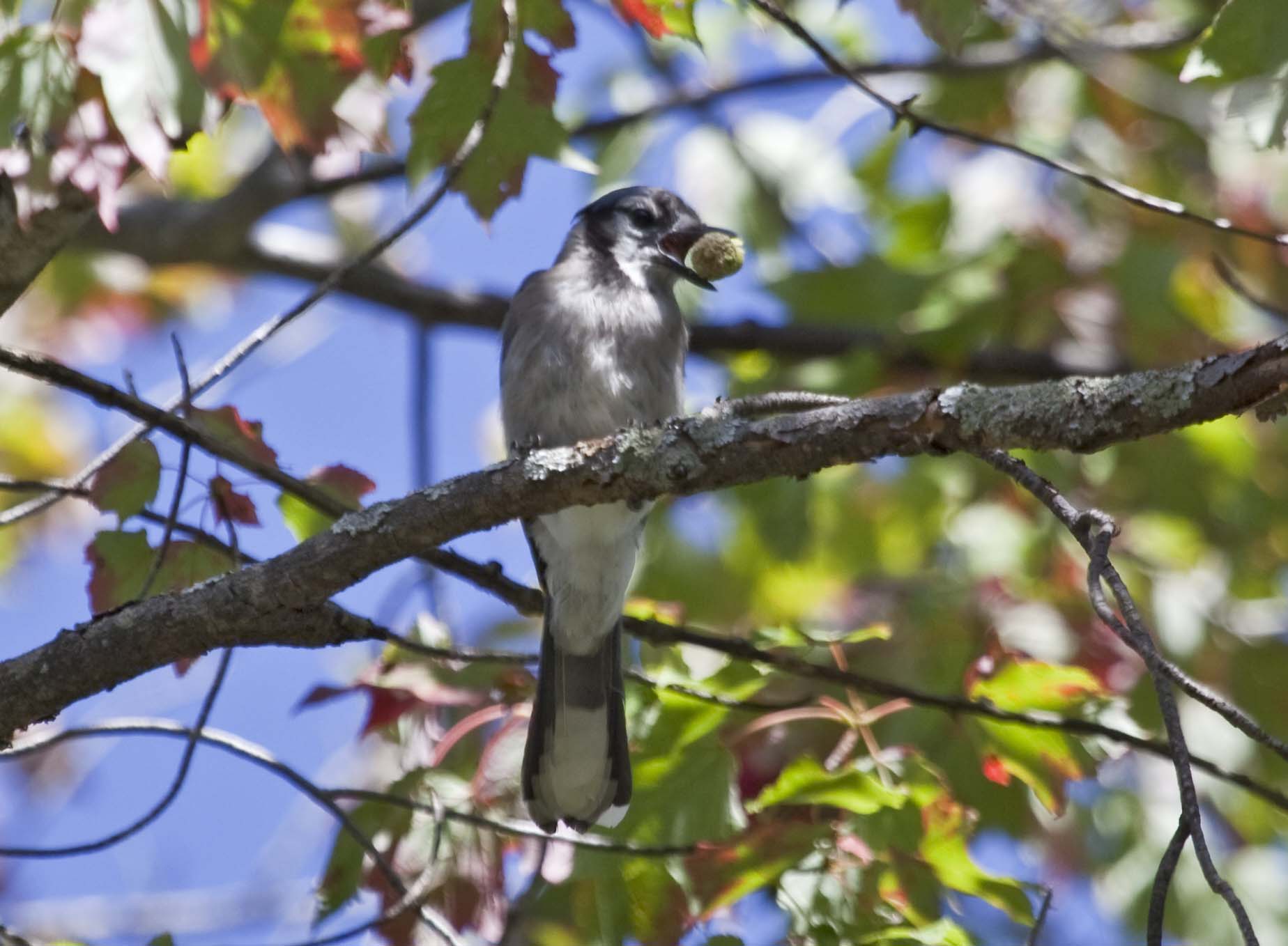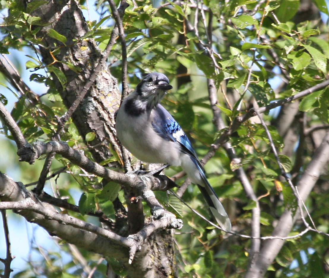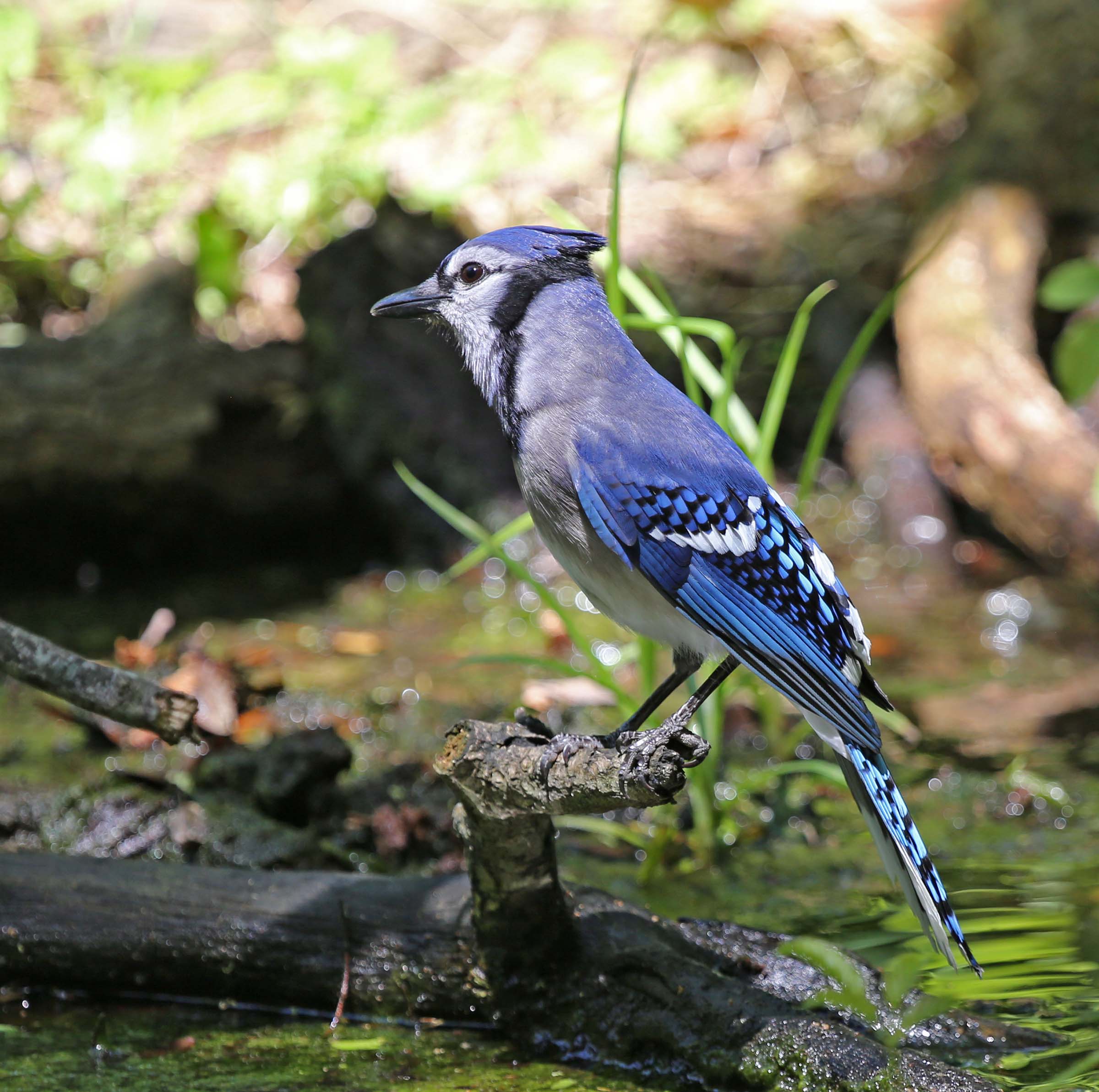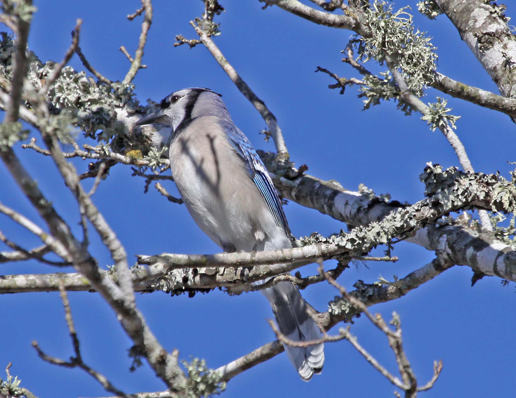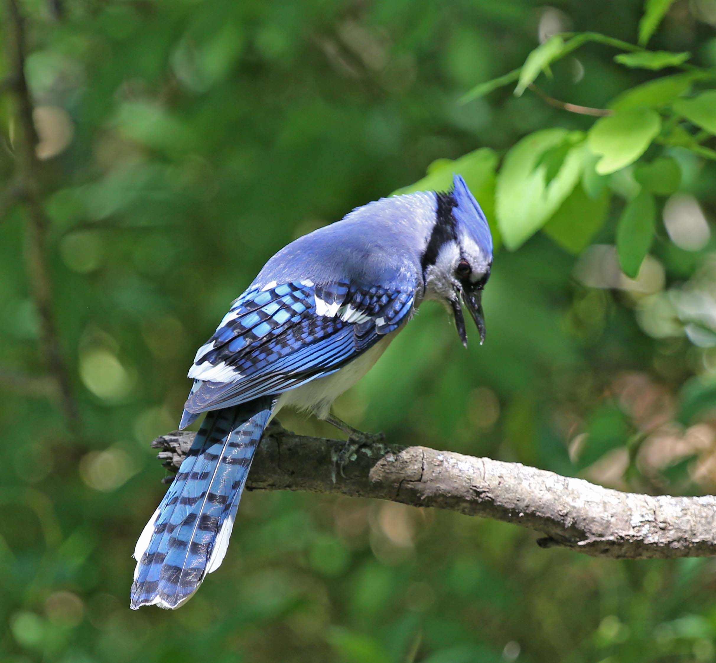 The Blue Jay is distributed over the Eastern and Central U.S. The Blue Jay has a pronounced crest on its head. They eat a variety of plants (seeds, grain, fruits, bread, etc.) and small invertebrates, etc. They are intelligent birds.