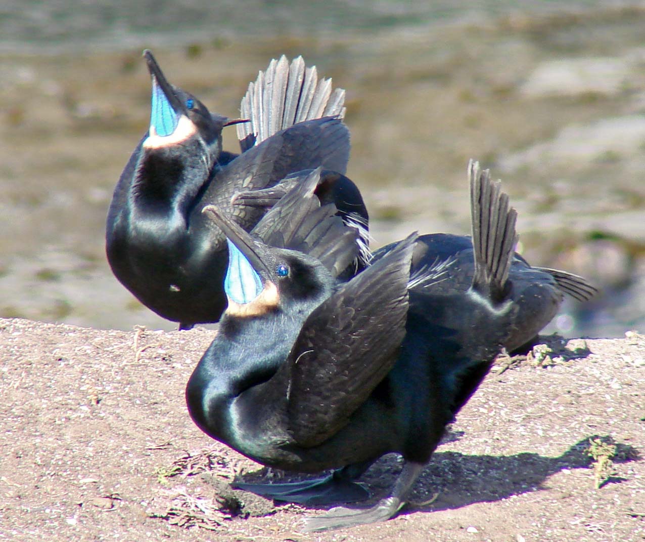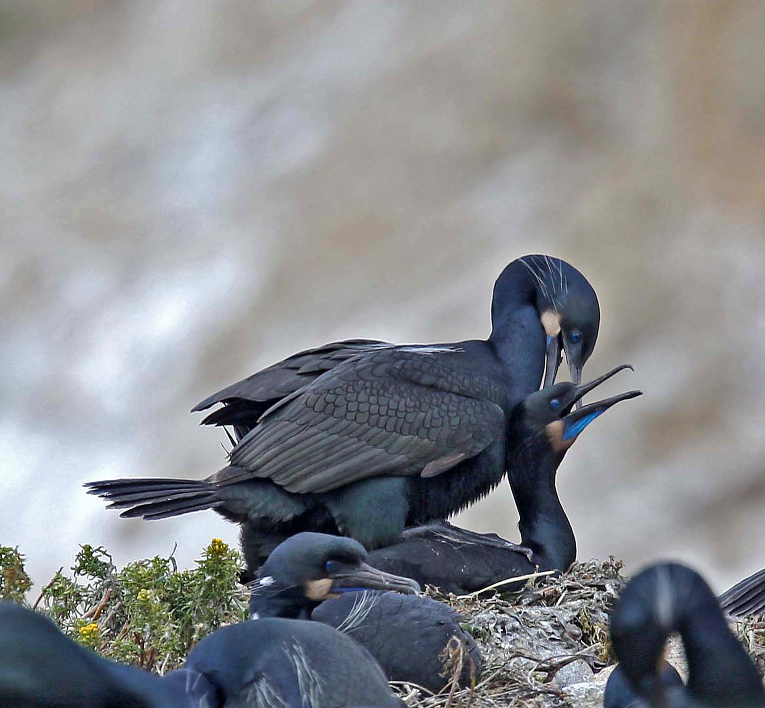 Two mating Brandt's Cormorants in background