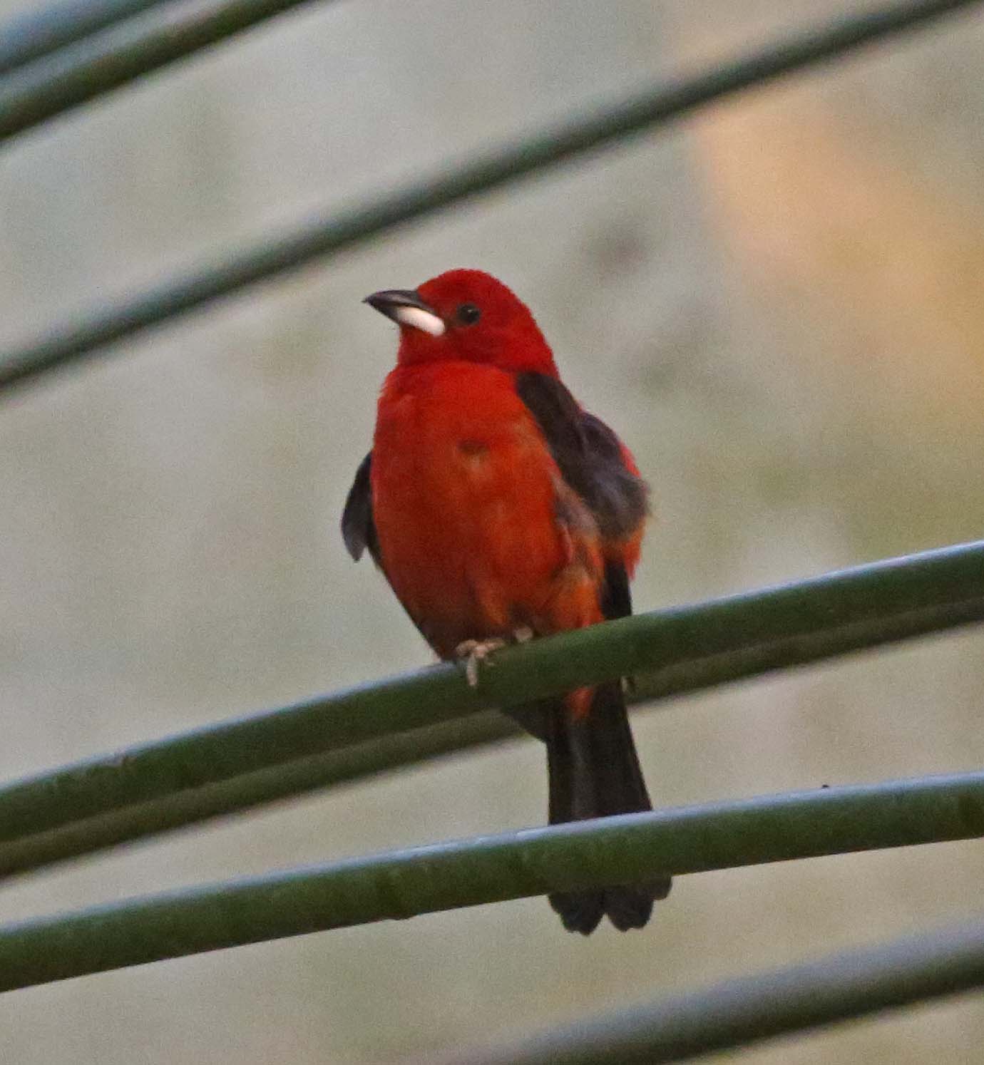 The Brazilian Tanager is endemic to Brazil and is found along the eastern coast of the country. The male has a red body and head with black wings and tail. Females upperparts are brownish-gray with the underparts mostly a light red. Both have bills with the lower mandible expanded at the base.