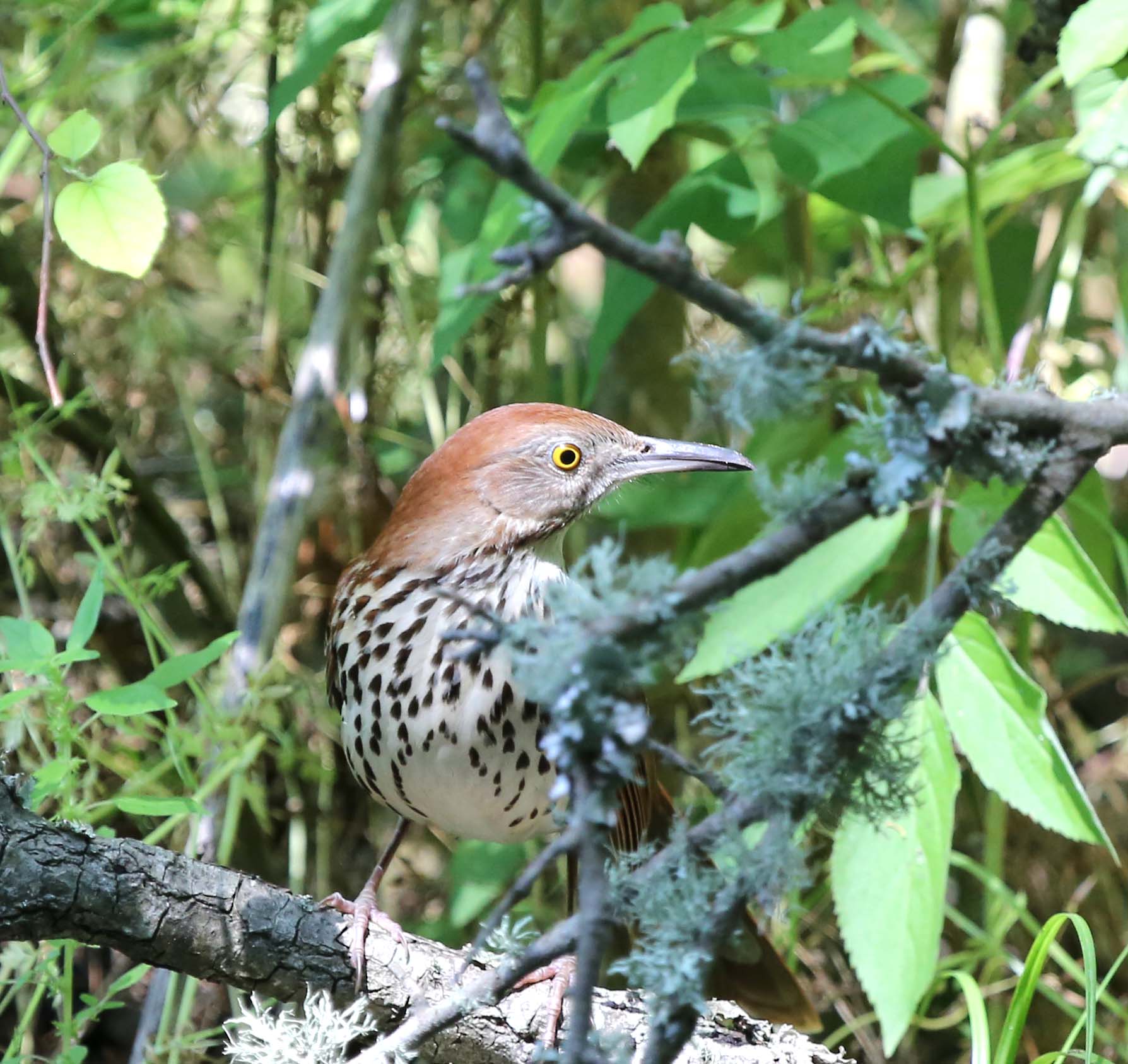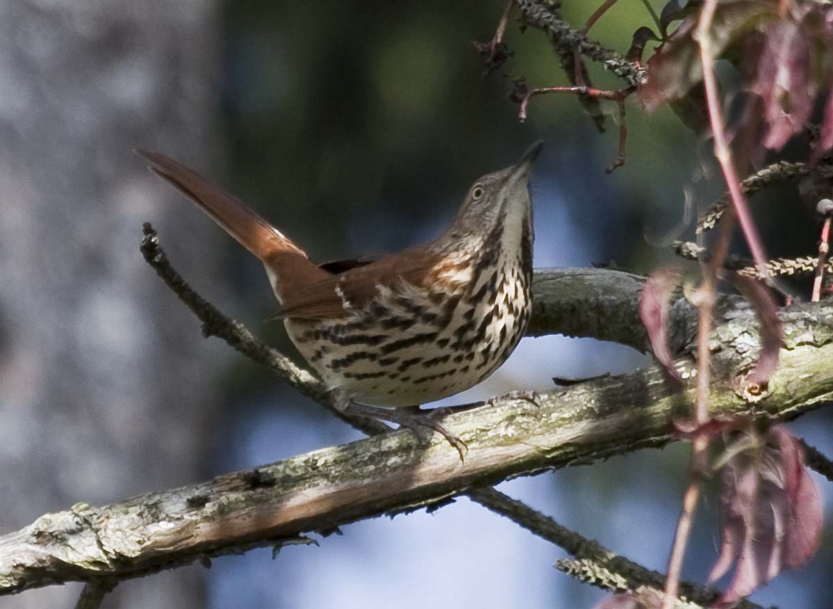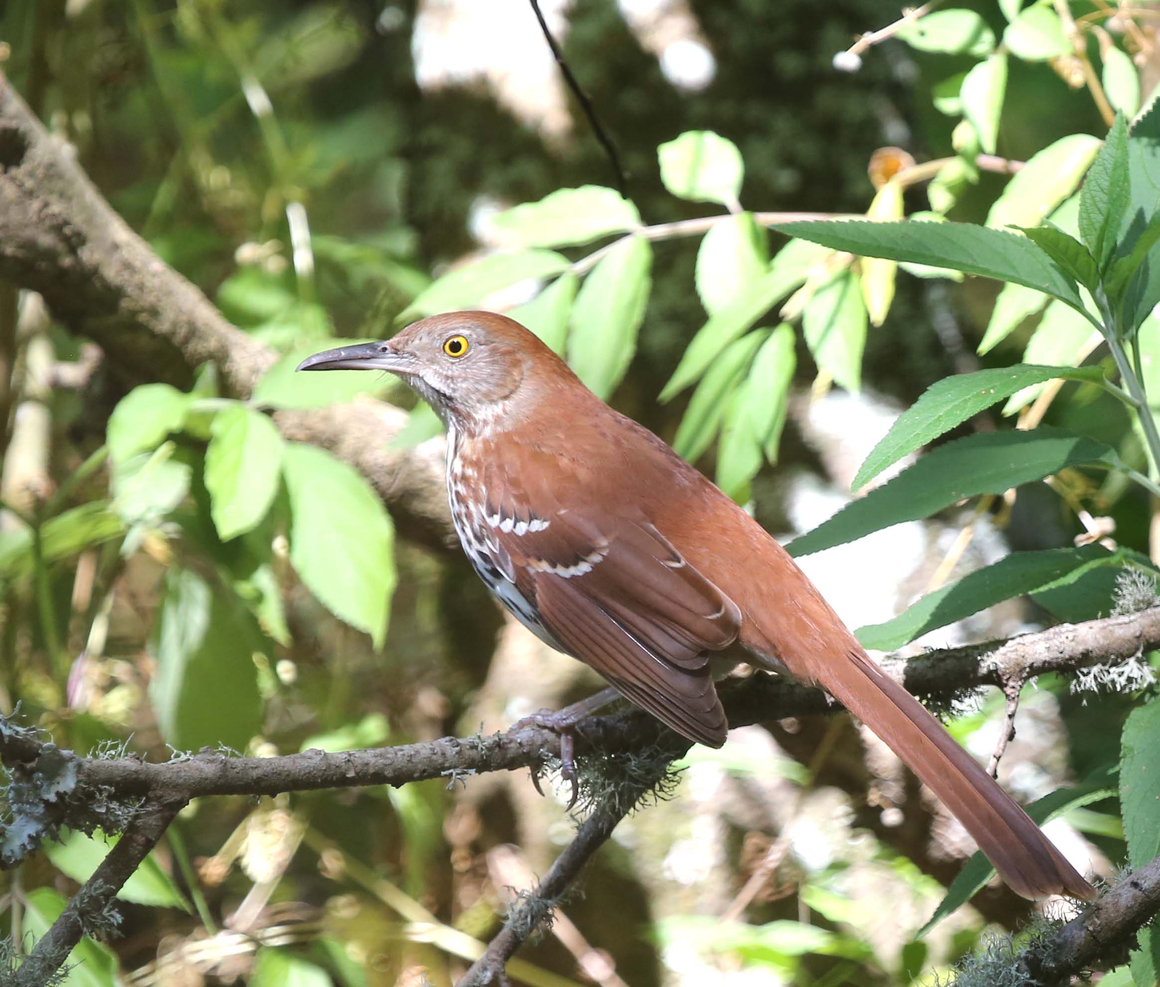 The Brown Thrasher is reddish-brown (or brown) with a white breast that is streaked. The Brown Thrasher is found in mid-western and eastern U.S. It's beaked is not as curved as the California Thrasher, which is local to California.