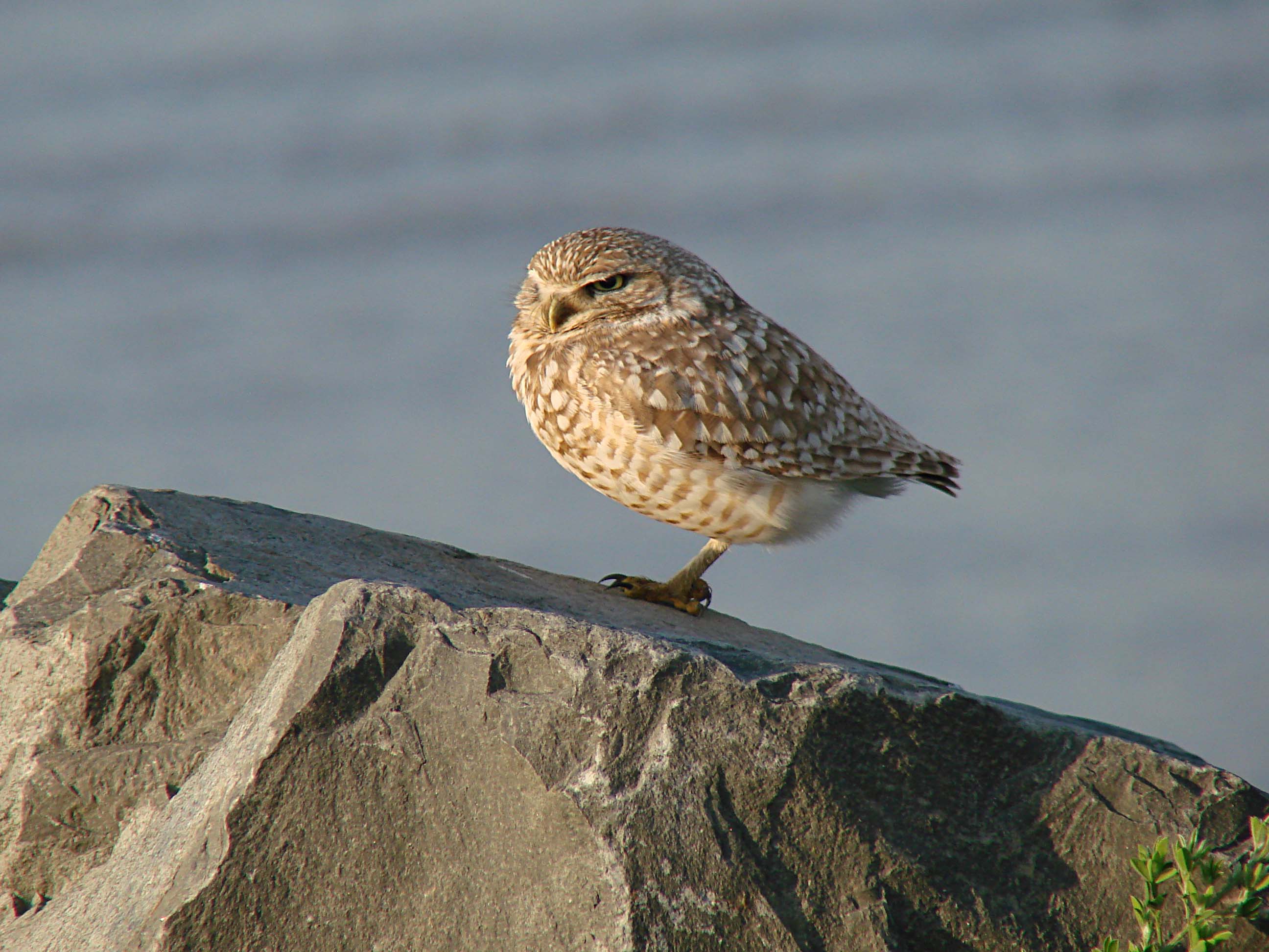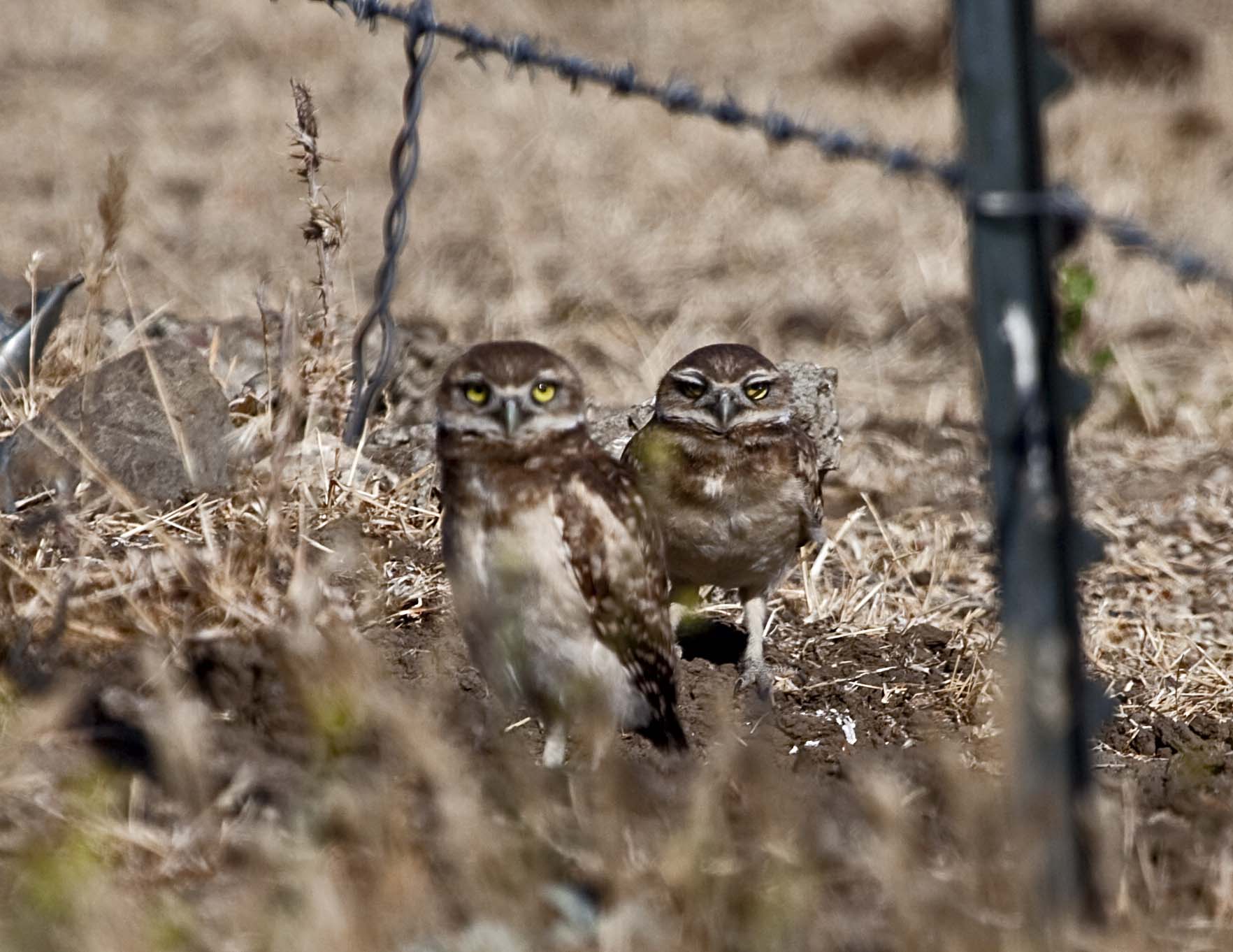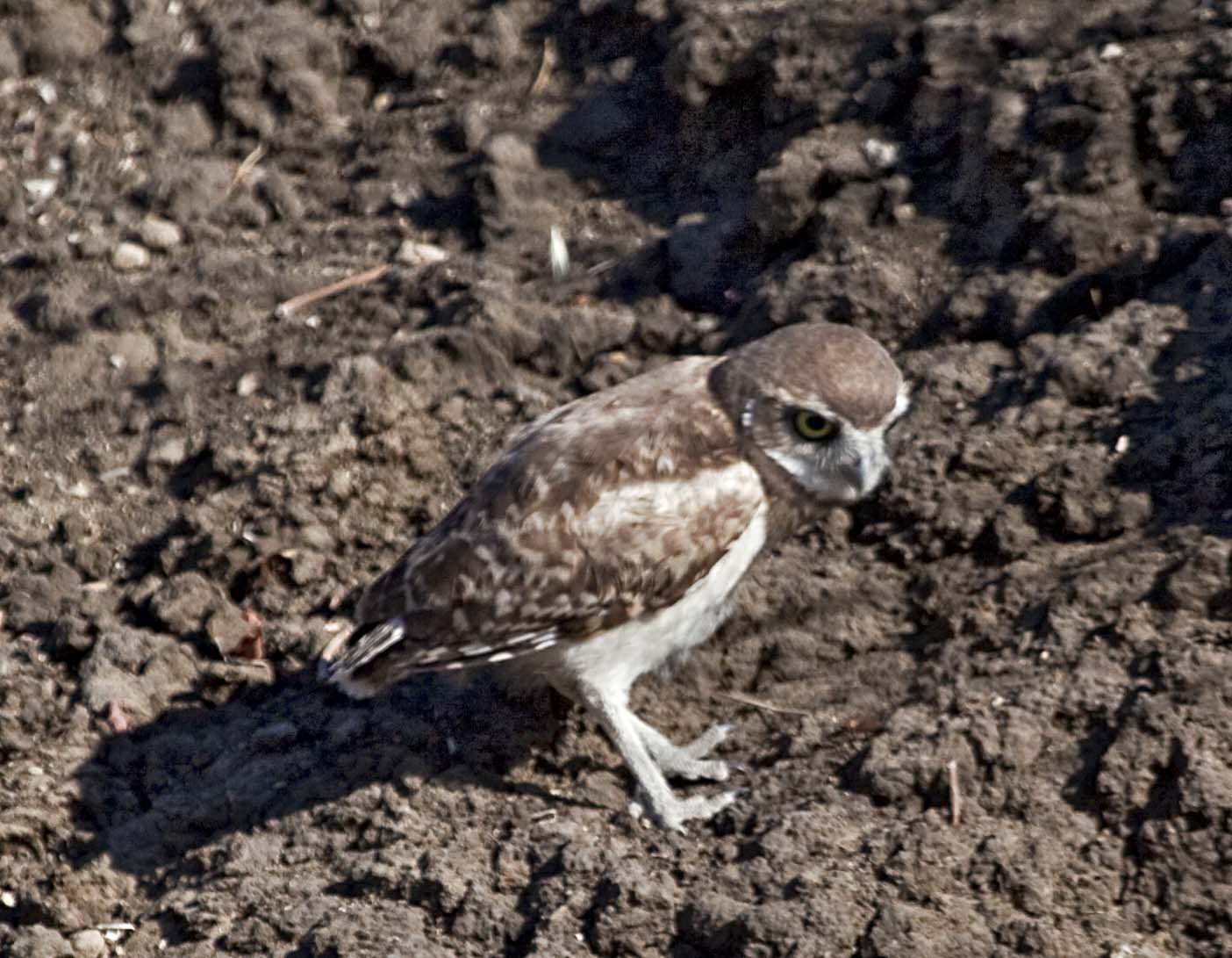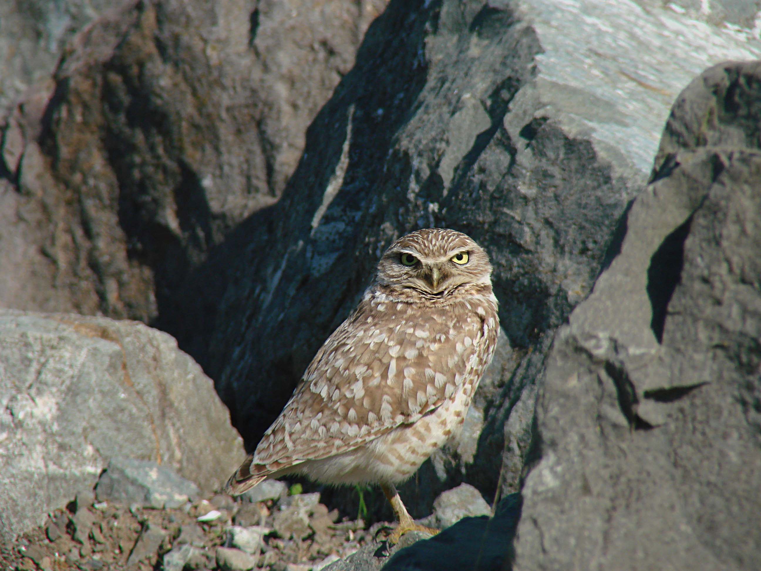 The Burrowing Owl is a small owl with long-legs and a short tail that is found in North and South America. They primarily eat large insects and small mammals (principally rodents). They nest in abandoned animal burrows or crevices. They frequently perch on posts and rocks or can be seen peeking out of their burrows.