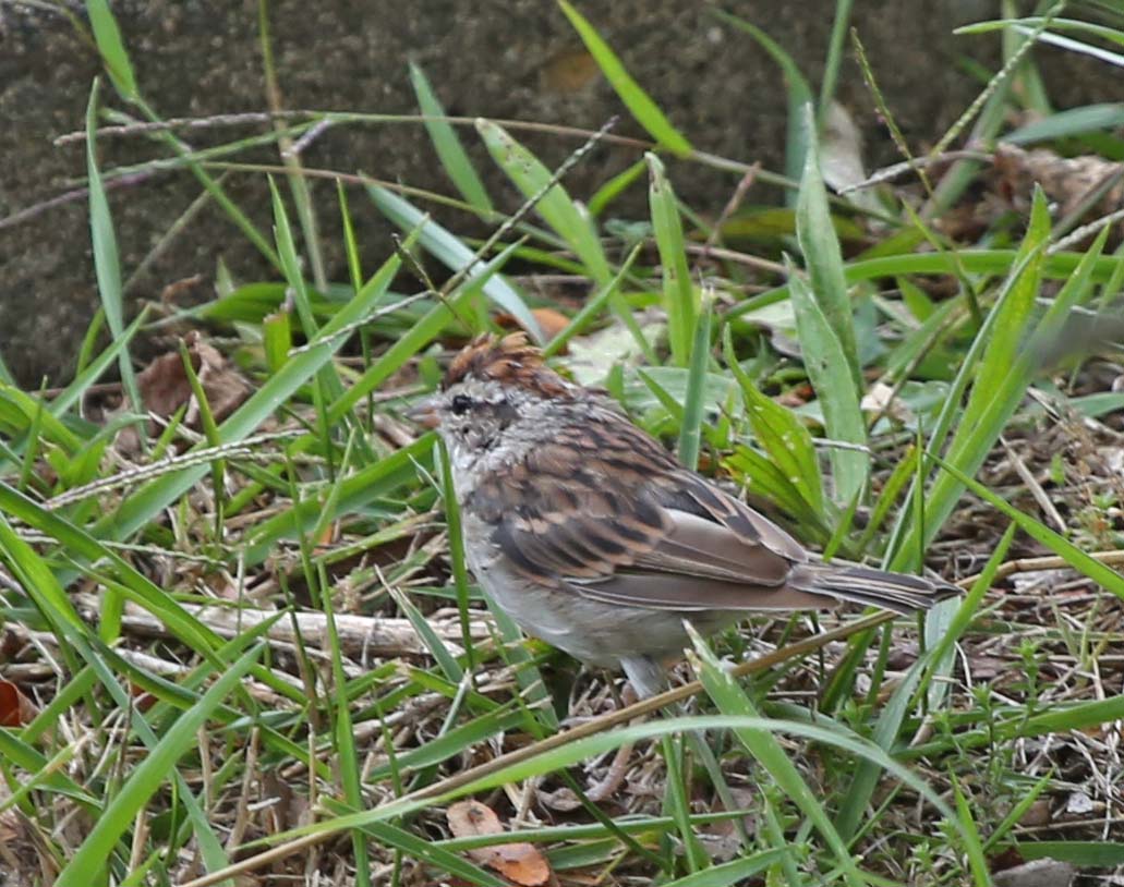 The Chipping Sparrow it noted for its flight call. It makes a fast trill when it is flushed. They are found throughout the U.S., Canada and Mexico. They breed through much of their range. They forage on the ground looking for seeds and crumbs of most any kind of food.