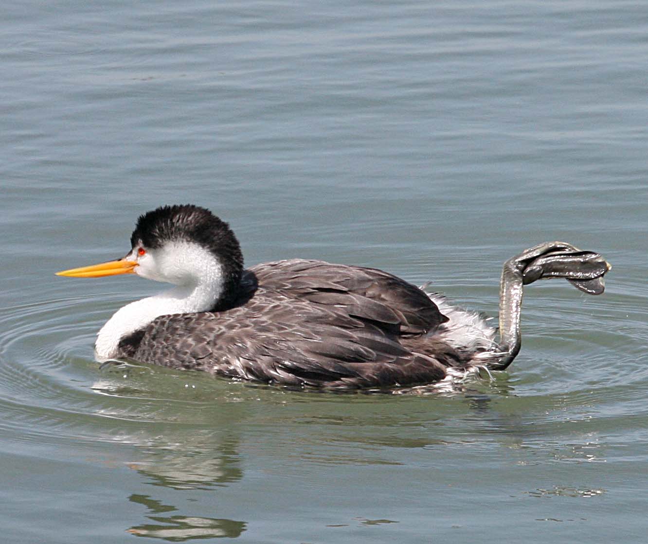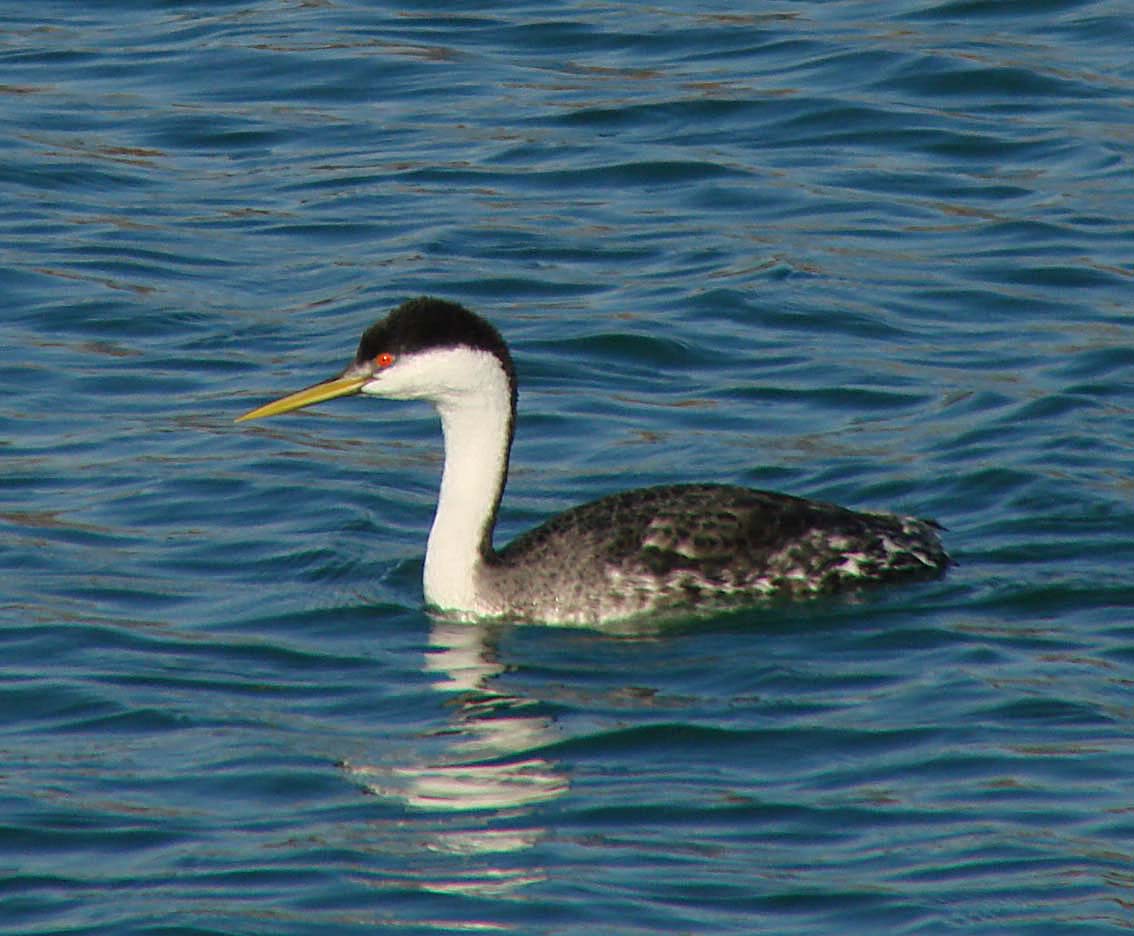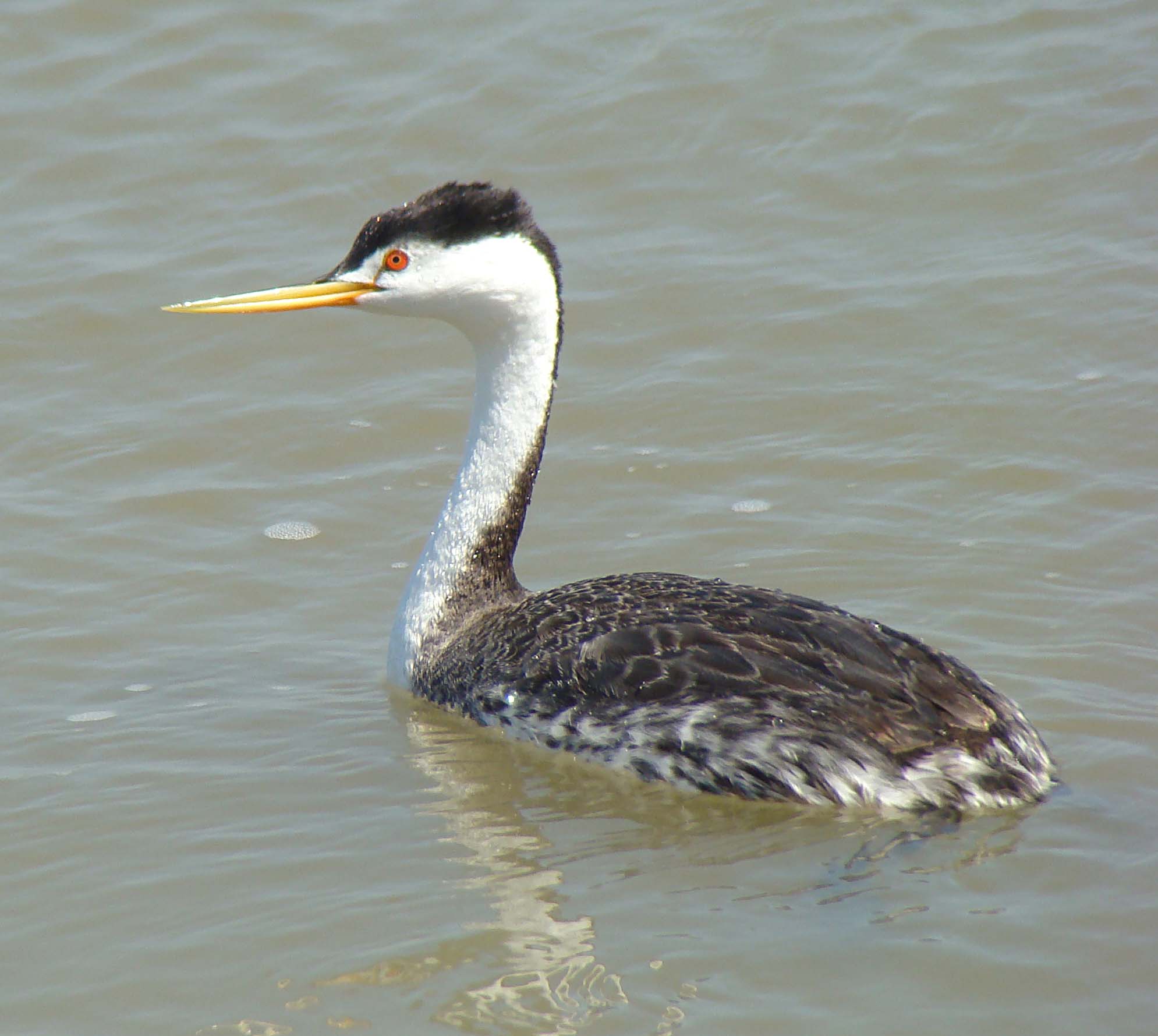 The Clark's Grebe breeds in northern U.S. from the Great Plains to the west coast and winters along western U.S. from California through Mexico. The Clark's Grebe is very similar to the Western Grebe and you can frequently spot them together. The Clark's Grebe's bill is more orange yellow than greenish yellow. Both are black and white birds with the crown of the head being black. The black on the Clark's Grebe head extends to just above the eye.