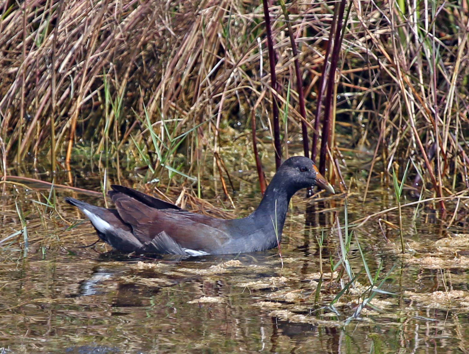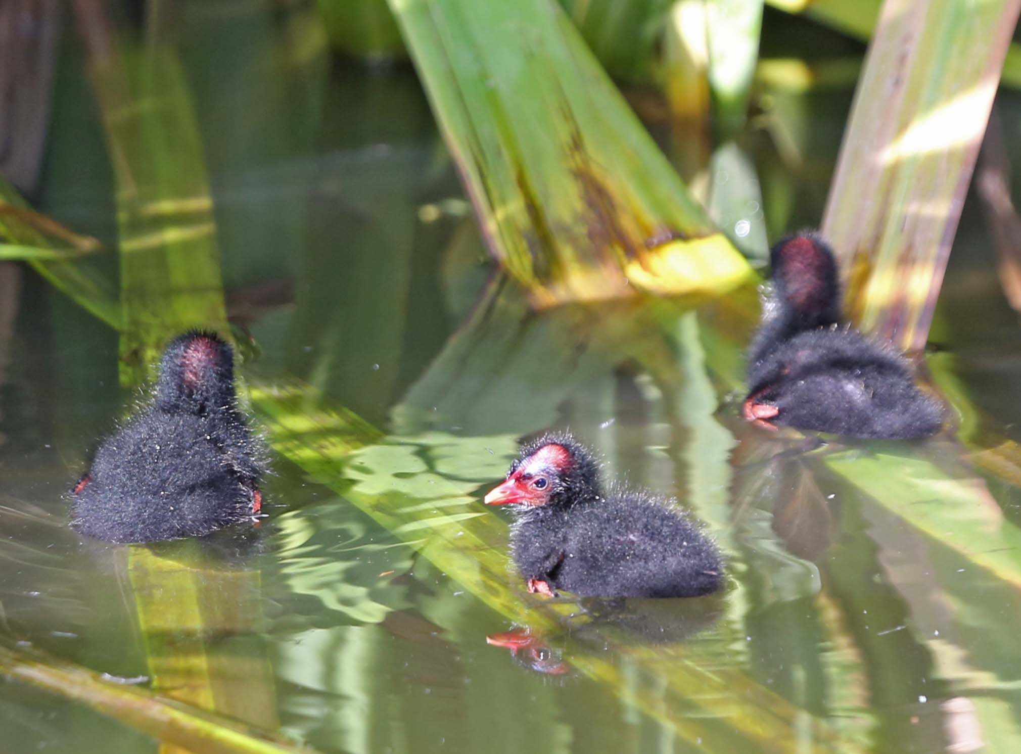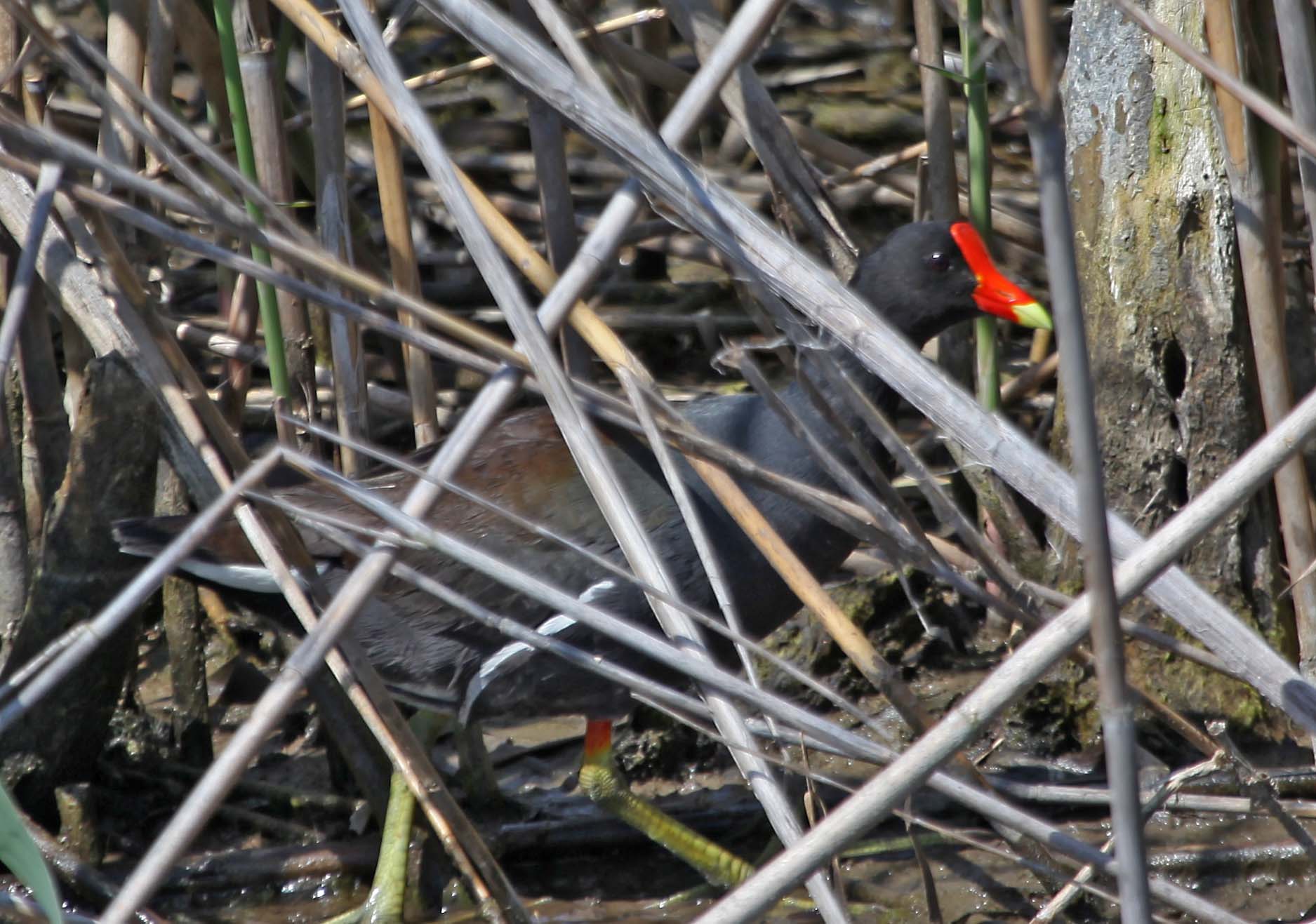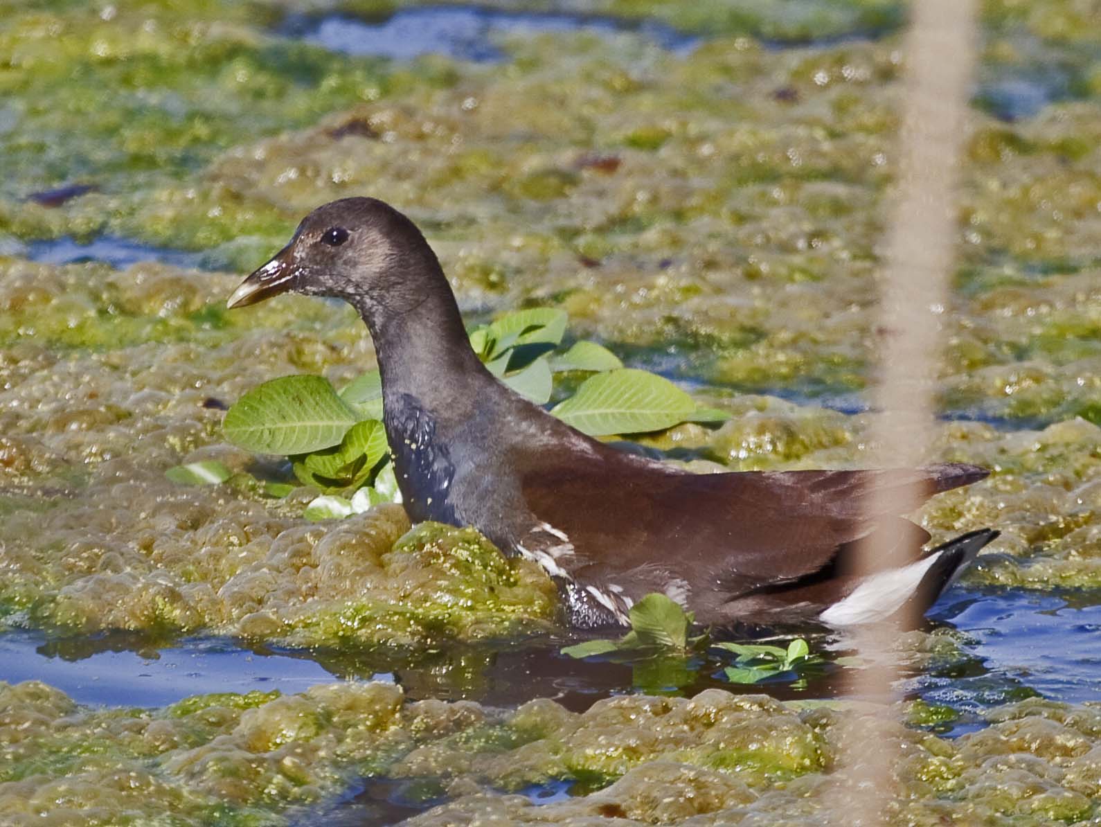 The Common Gallinule (formerly the Common Moorhen) was split from the Common Moorhen by the American Ornithologists' Union in July 2011. The Common Gallinule prefers freshwater marshes and is found throughout North America. Their diet consists of grasses, sedges and sometimes snails. The toes on the Common Moorhen are extremely long and there is no webbing. This supposedly makes it possible for them to walk on floating vegetation. As one of the pictures below shows, they can also run across water.