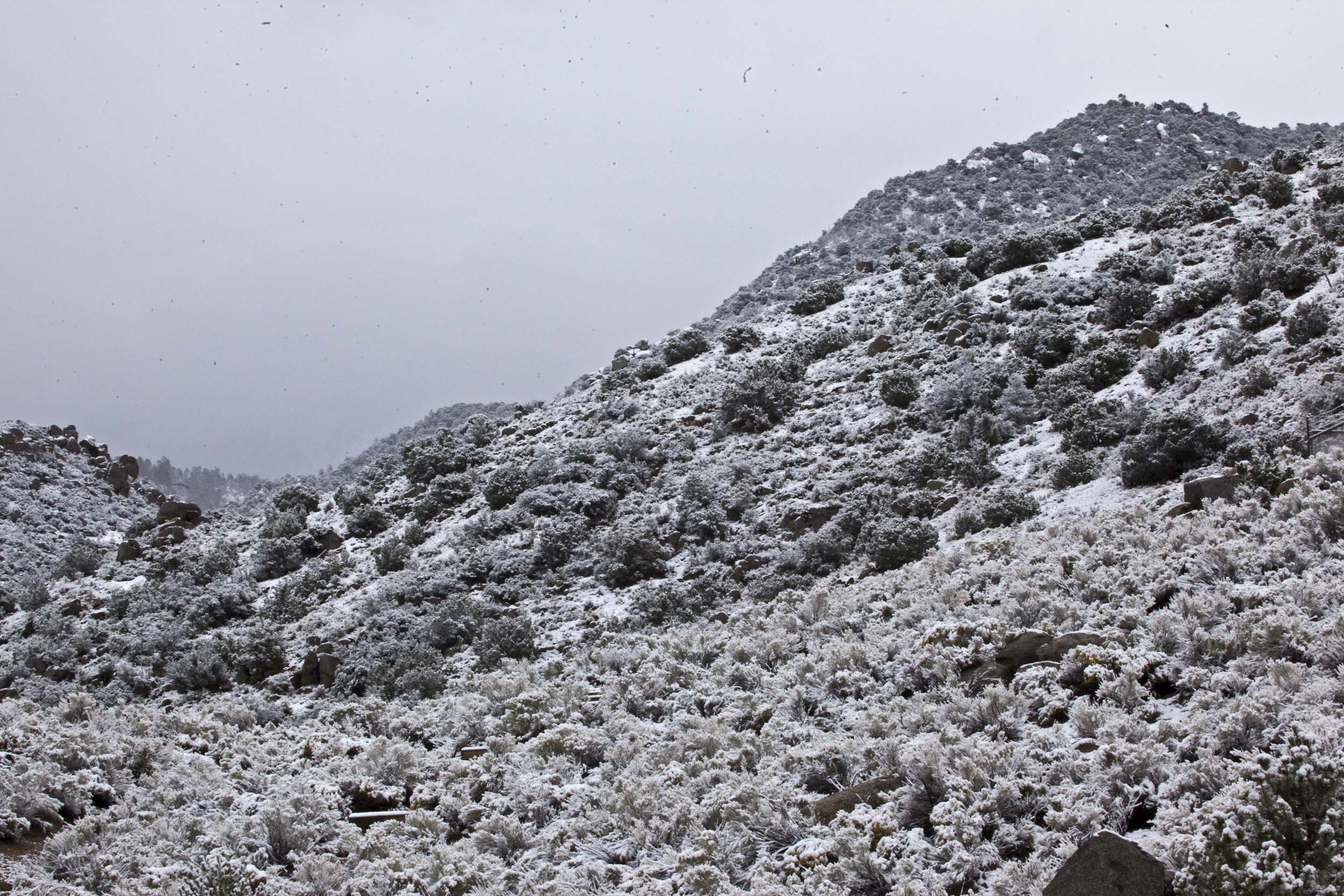 Embudito CanyonEmbudito Canyon is in the foothills of the Sandia Mountains on the east side of Albuquerque, New Mexico. I was lucky to go there two days running in late October. The first day it was in the high 60's and the second day there was snow on the ground. I saw lots of birds. Some were moving around so much that I had difficultly taking pictures of them. I did see lots of Canyon Towhees, White-capped Sparrows, House Finches, Juncos, and some Gambel's Quail.