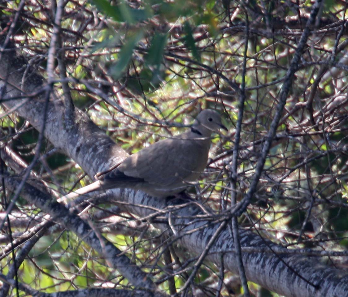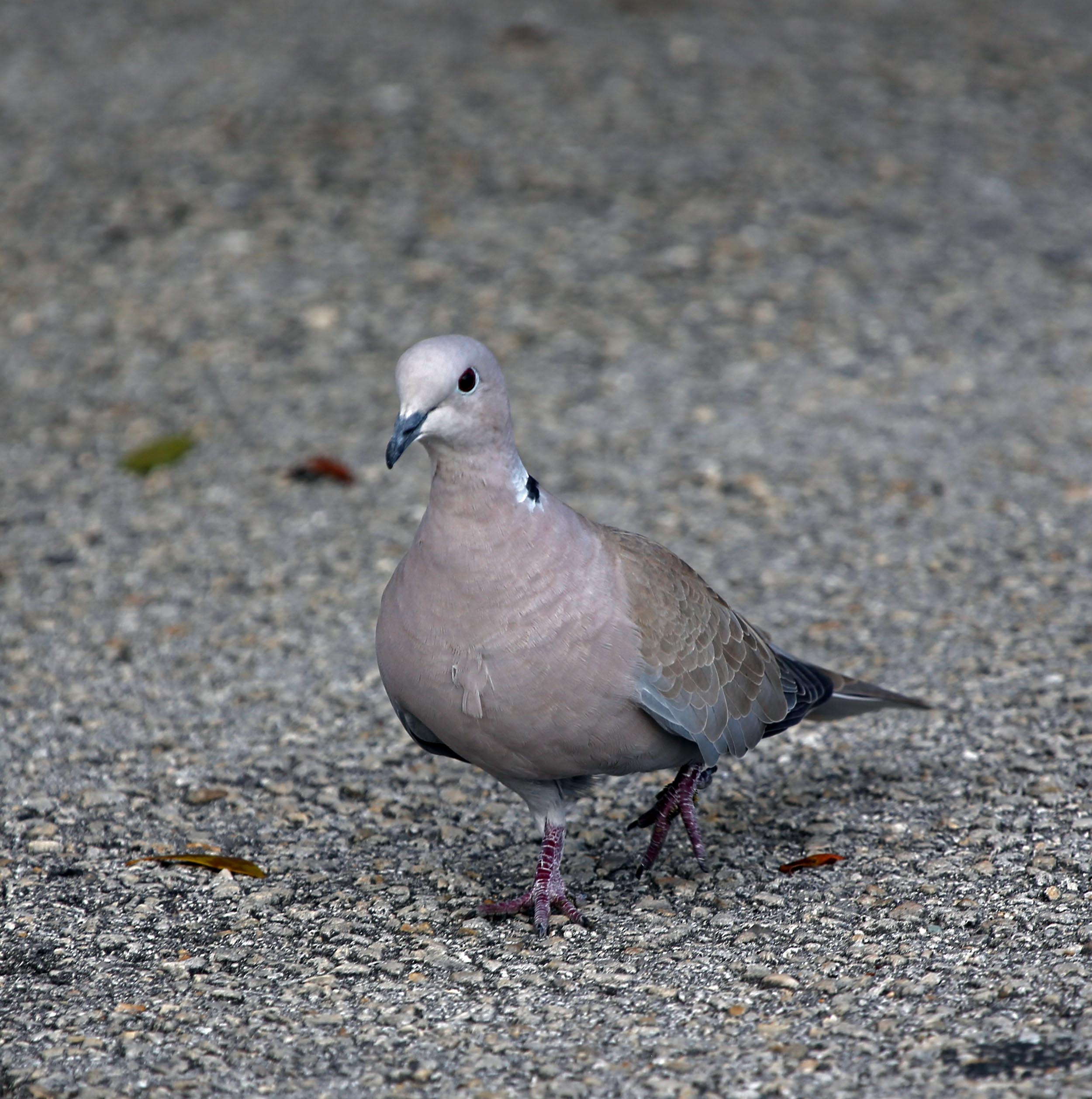The Eurasian Collared Dove was introduced to the Bahamas from Eurasia. It spread to Florida and then west, all the way to the West Coast. It breeds wherever there are trees for nesting.