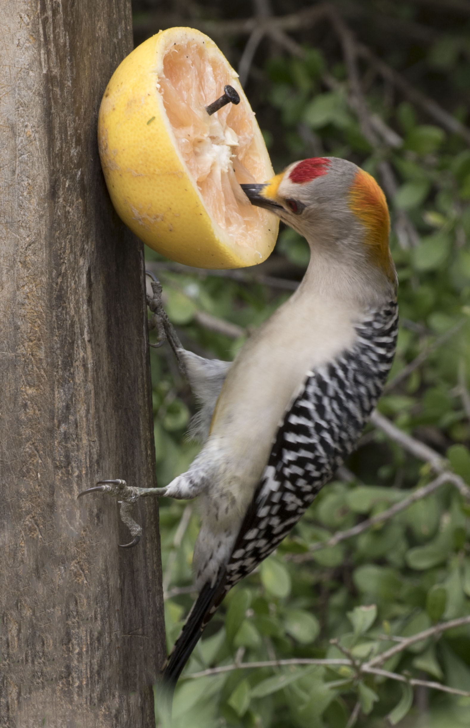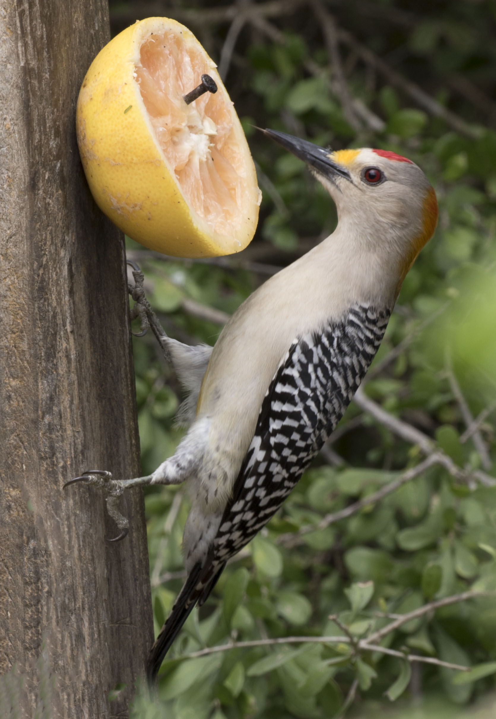 The Golden-fronted Woodpecker s found from Texas and Oklahoma through Mexico to Honduras and northern Nicaragua. The male and female are sexually dimorphic. The female has yellow on the head and nape while the male has a red crown and yellow/orange nape. Diet is insects (mostly grasshoppers and additionally beetles and ants) and vegetable matter, including corn, acorns, fruits and berries.