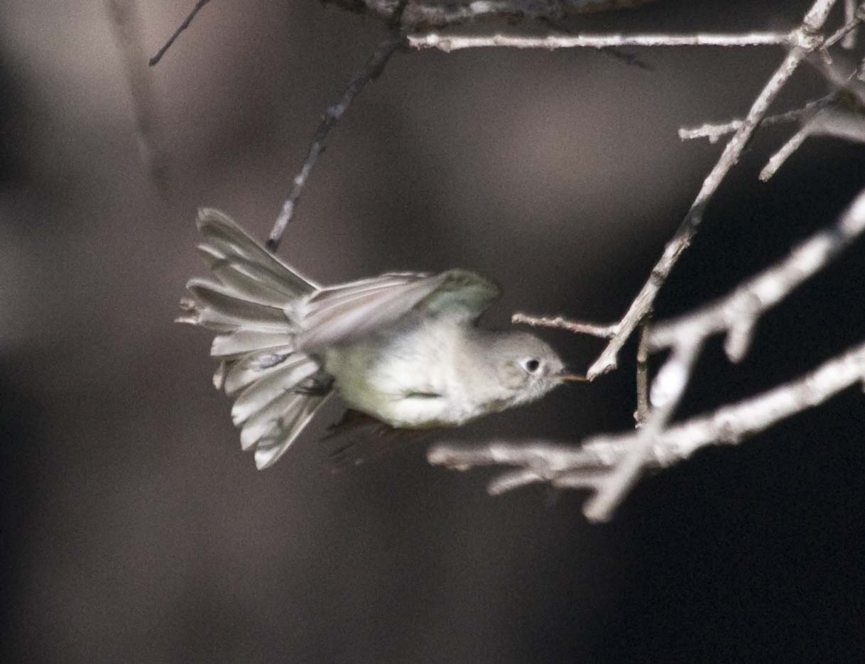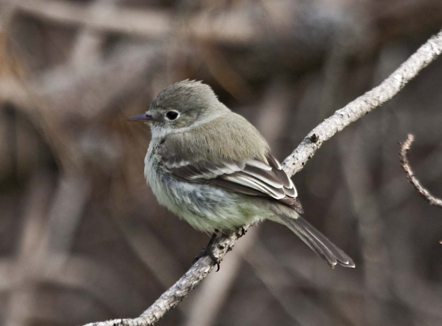 The Gray Flycatcher breeds in mostly in western U.S. and winters in Mexico. The Gray Flycatcher is a rare visitor to the S.F. Bay Area. It was spotted in a park in the East Bay hills. Quite a few birdwatchers came to see it. The best way to identify these birds is that they wag their tail downward.