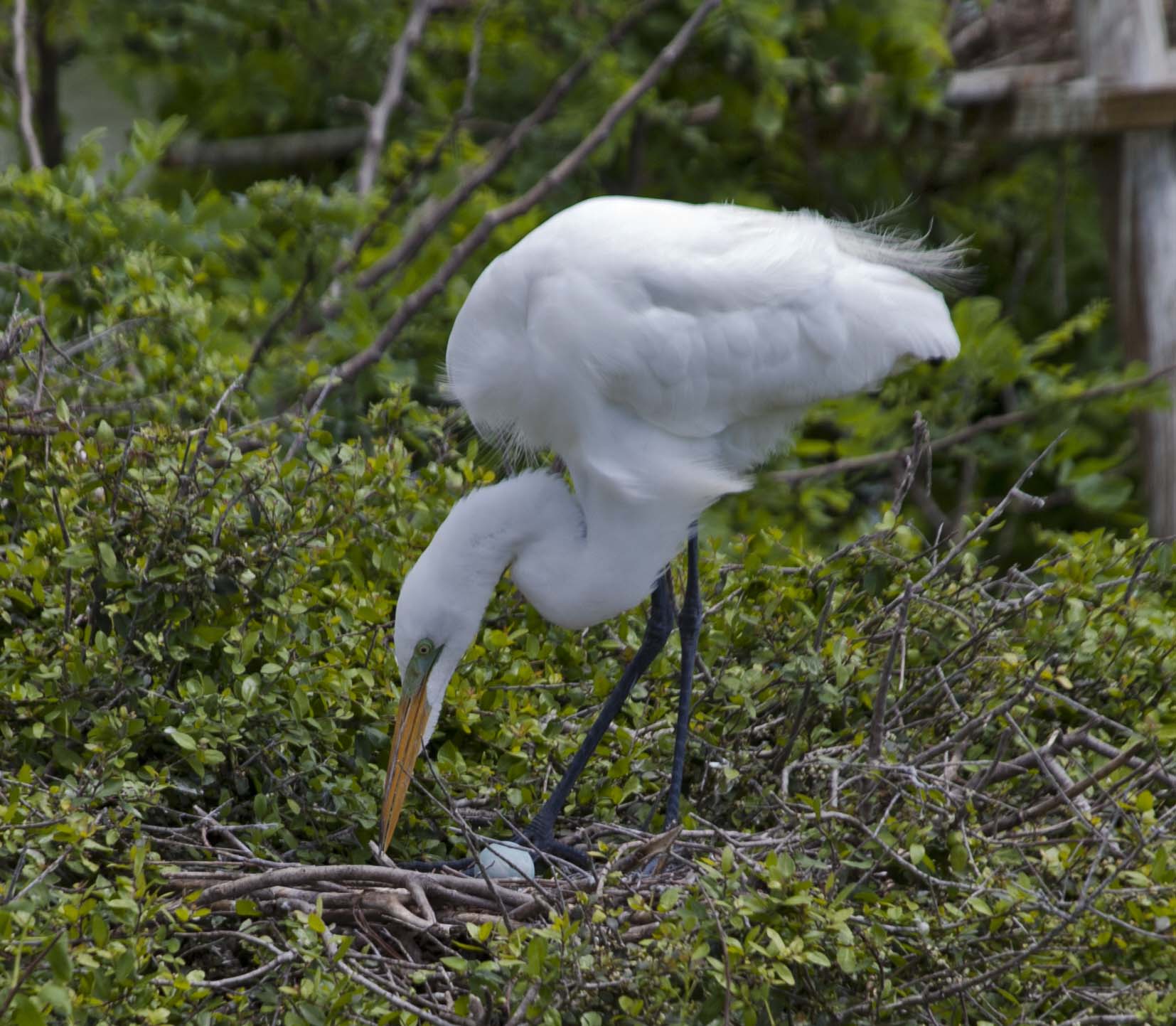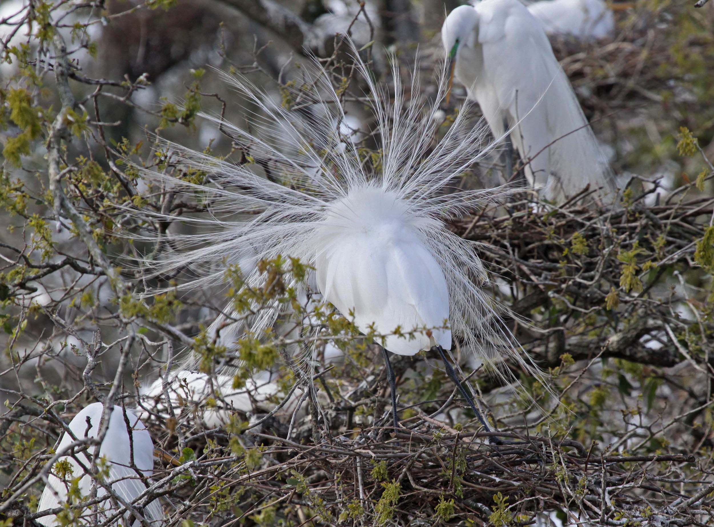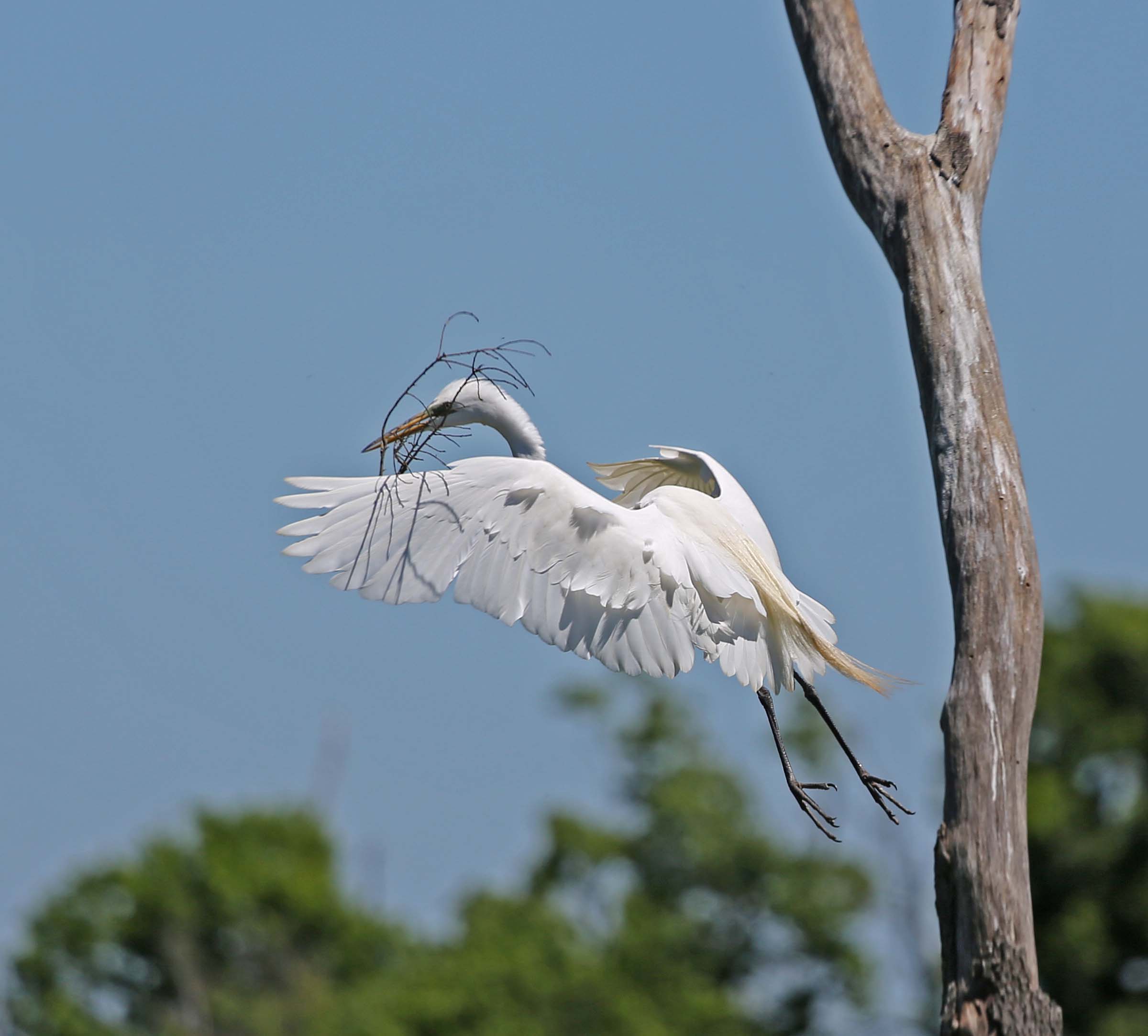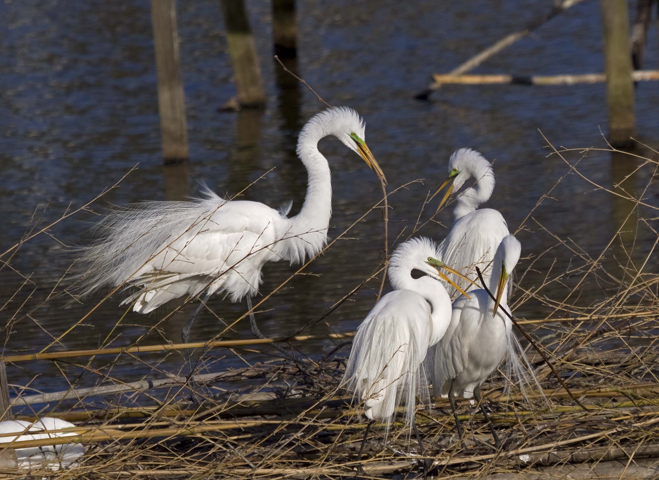 Great Egrets are also called Great White Egrets and are found in all the continents except Antarctica. They are the symbol of the National Audubon Society. They feed on fish, frogs, or insects by spearing them with their long bill. Both sexes are similar. In the breeding season (Feb-July), the tail feathers are longer.