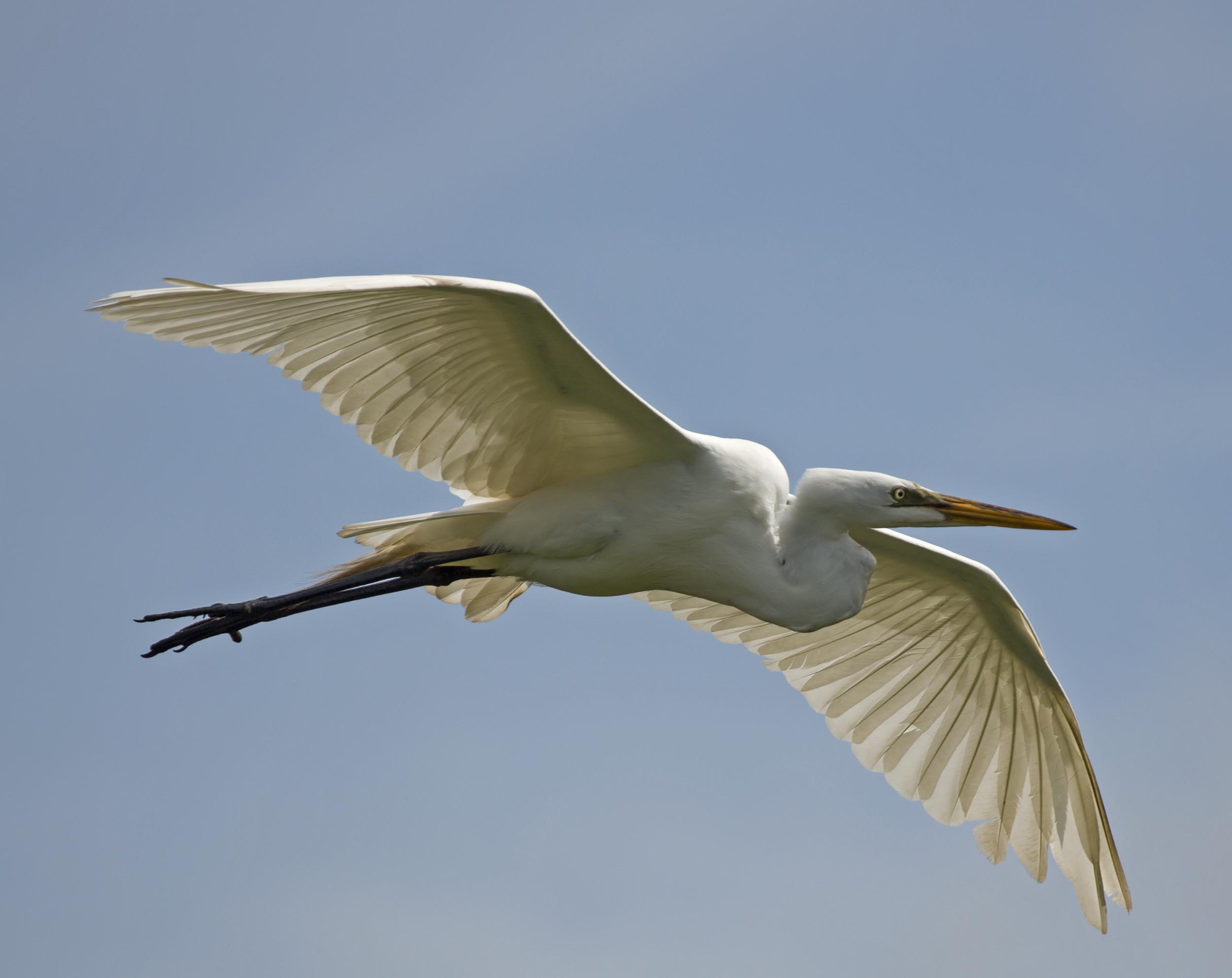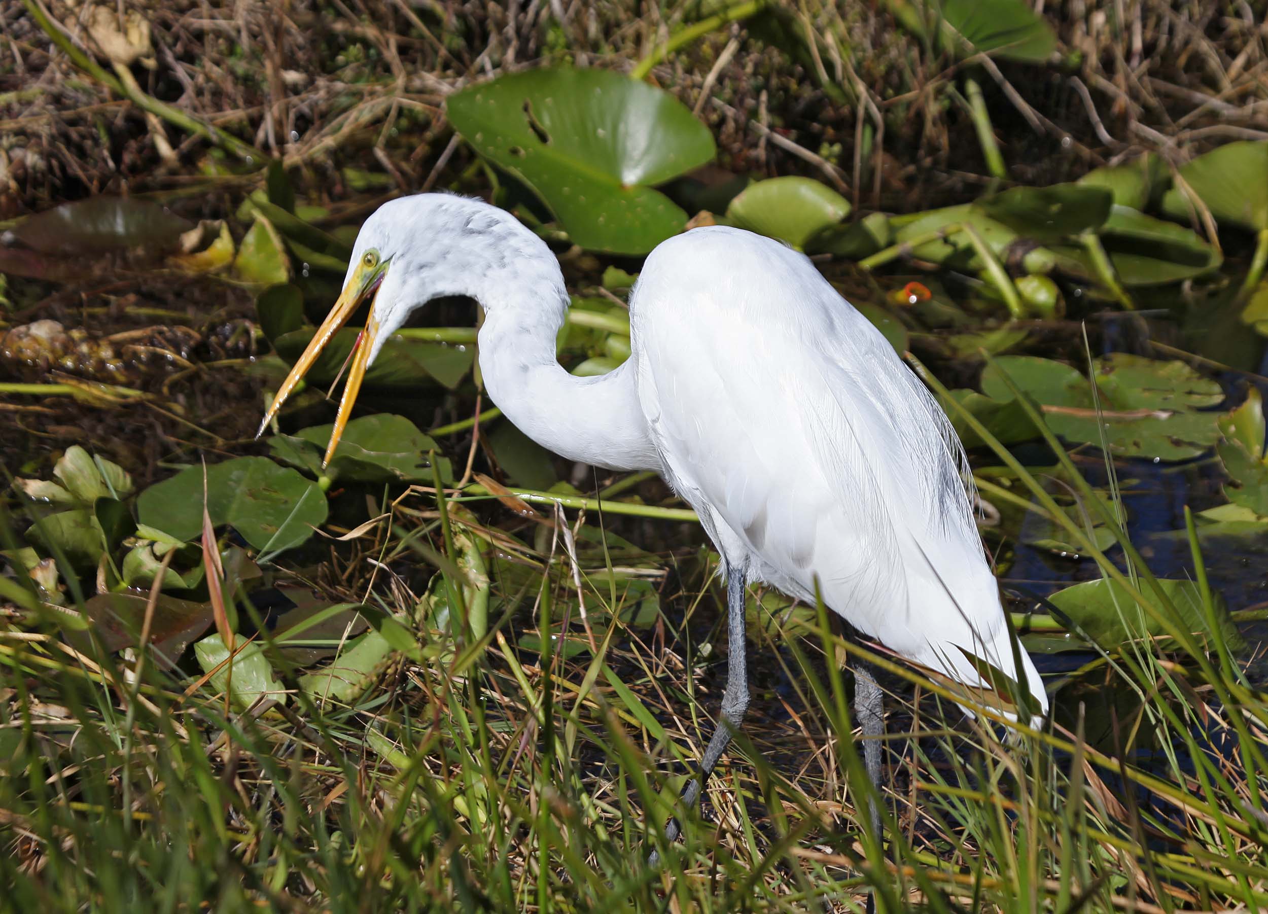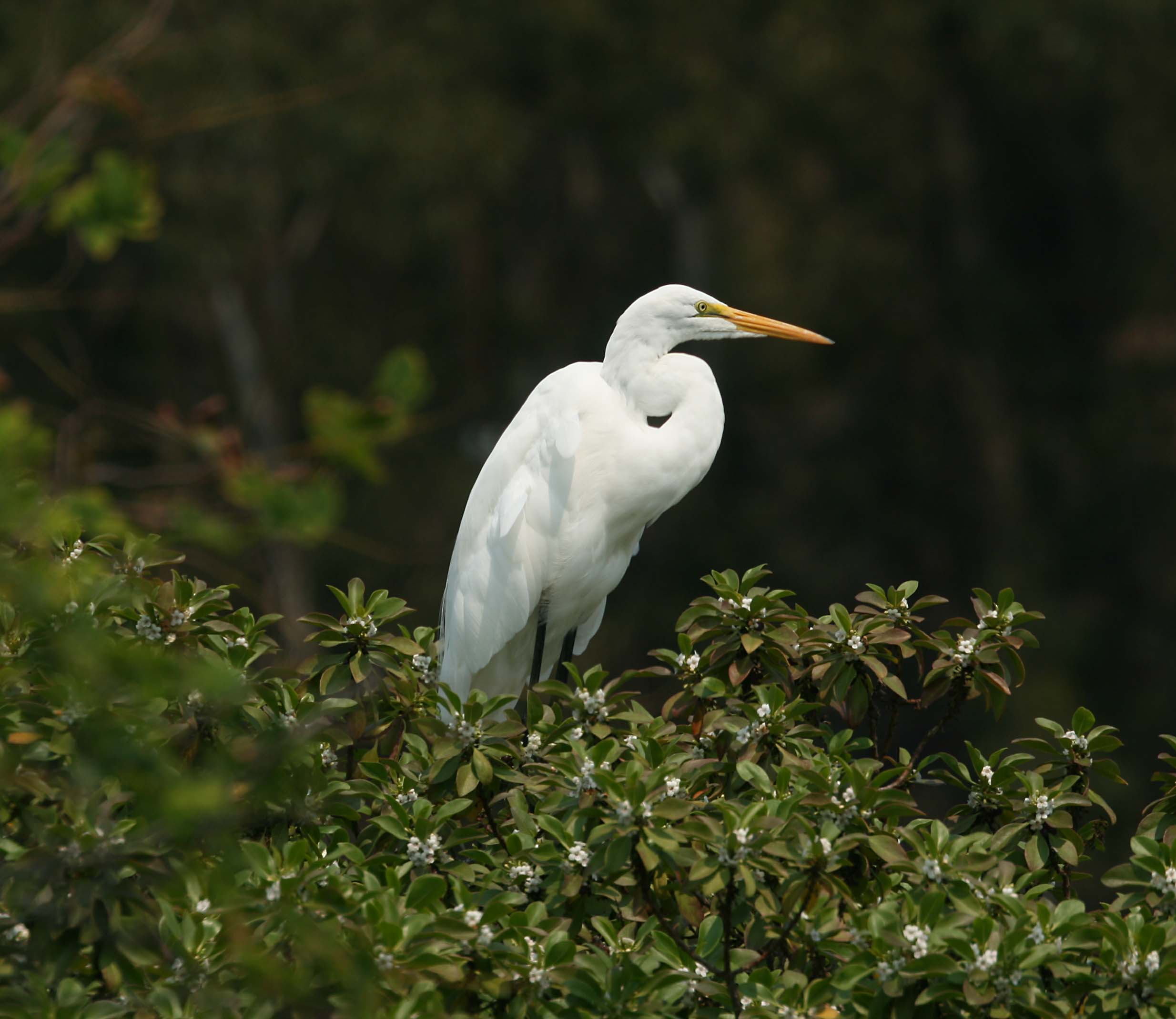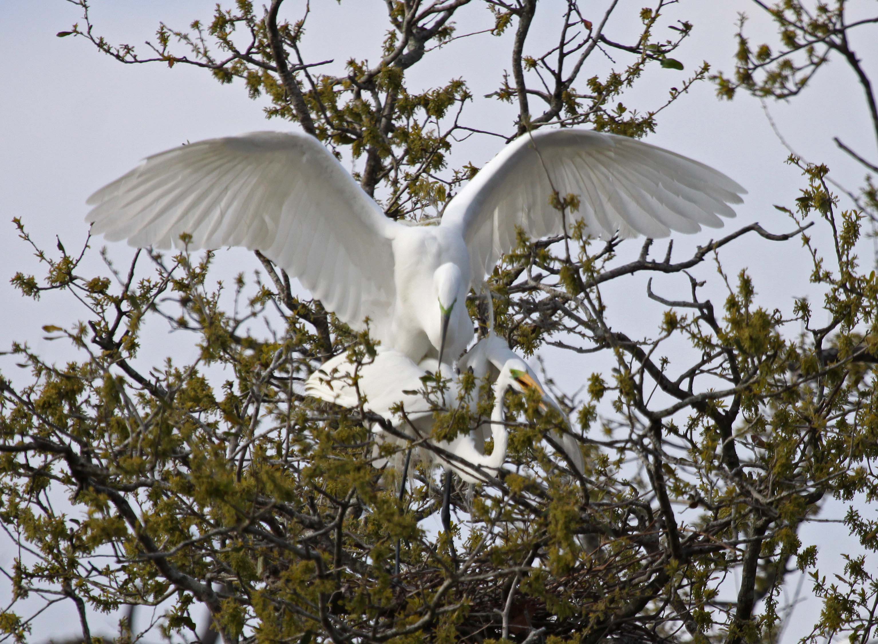 Great Egrets are also called Great White Egrets and are found in all the continents except Antarctica. They are the symbol of the National Audubon Society. They feed on fish, frogs, or insects by spearing them with their long bill. Both sexes are similar. In the breeding season (Feb-July), the tail feathers are longer.