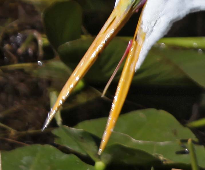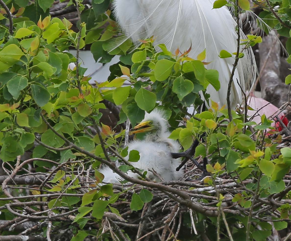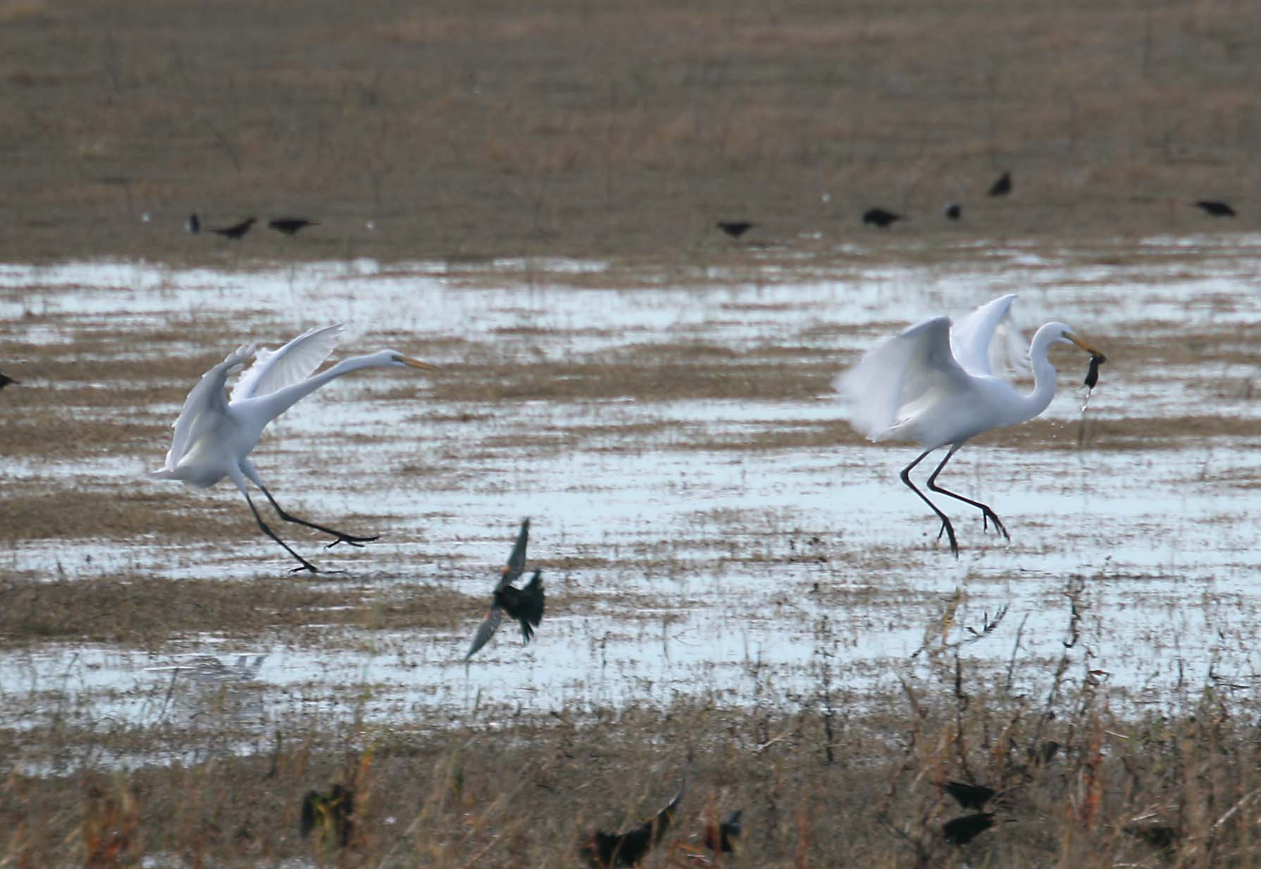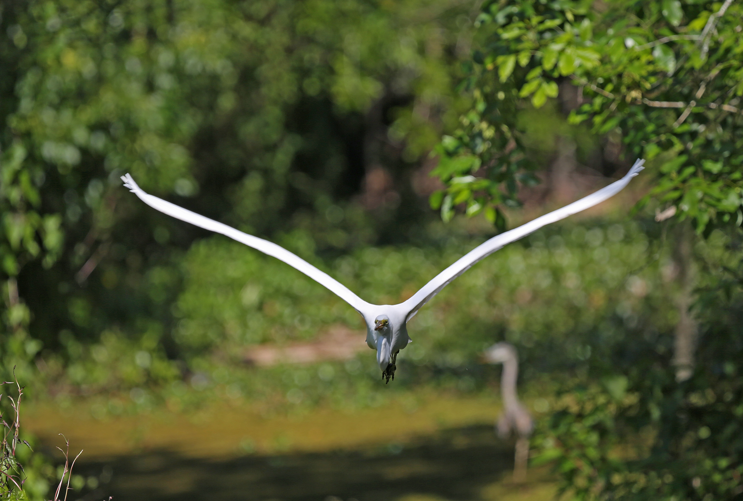 Great Egrets are also called Great White Egrets and are found in all the continents except Antarctica. They are the symbol of the National Audubon Society. They feed on fish, frogs, or insects by spearing them with their long bill. Both sexes are similar. In the breeding season (Feb-July), the tail feathers are longer.