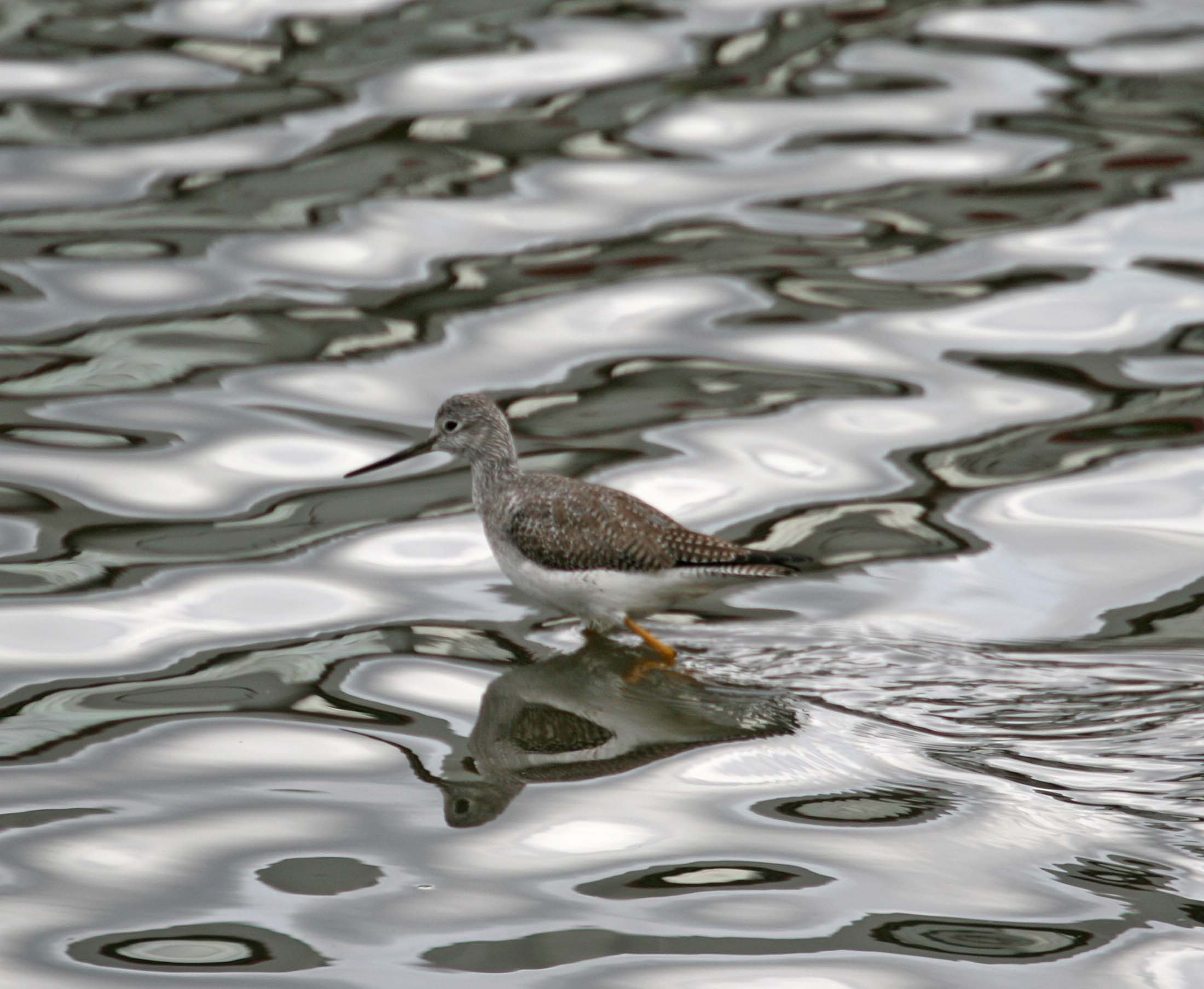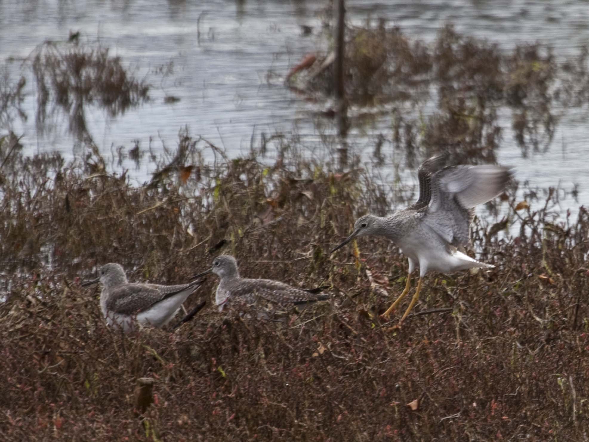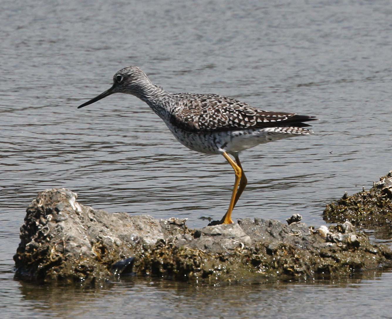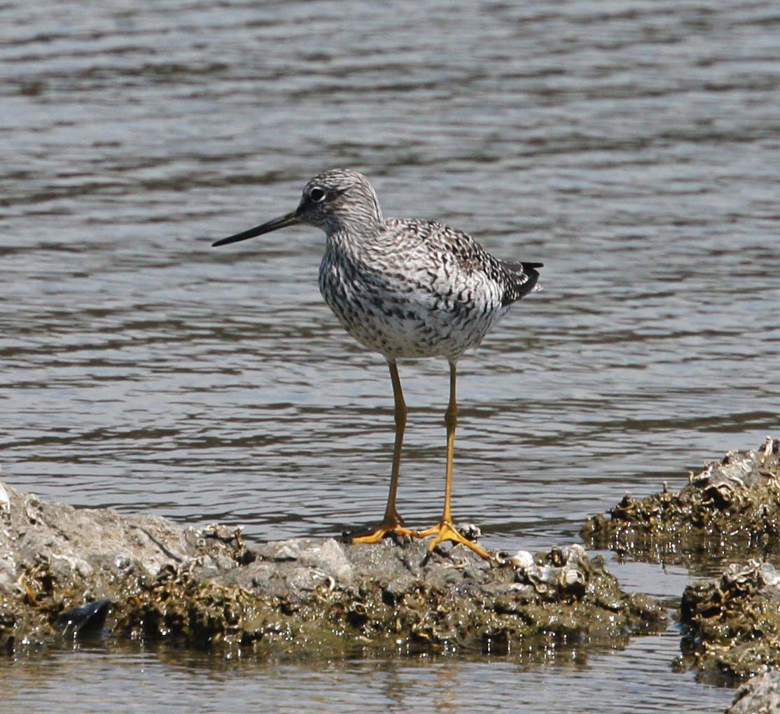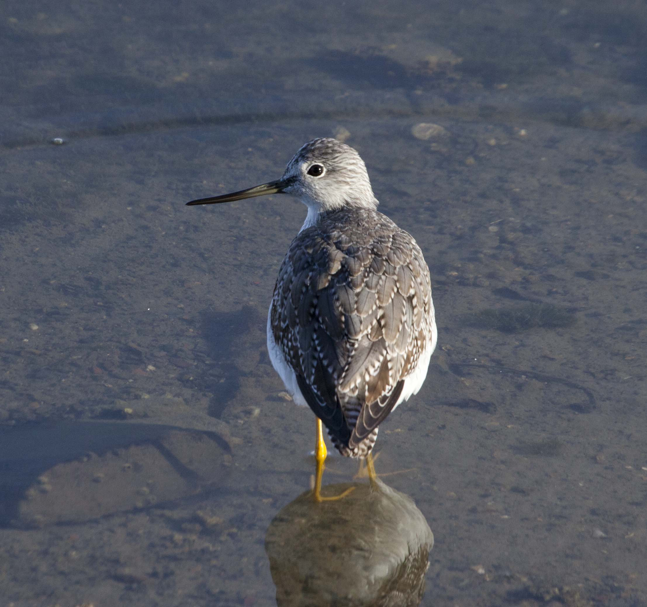 The Greater Yellowlegs breeds in Canada and Alaska and winter from southern U.S. to the tip of South America. A distinguishing characteristic of the Greater Yellowlegs is their long yellow legs. They bob the front part of their body up and down. They are more common in the Bay Area than their counterpart, the Lesser Yellowlegs.