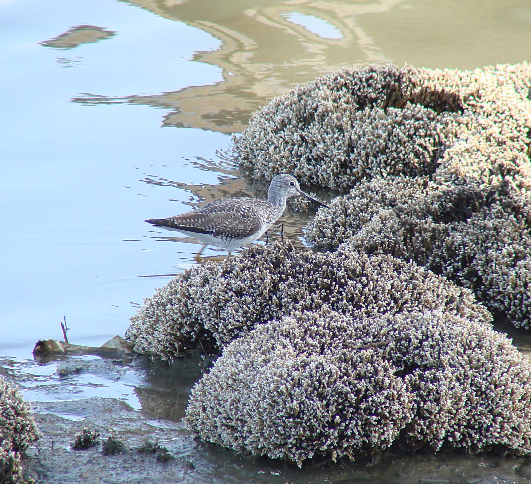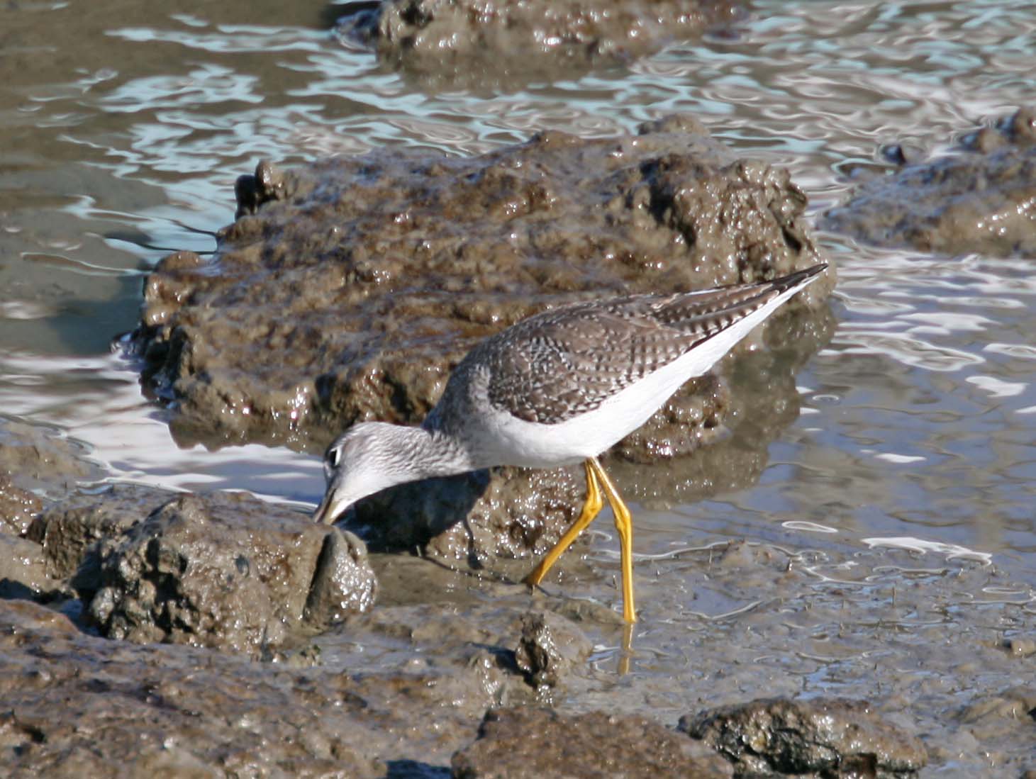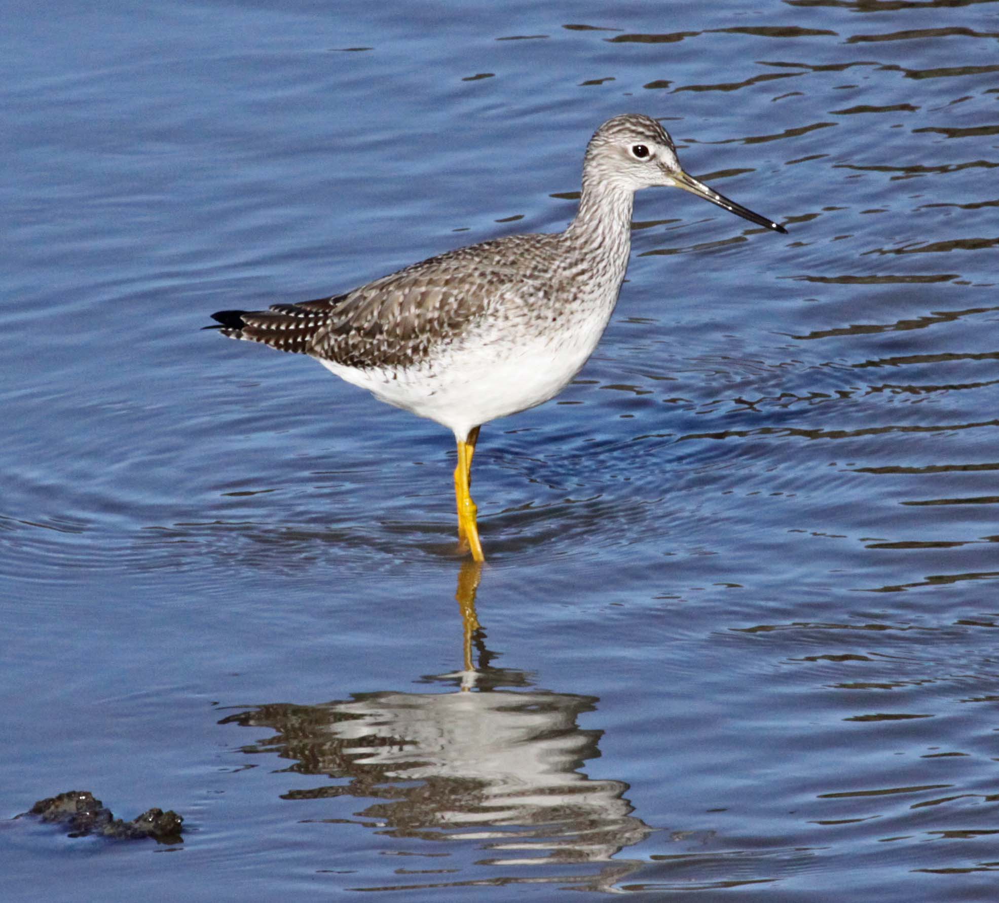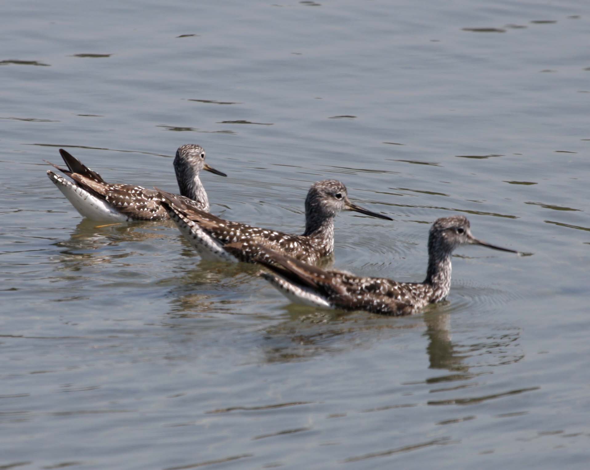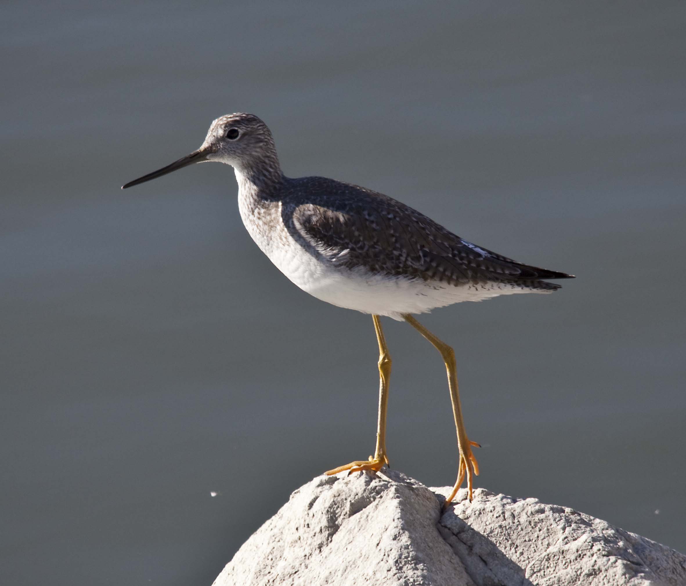 The Greater Yellowlegs breeds in Canada and Alaska and winter from southern U.S. to the tip of South America. A distinguishing characteristic of the Greater Yellowlegs is their long yellow legs. They bob the front part of their body up and down. They are more common in the Bay Area than their counterpart, the Lesser Yellowlegs.