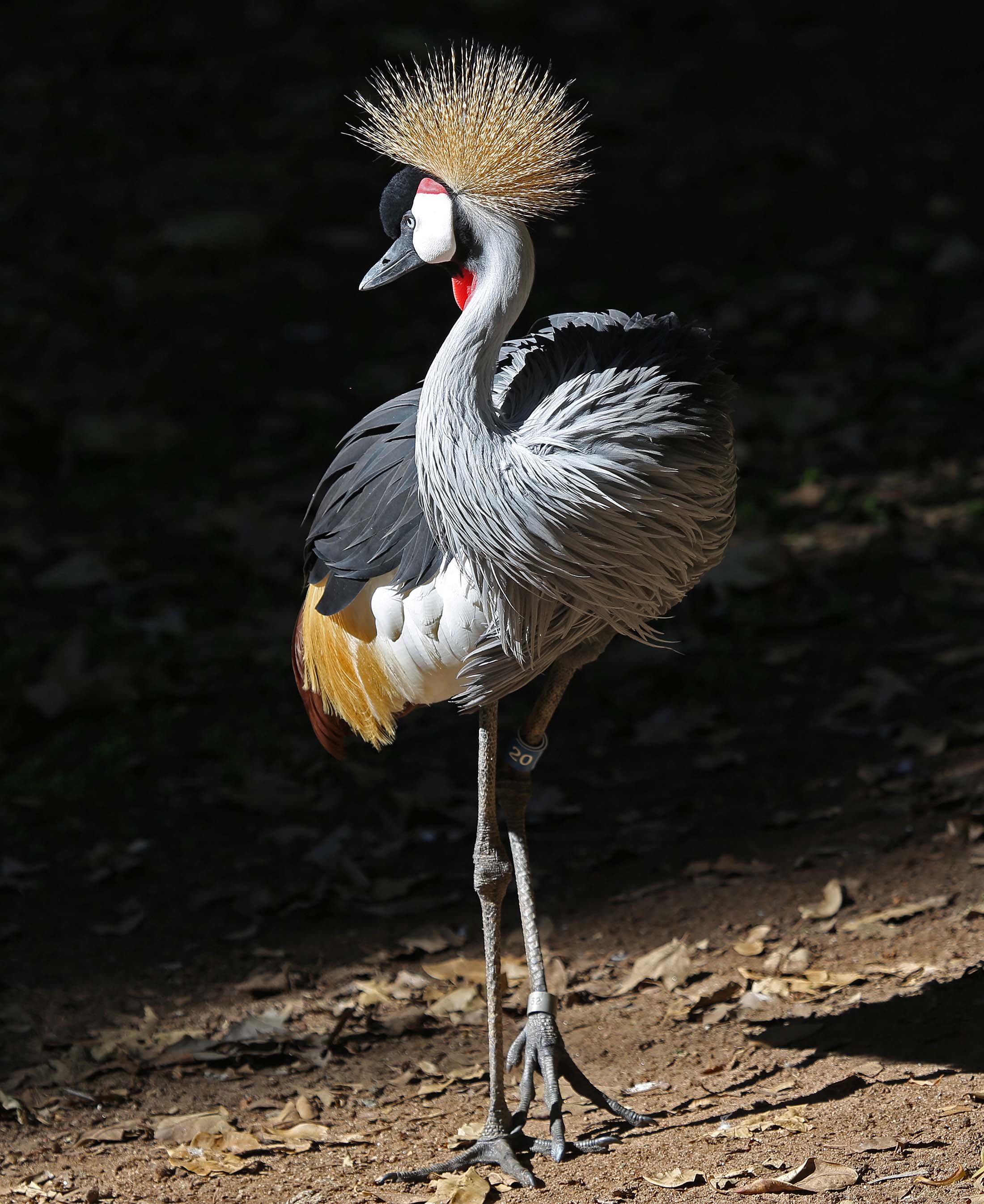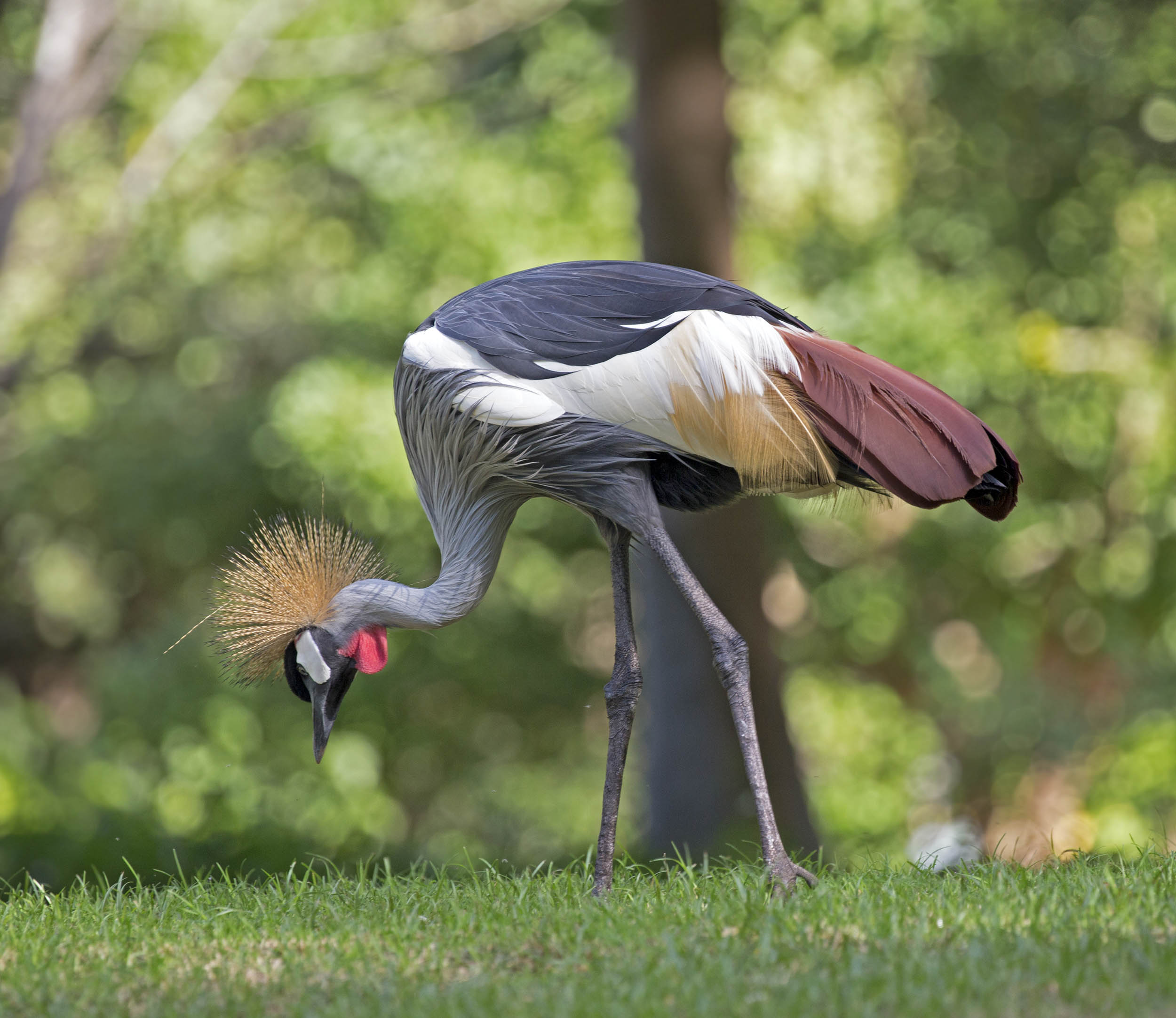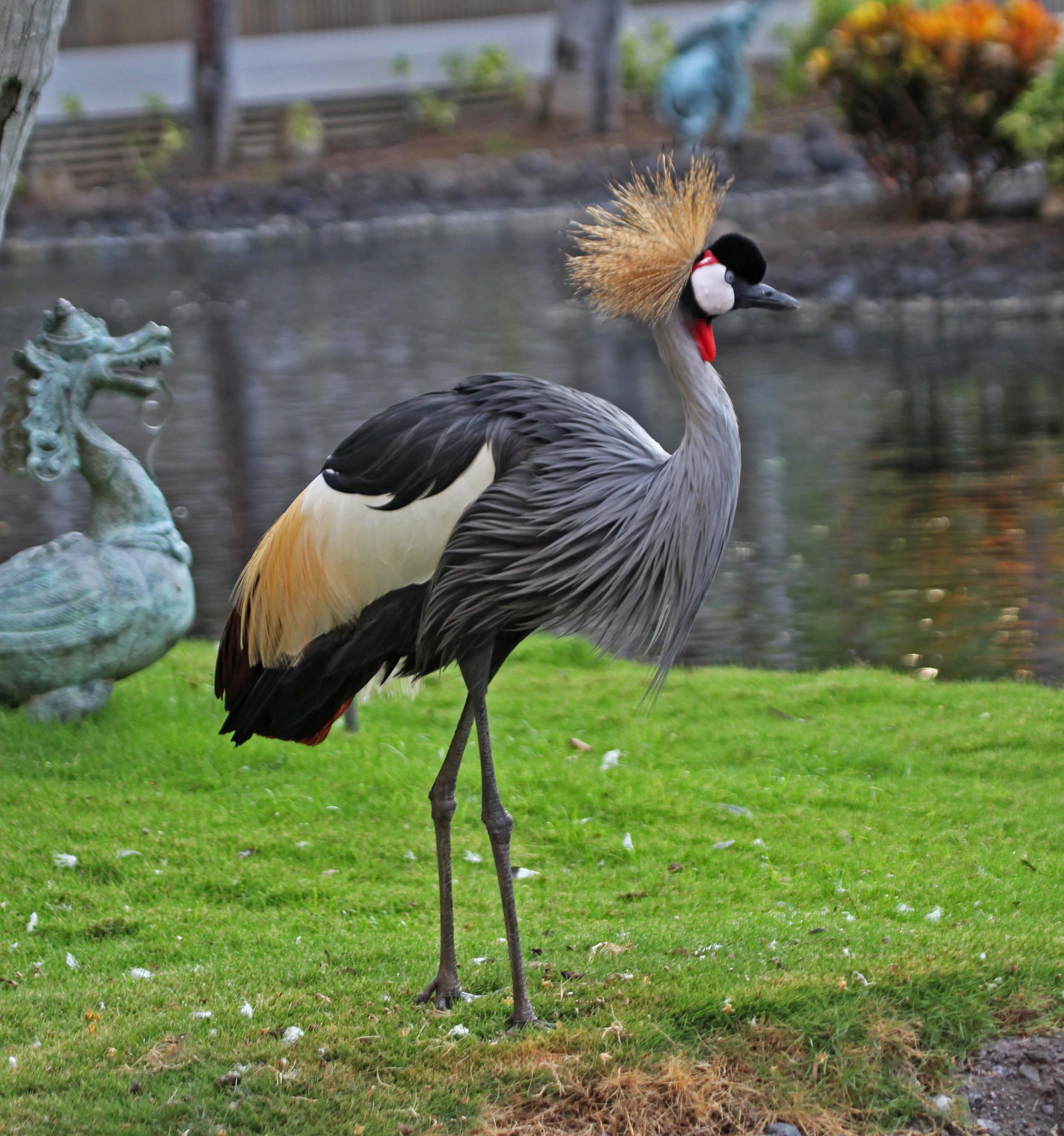 The Grey Crowned Crane is also known as the East African Crowned Crane. They are found in Africa and they are the national bird of Uganda and features in the country's flag and coat of arms. They are very similar to the Black Crowned Crane. There are two subspecies of Grey Crowned crane: the more abundant East African Grey Crowned Crane (Balearica regulorum gibbericep) and the South African Grey Crowned Crane (Balearica regulorum regulorum). (I only have pictures of the East African subspecies.) The two subspecies can be visually distinguished from each other by the size of the red skin above the white cheeks. The Eastern subspecies has a larger bare patch of red facial skin above the white cheek patch. Sexes are similar in each subspecies.