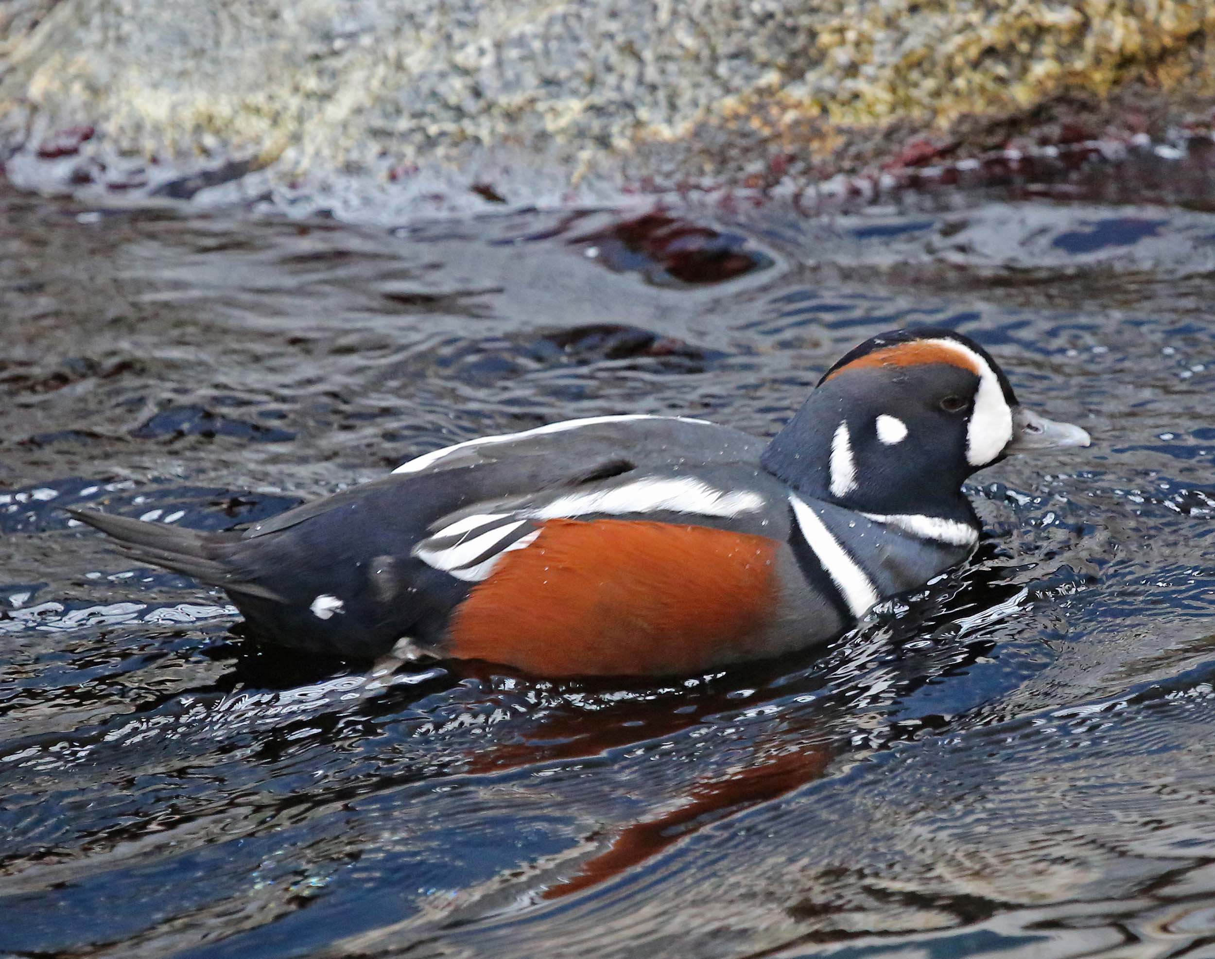 The Harlequin Duck is a small sea duck. They are definitely one of the most beautiful ducks in the world. They are mostly found on the coasts of Asia, North America, Greenland, and Iceland. In North America they breed near cold fast moving streams on both coasts. They eat mollusks, crustaceans and insects.