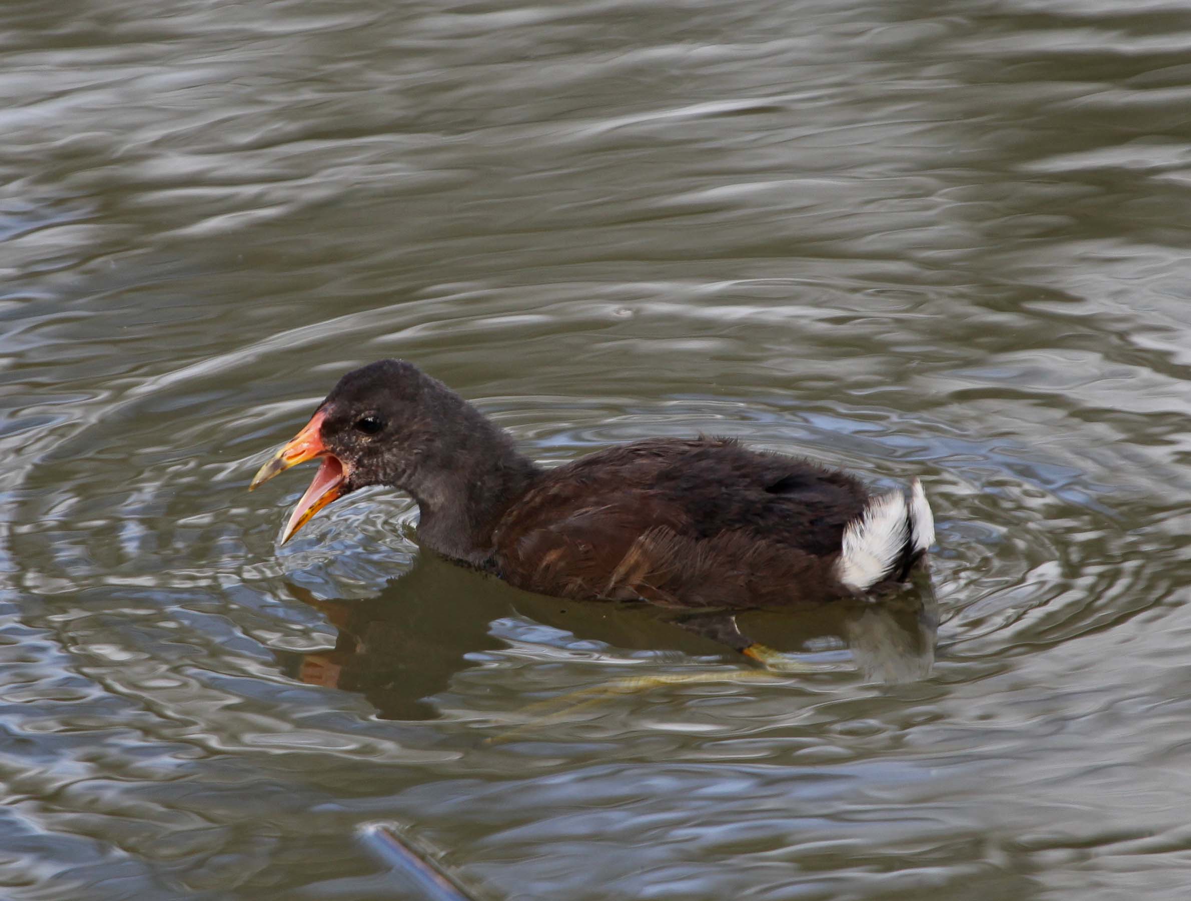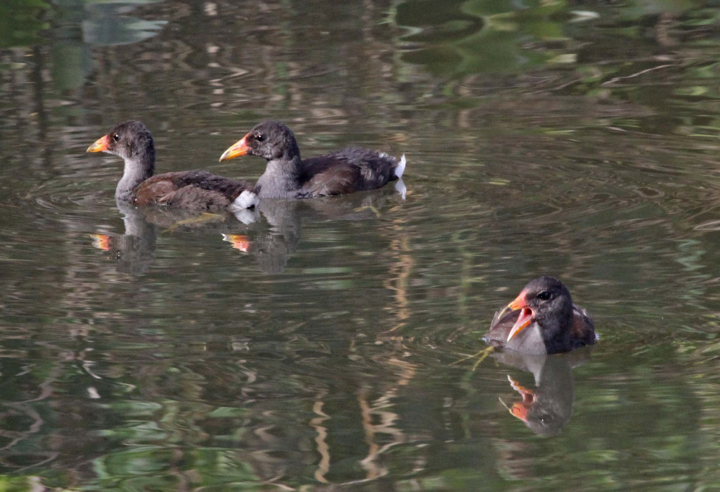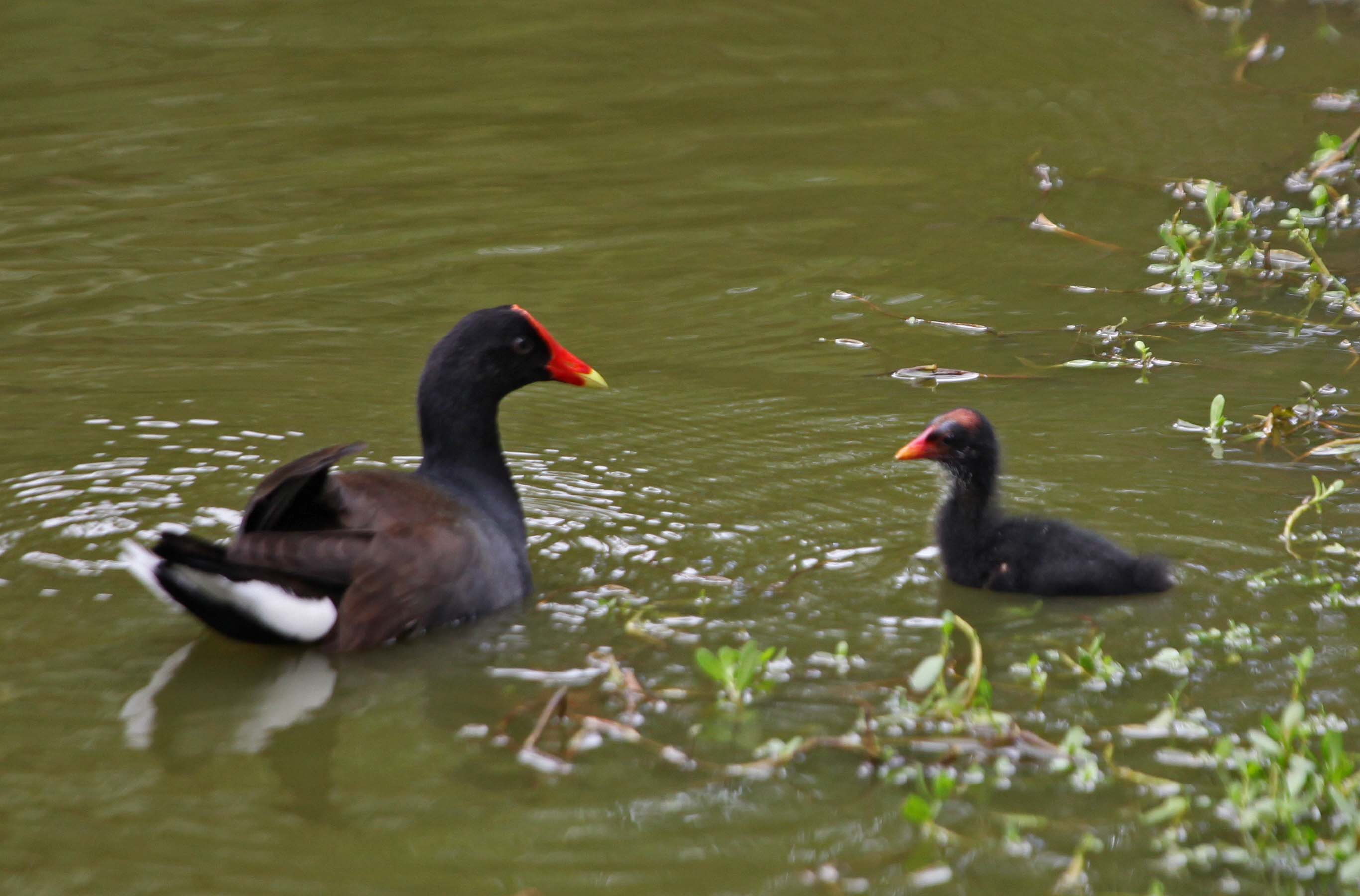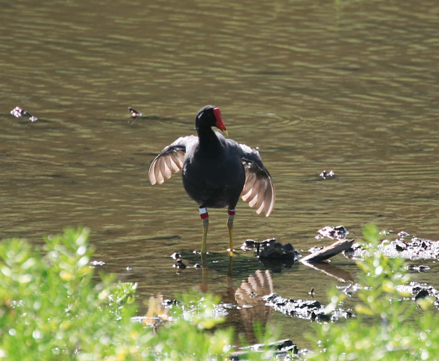 A subspecies of the Common Moorhen, the Hawaiian Moorhen or 'Alae "Ula can be found on Kaua'i and O'ahu. According to Hawaiian mythology, a moorhen brought fire to Humans, which explains the red on its forehead.