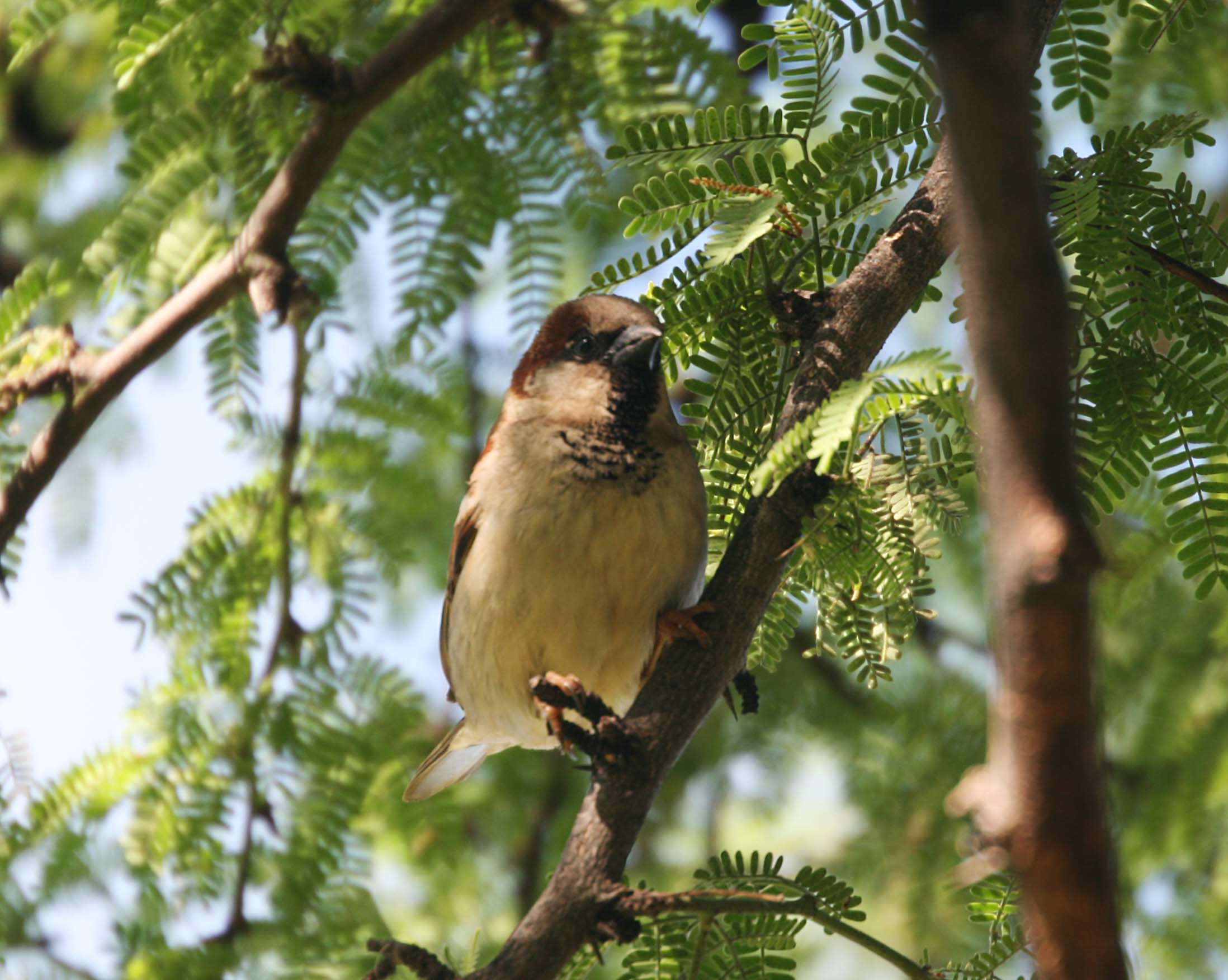 The House Sparrow is native to Europe and Asia but was introduced to the Americas, Australia, and Africa. Now they are a very common bird that coexists with humans very well. I frequently see them hopping in and out of house eaves.
