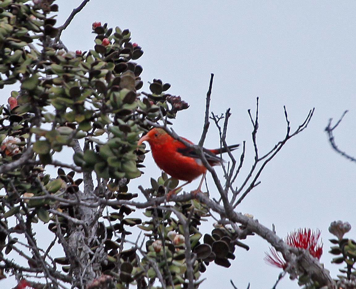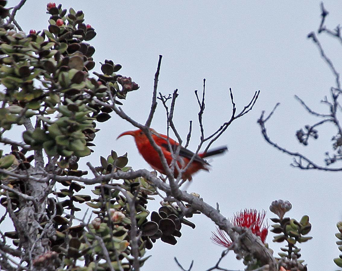 The Iiwi (`I`iwi) is a Hawaiian Honeycreeper that is found on most of the islands of Hawaii. The males and females have a red body, black wings and tail and their long decurved bill is salmon-colored. The male is slightly larger than the female. Juvenile bird plumage is more spotted and golden with ivory bills. They are known for being strong fliers who fly at relatively high elevations.