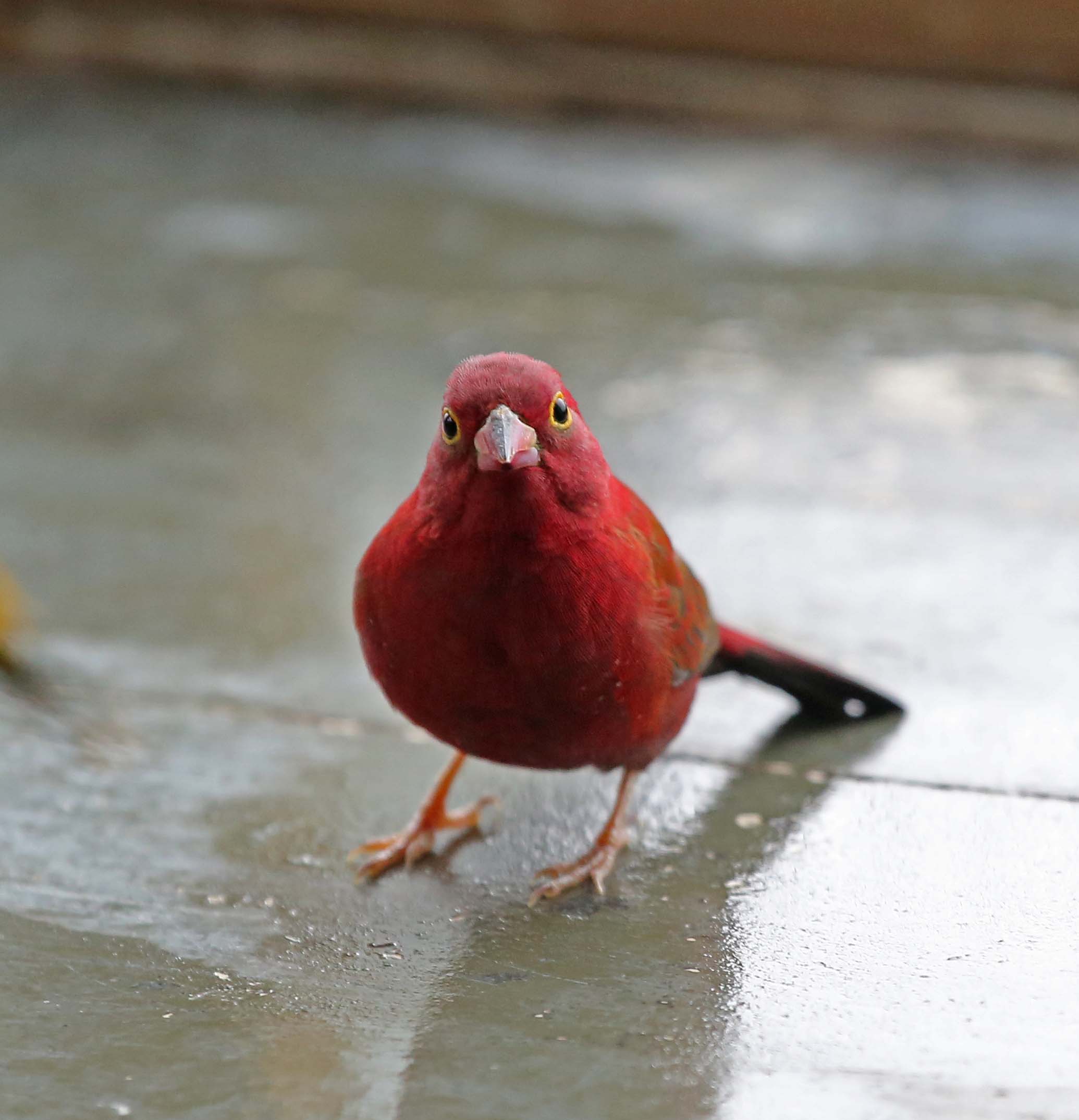 Jameson's Firefinch is found in sub-Saharan Africa. Males are reddish with a brown crown, nape, wings and tail feathers. Females have more brown on the face and the red is more pinkish. The diet is mostly seeds but insects, including termites, are also eaten.