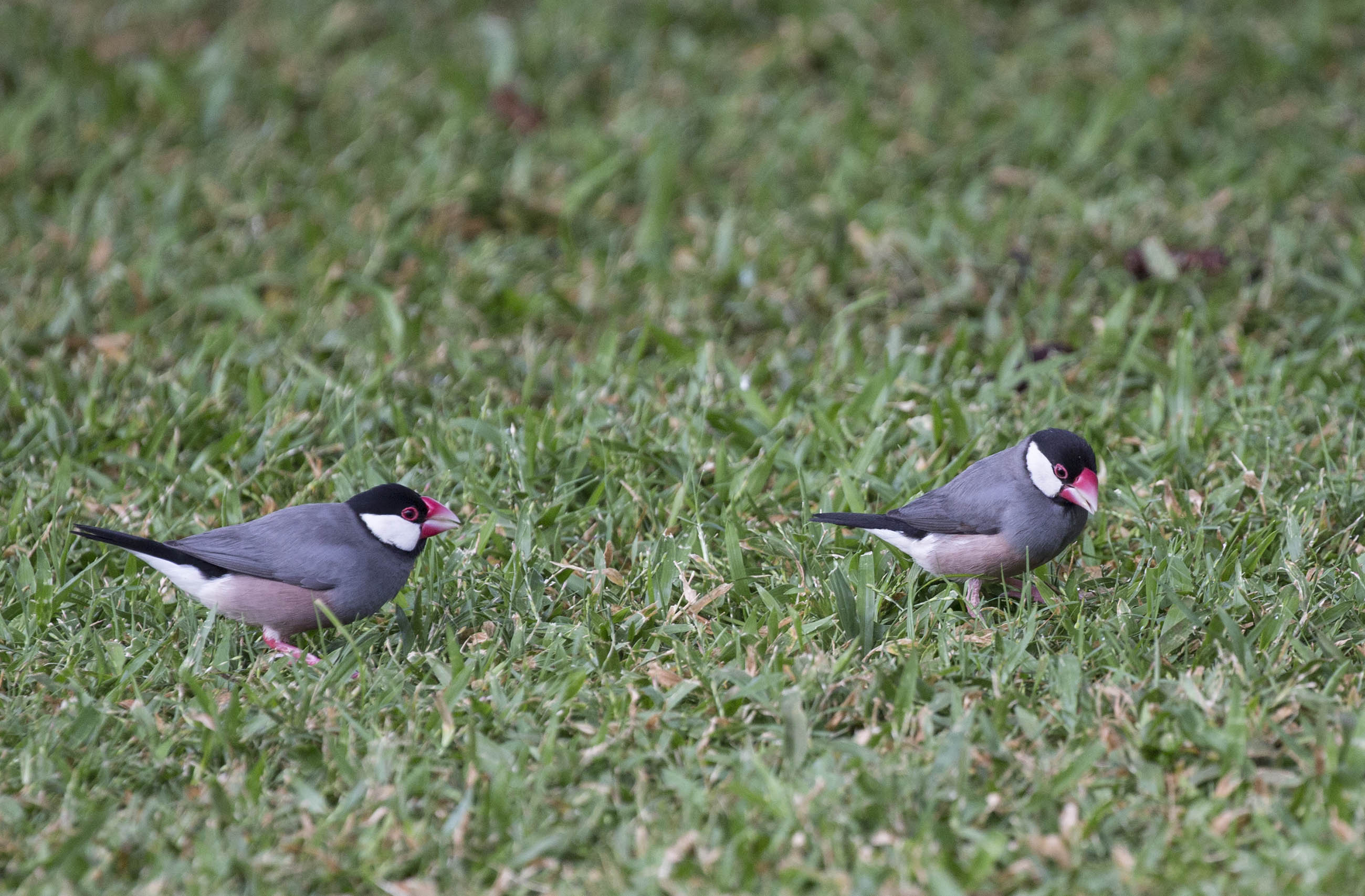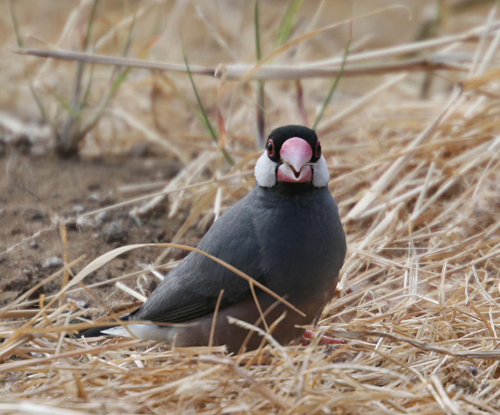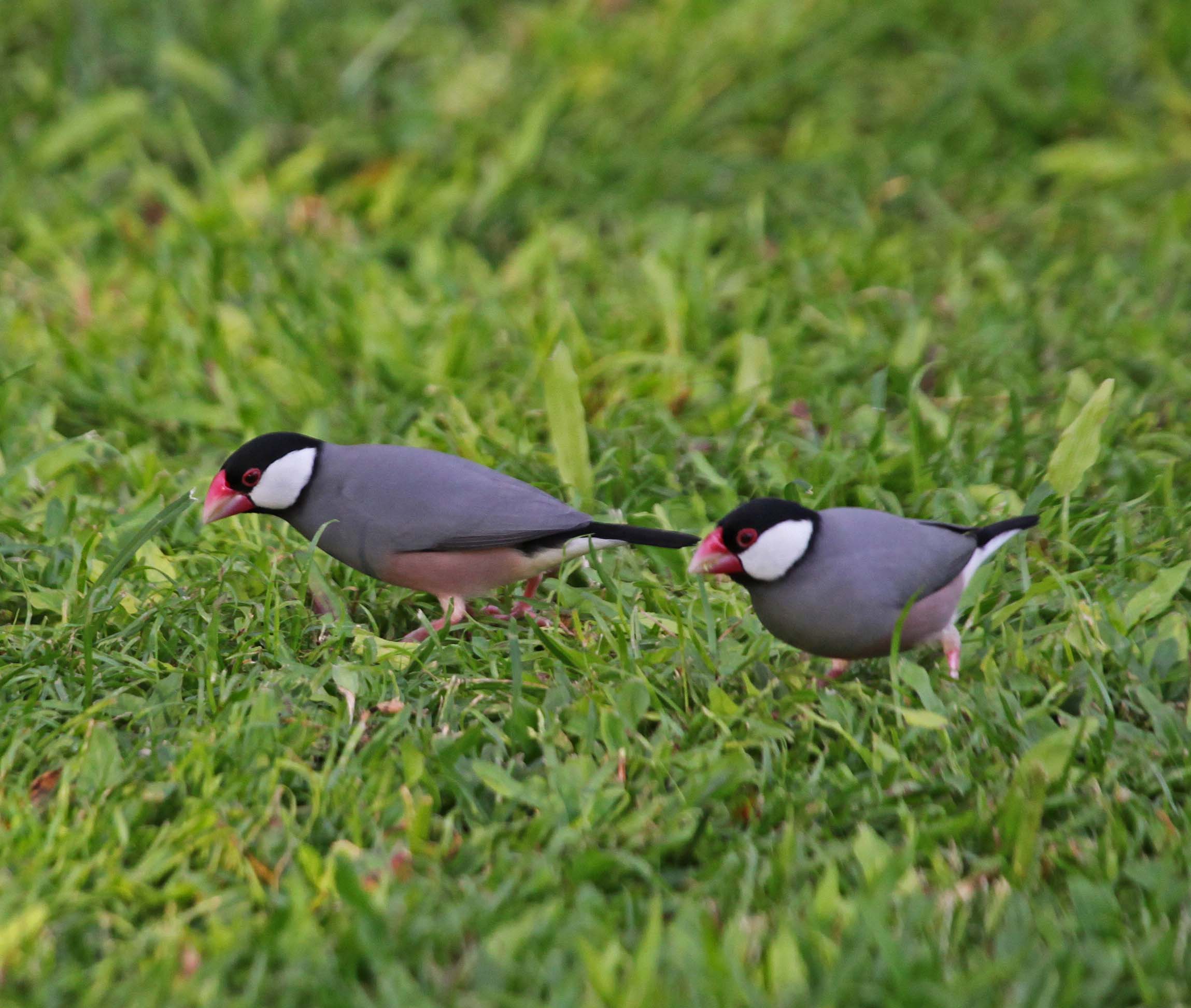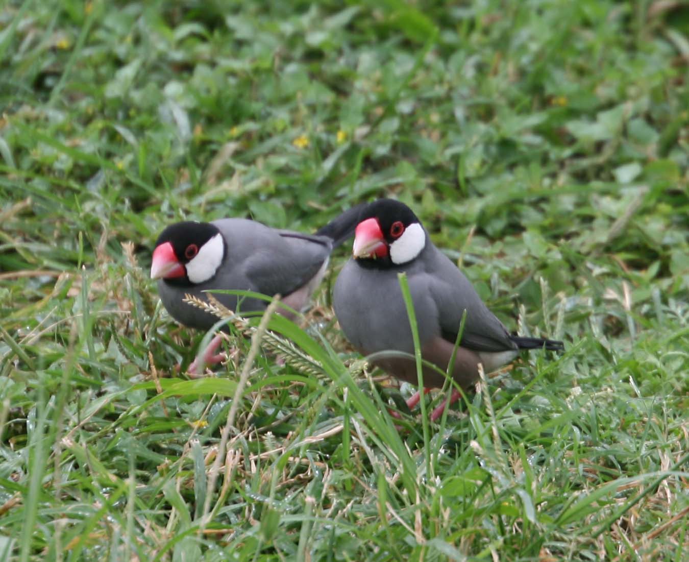 The Java Sparrow is from Indonesia. This Sparrow has been introduced to other places, such as India, Hawaii, and Christmas Island, off the coast of Western Australia. They have a massive bill and their white cheeks are quite noticeable.