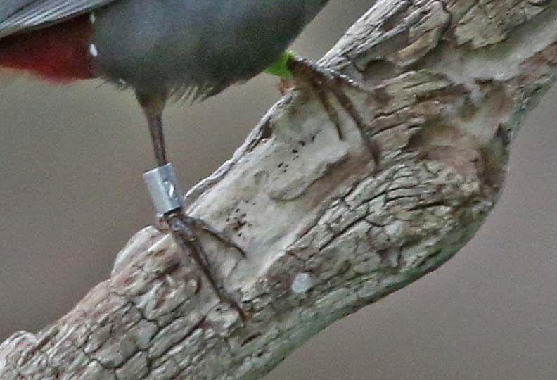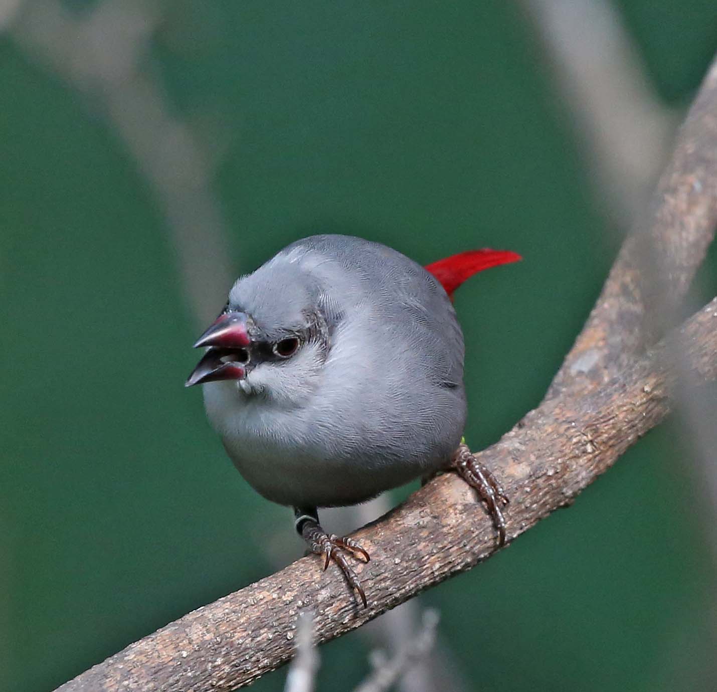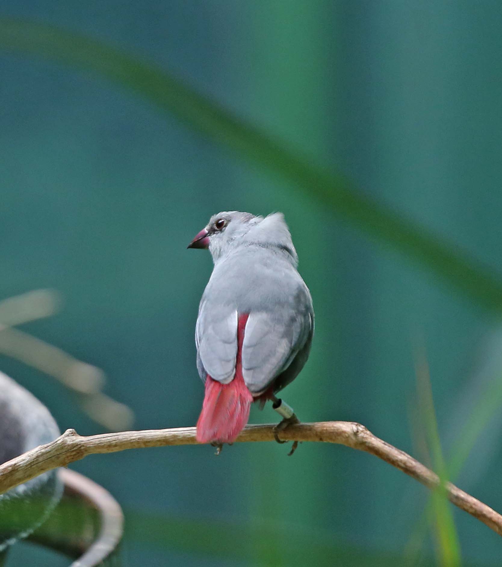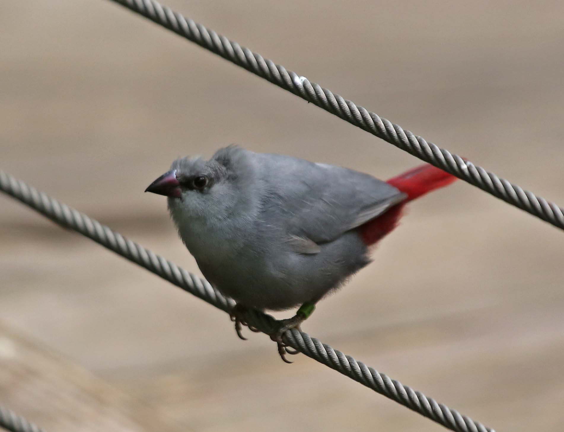 The Lavender Waxbill is found in subtropical/tropical dry shrublands in West Africa and have been introduced to Hawaii. Their body is mostly gray, the face has a black eyestripe, flanks have a few small white spots, and the rump. tail and tail coverts are red. Bill is red to black, legs and feet are gray.