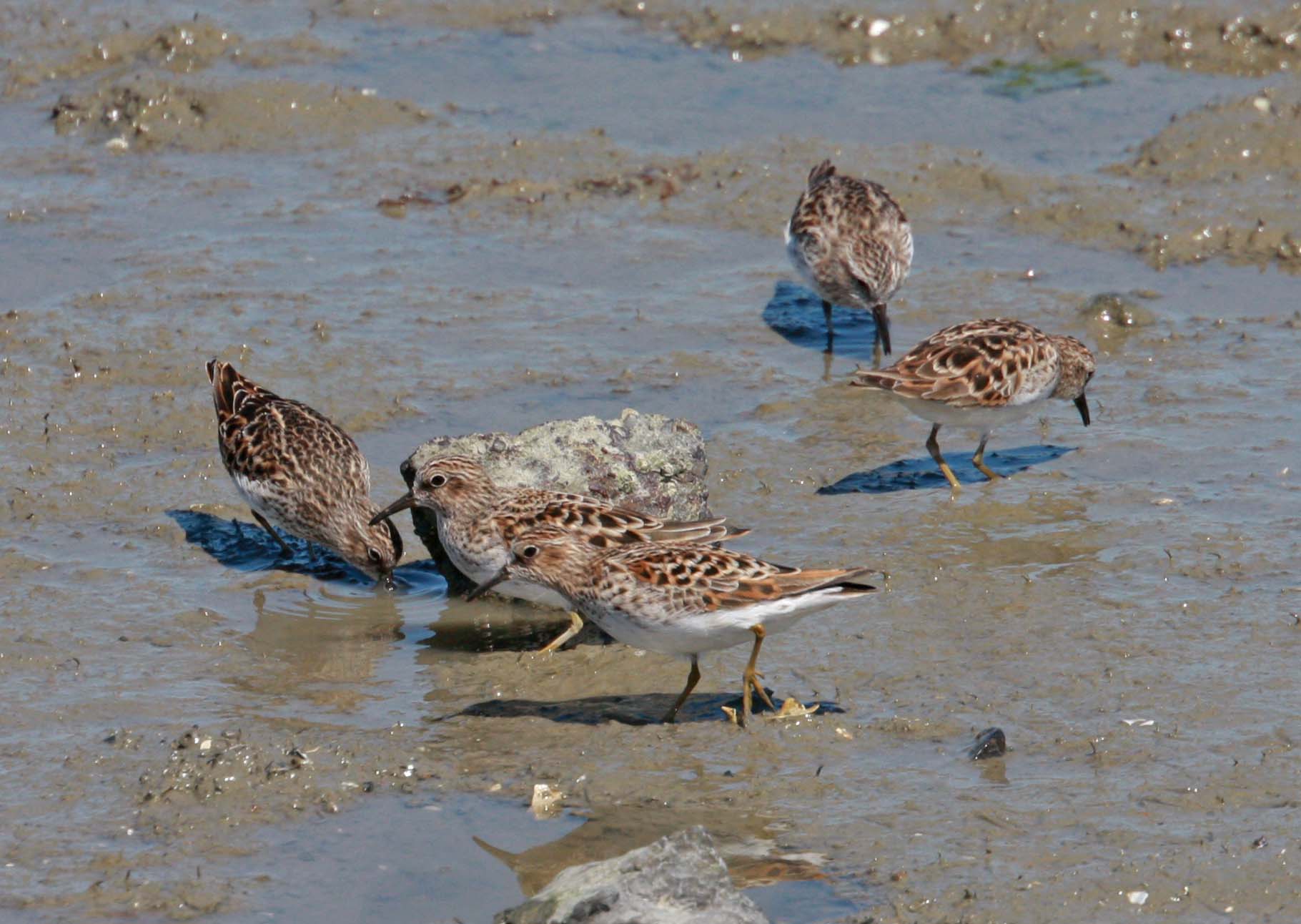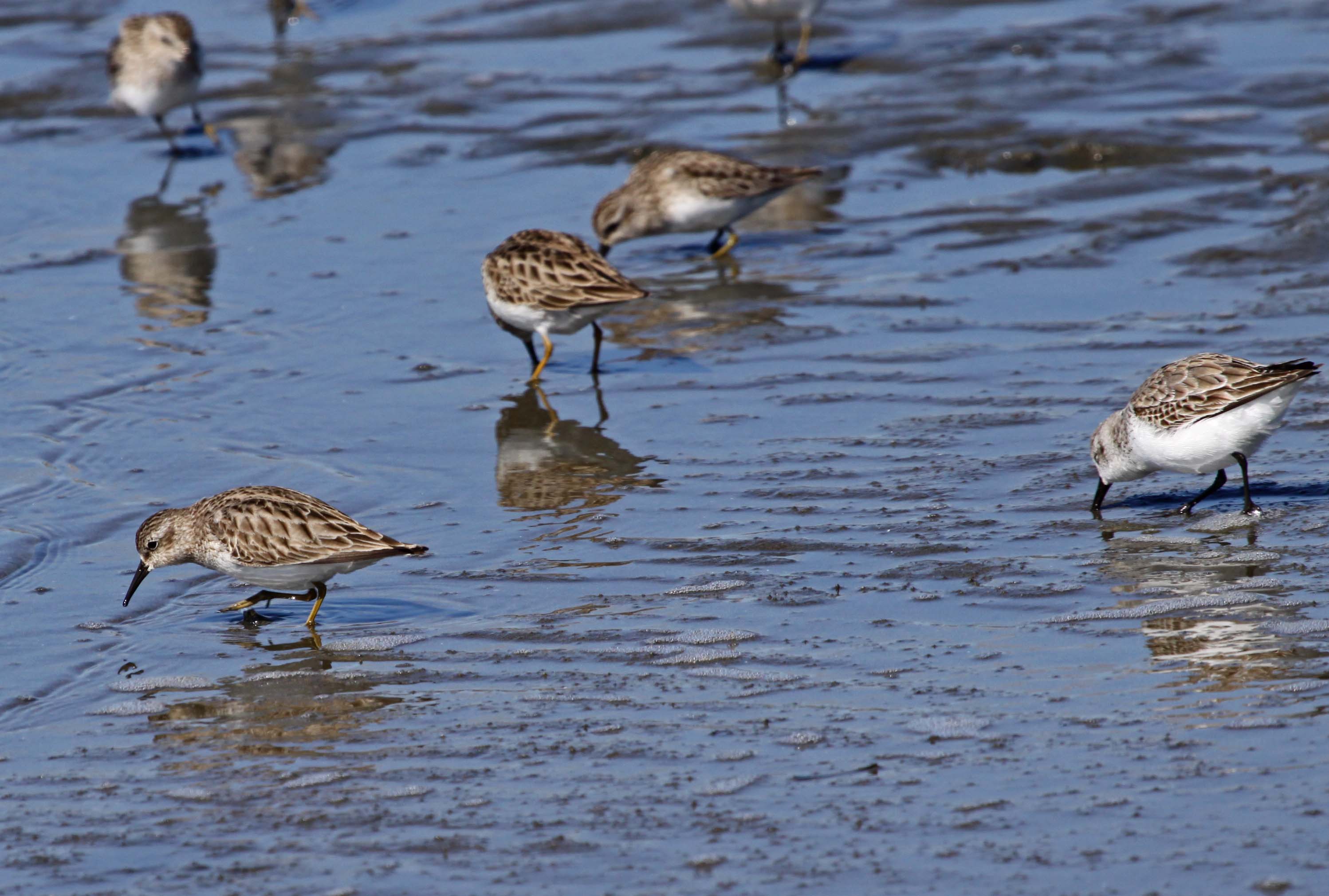 The Least Sandpiper is the smallest sandpiper in the world and it is breeds in Alaska and Canada and winters in southern North America to central South America. They are similar to Wester Sandpipers and can be identified by their yellow legs. Both sexes are similar and they forage on mudflats eating small crustaceans, insects and snails.
