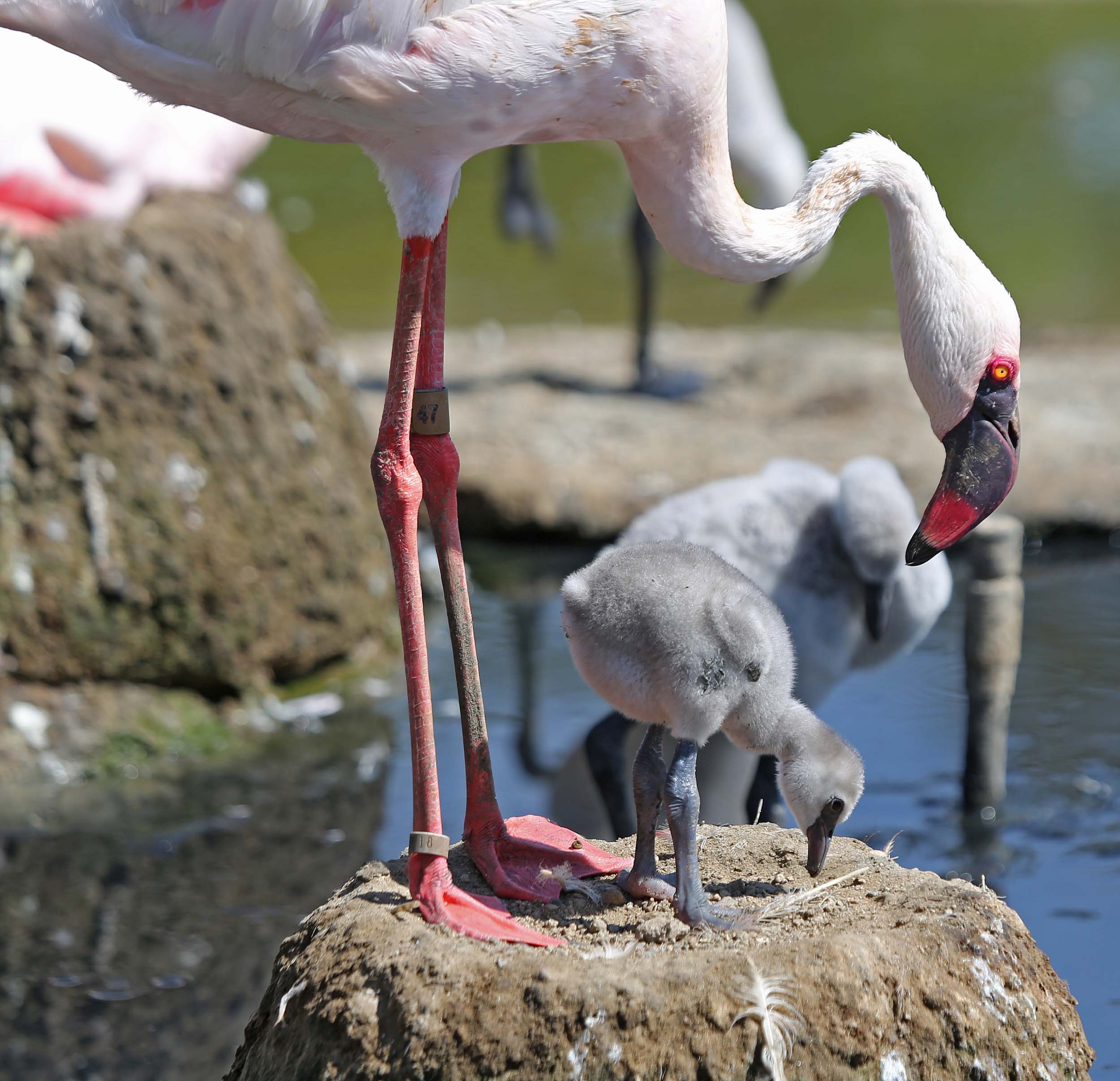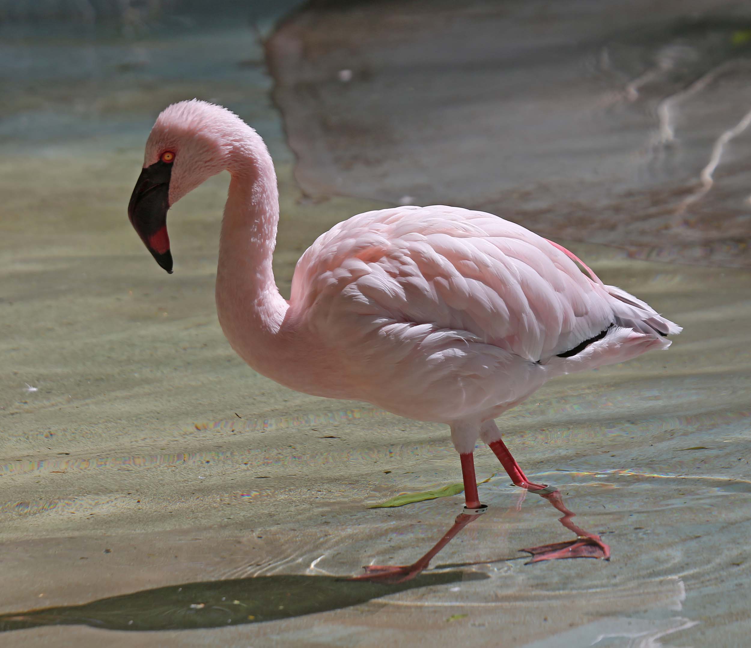 The Lesser Flamingo mainly resides in Africa with another population in India. They are the smallest species of flamingos. Most of the plumage is pinkish white and the bill is blacker than the Greater Flamingo.