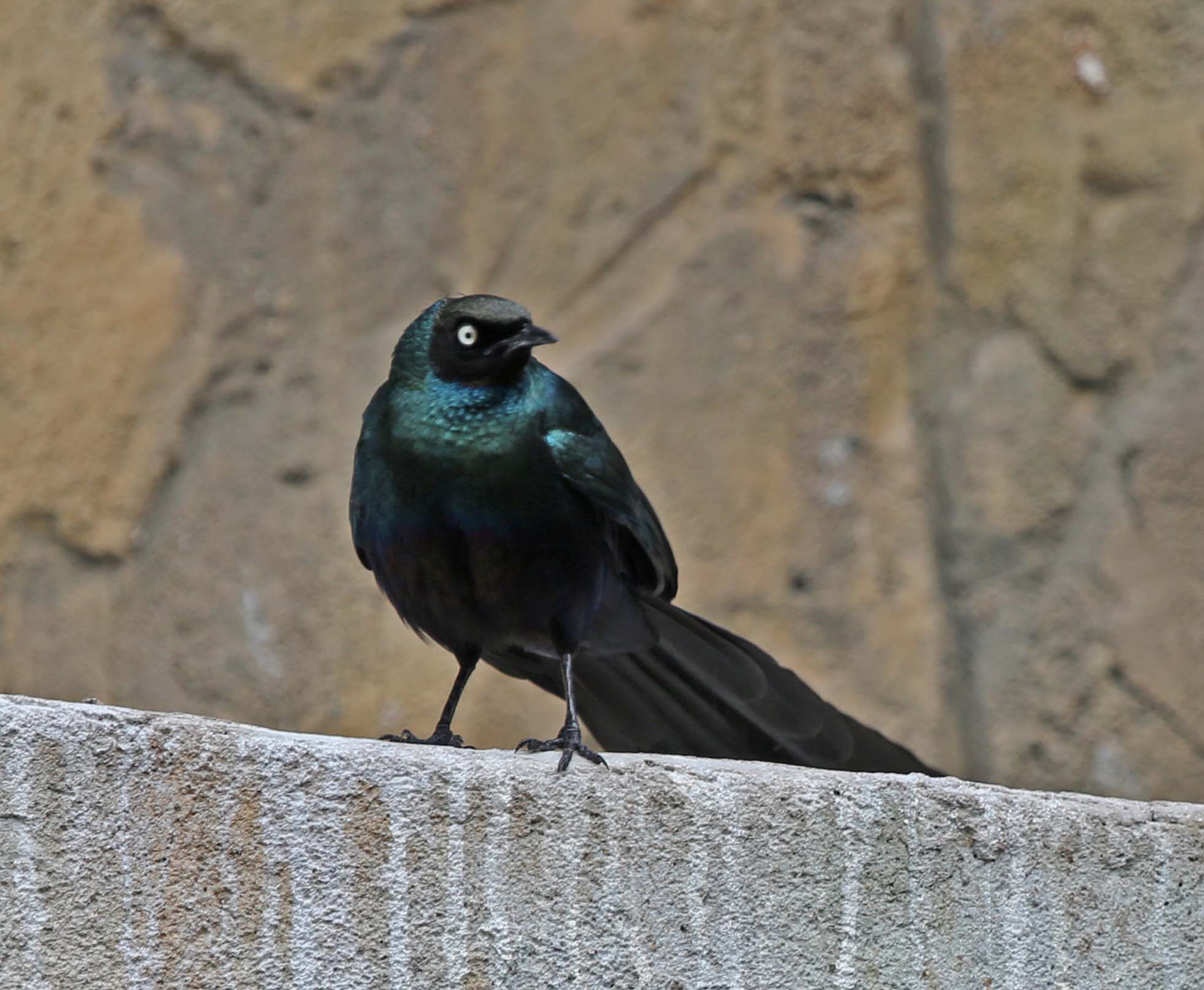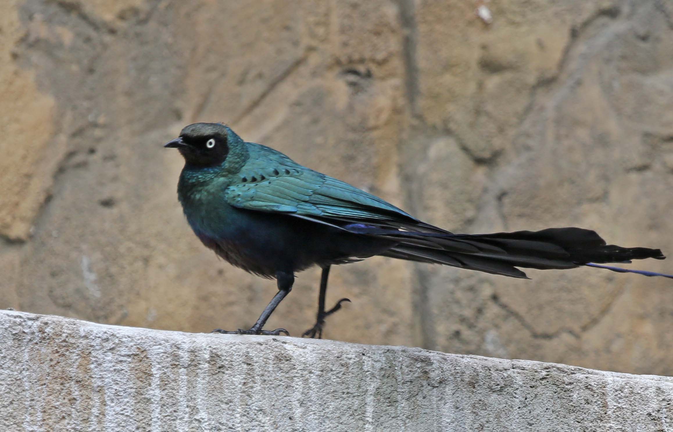 The Long-tailed Glossy Starling is found in tropical Africa from Senegal east to Sudan. The sexes are similar. They are mostly blue-green with a bronze sheen. The wings have prominent black spots and the tail has dark barring. The eyes are creamy colored and the legs and bill are black. The tail adds an additional 13.4 in (34 cm) to the length. Juveniles are duller with a more browish tone. They are noisy with a harsh grating call.