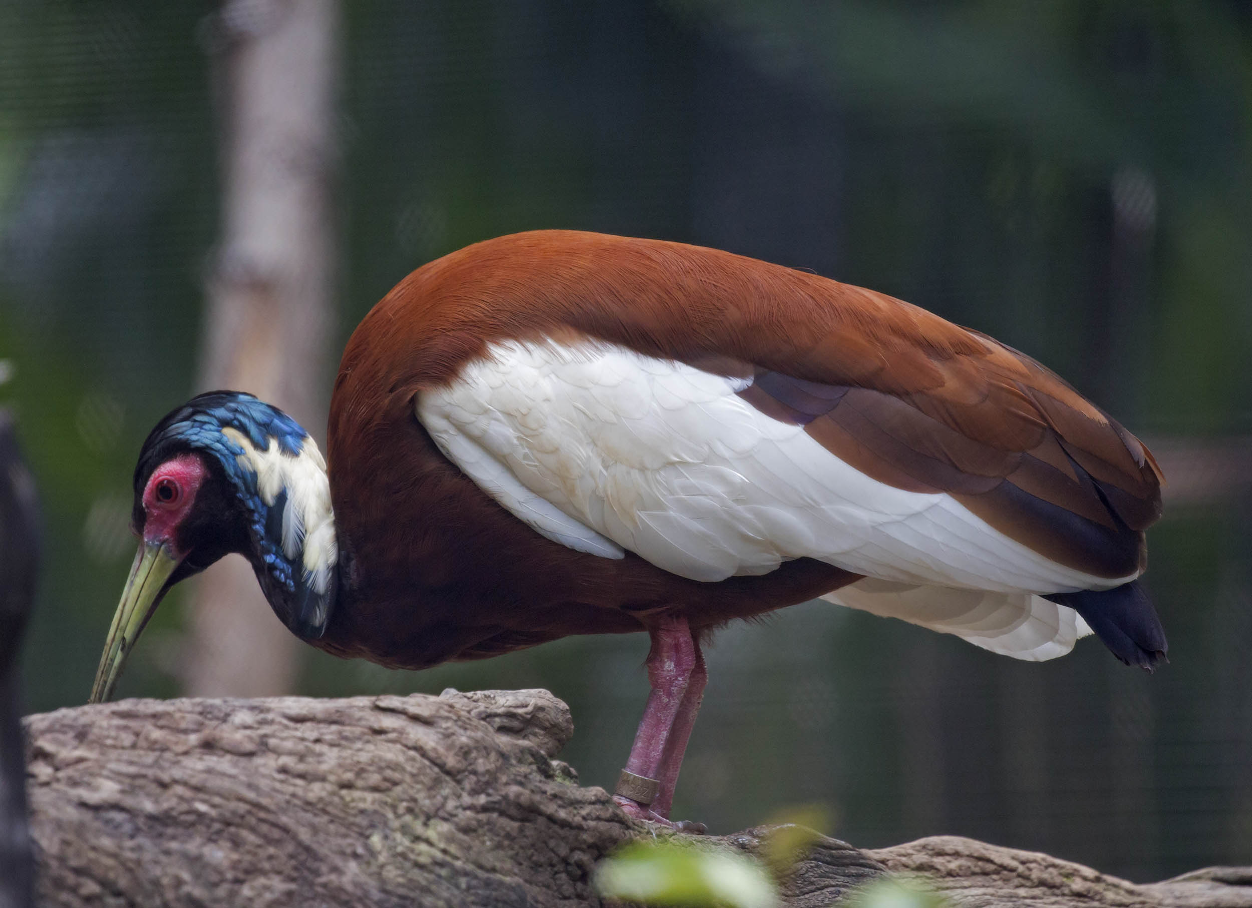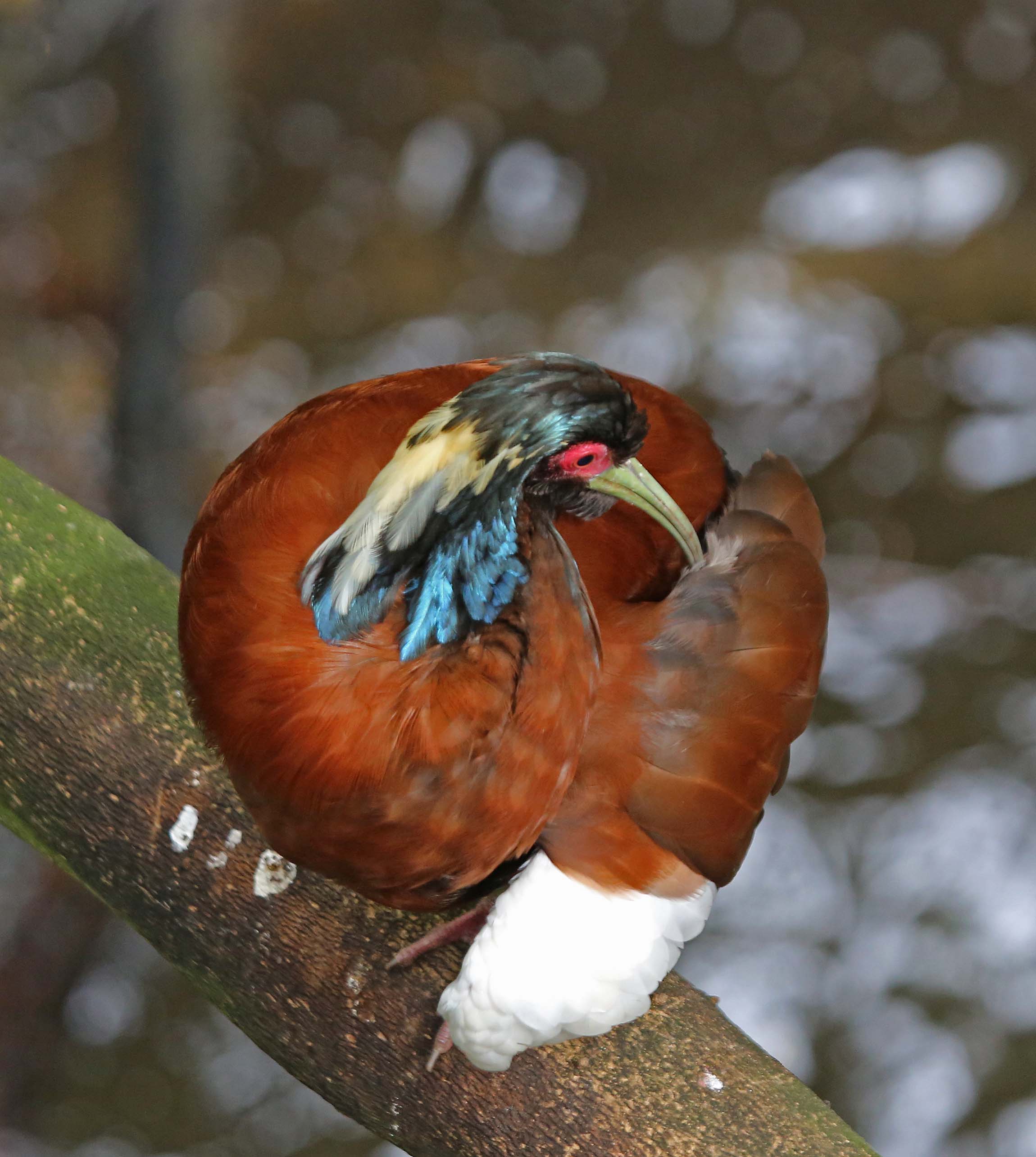 The Madagascar Crested Ibis is known by a few other names; the Madagascar Ibis, the White-winged Ibis and the Crested Wood Ibis. It is a medium-sized bird that is endemic to Madagascar. They have a reddish-brown body and their wings are partially white. Their feathers on their head and crest are white and an iridescent blue or green. Their bill is decurved, yellowish and thick at the base. Their legs and feet and the bare skin around their dark eyes are red.
