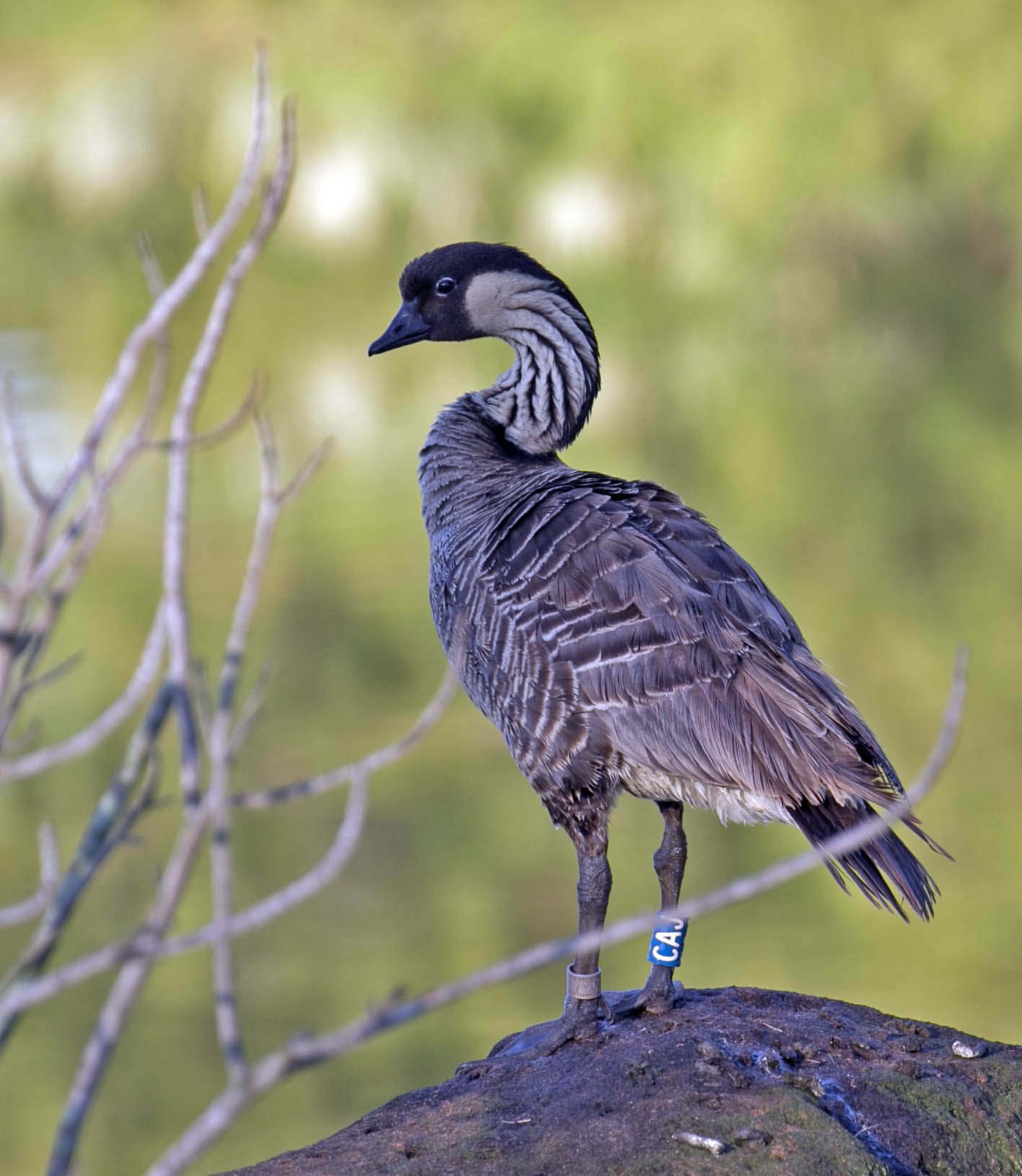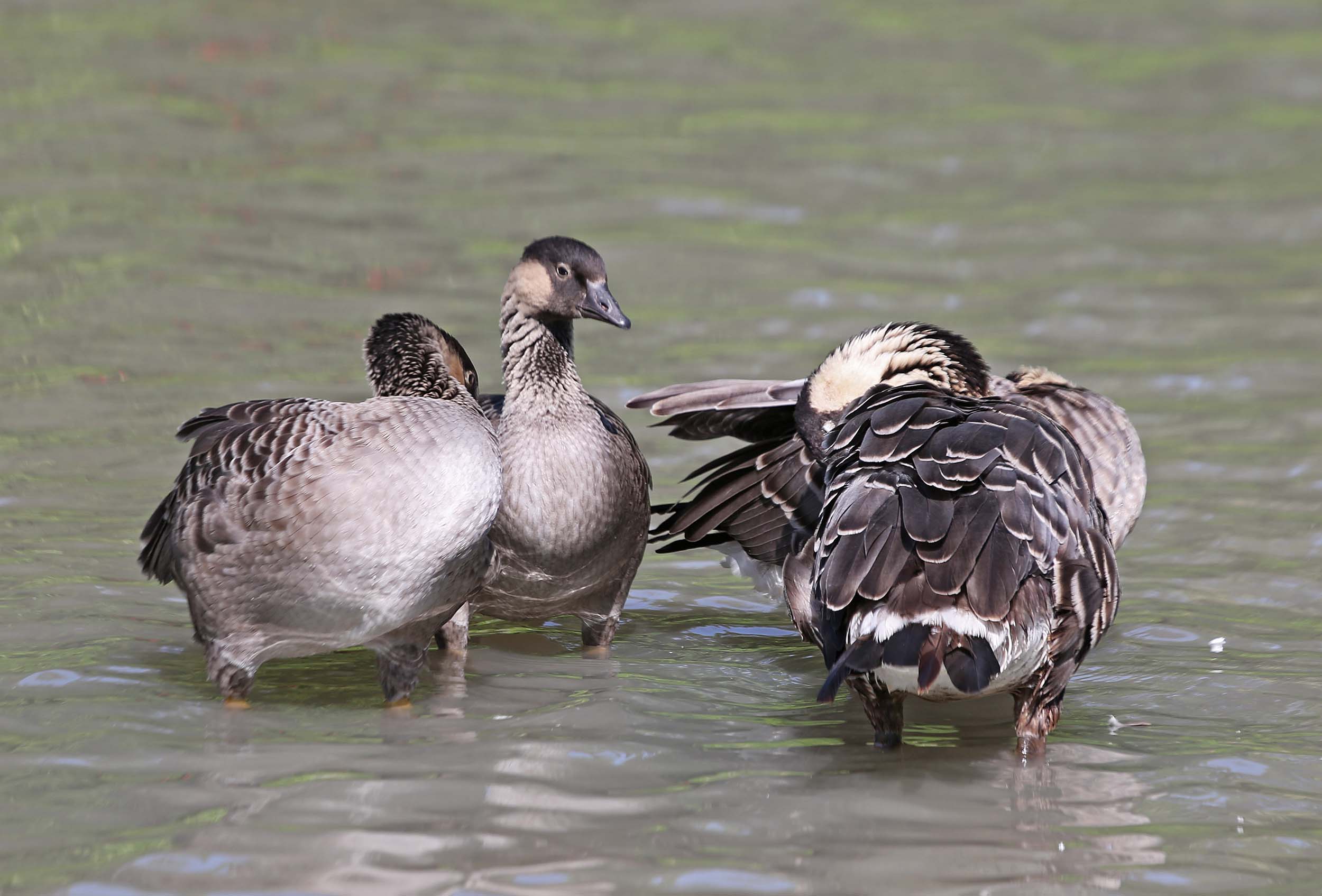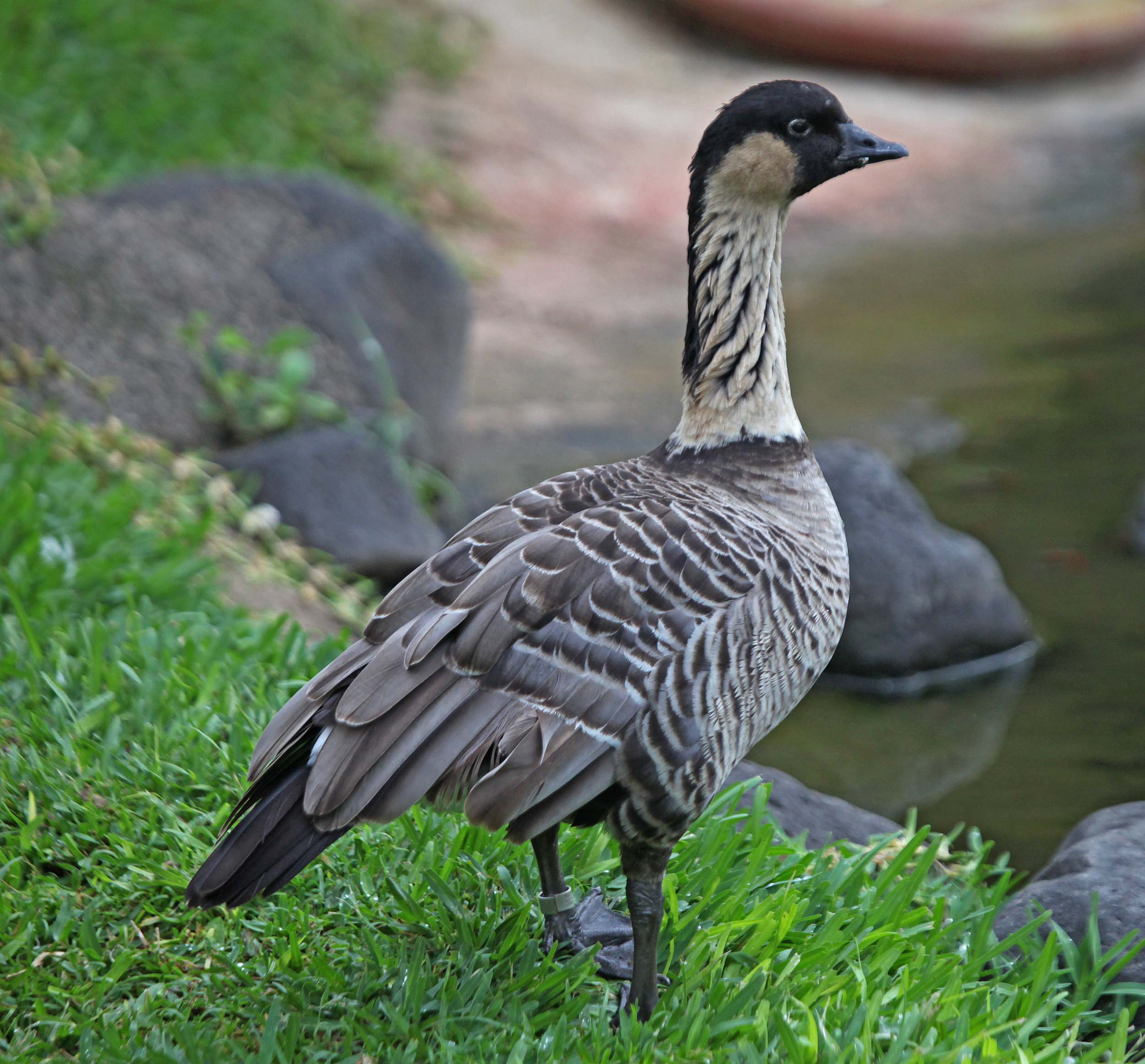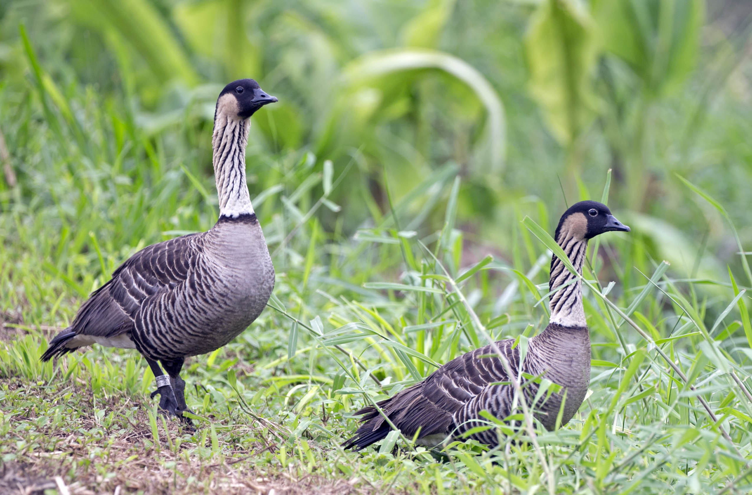 The Nene or Hawaiian Goose is endemic to the Hawaiian Islands and is the official state bird. It is found on Maui, Kaua'i and Hawai'i. They evolved from the Canada Goose which probably migrated to the Hawaiian islands 500,000 years ago. The Hawaiian Goose eats leaves, seeds, fruit and flowers of grasses and shrubs.