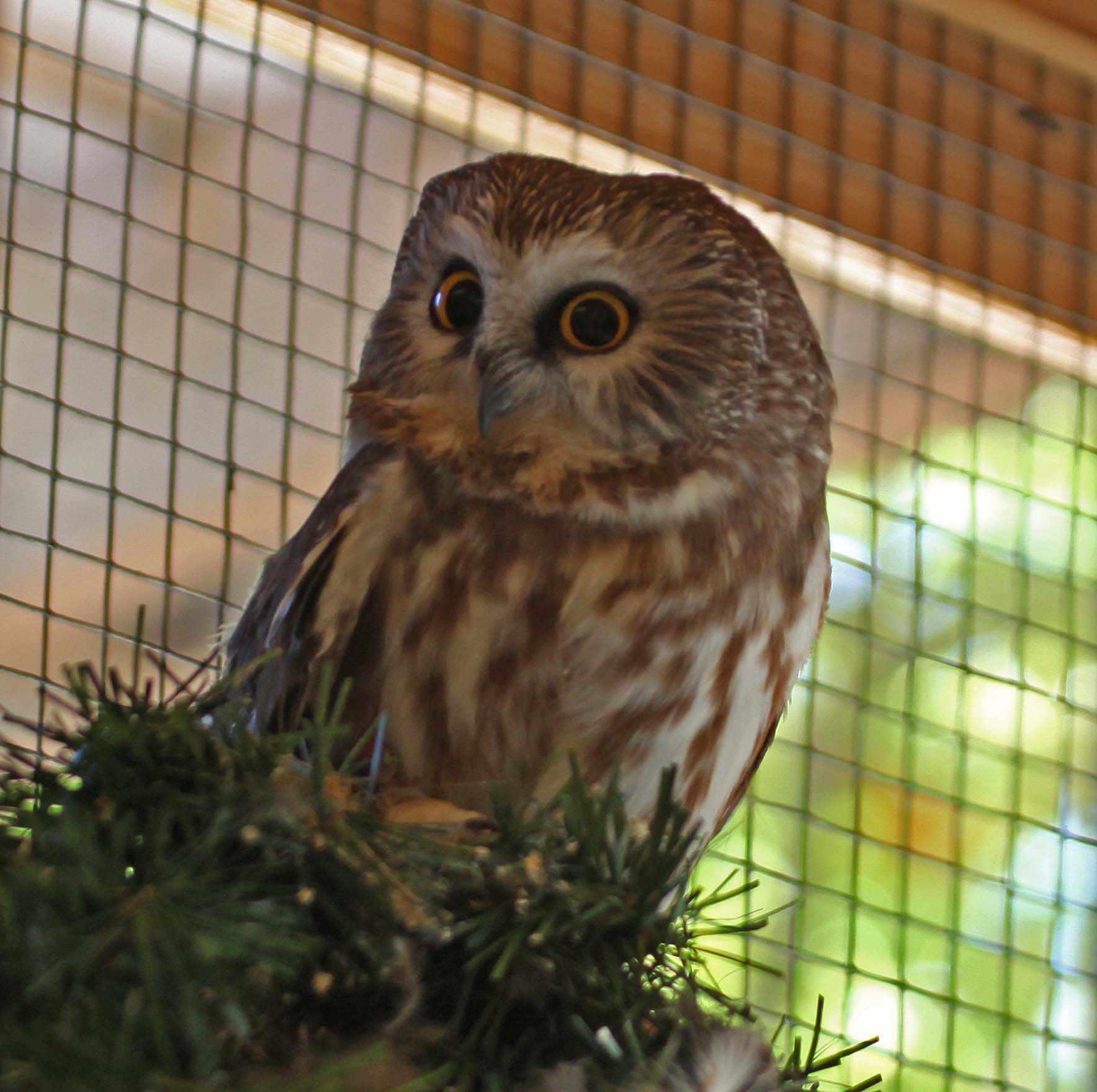 The Northern Saw-whet Owl is common owl in forested area in southern Canada and the U.S. It is one of the smallest owls in North America. They catch their prey at night by swooping down from their perch. They mainly eat small prey such as birds, mice, and sometimes chipmunks. They have excellent hearing and can see in the dark quite well.